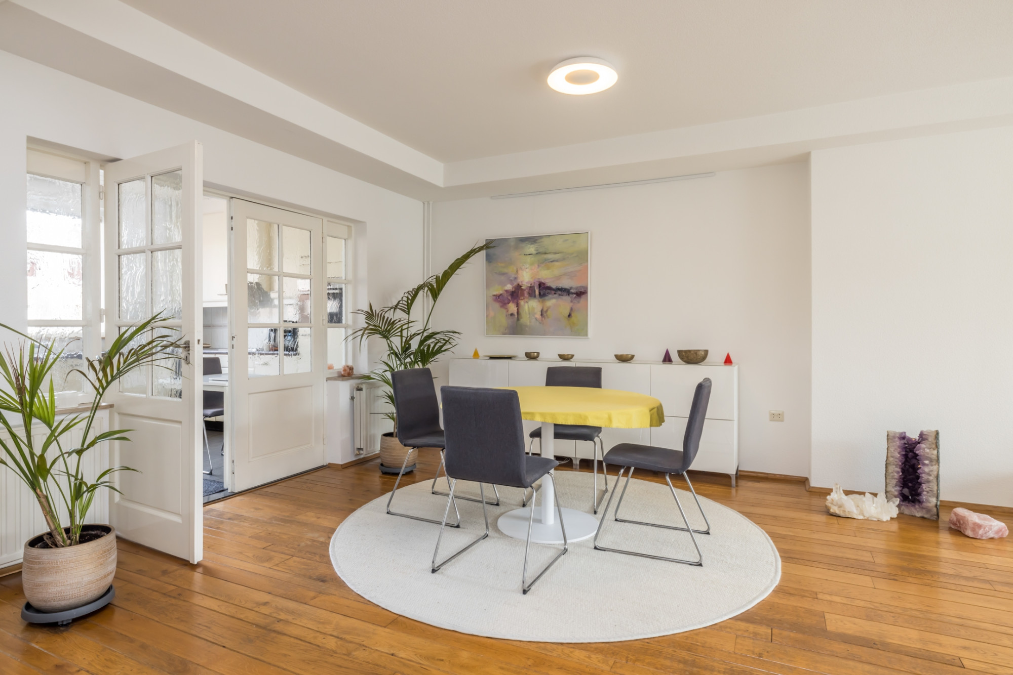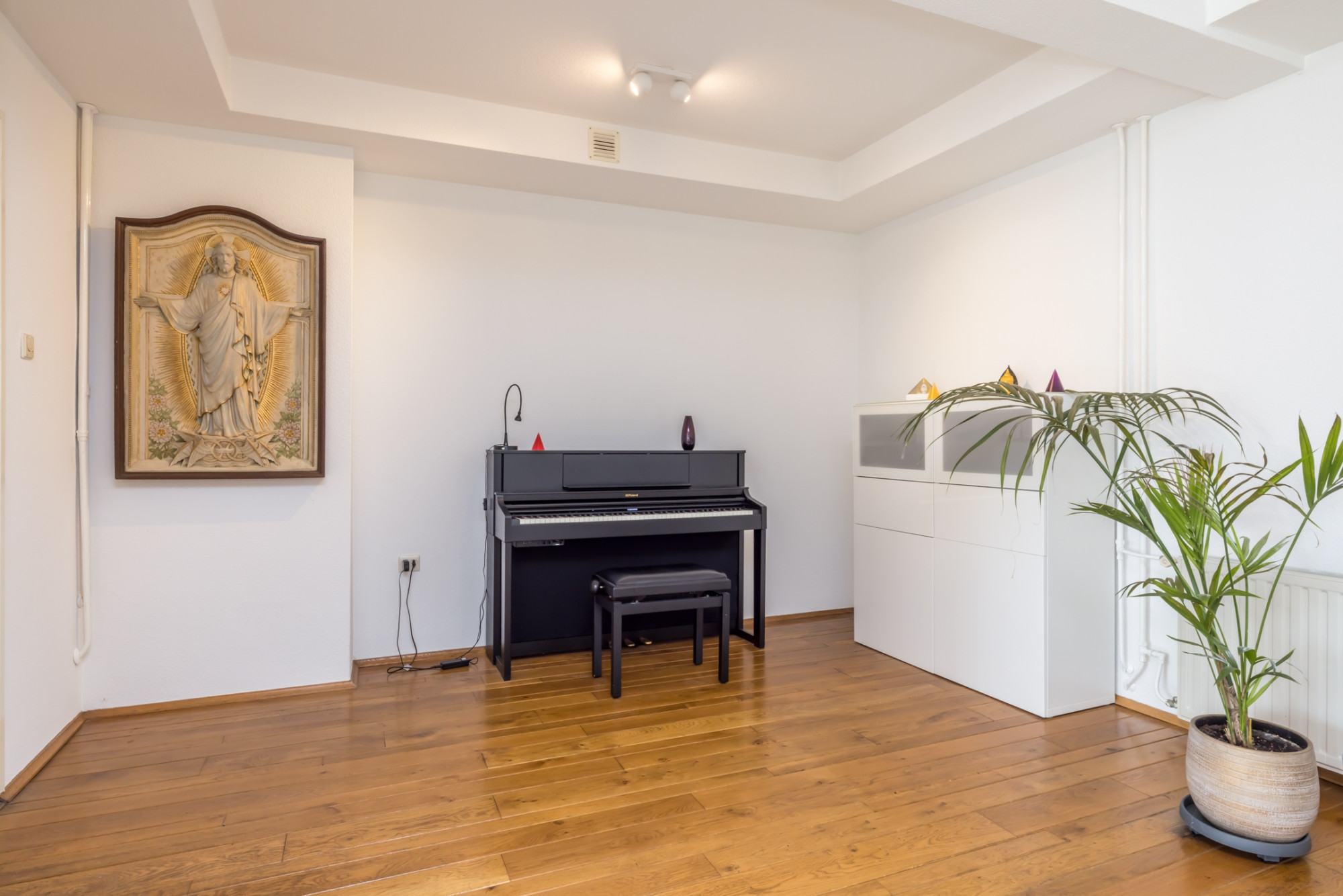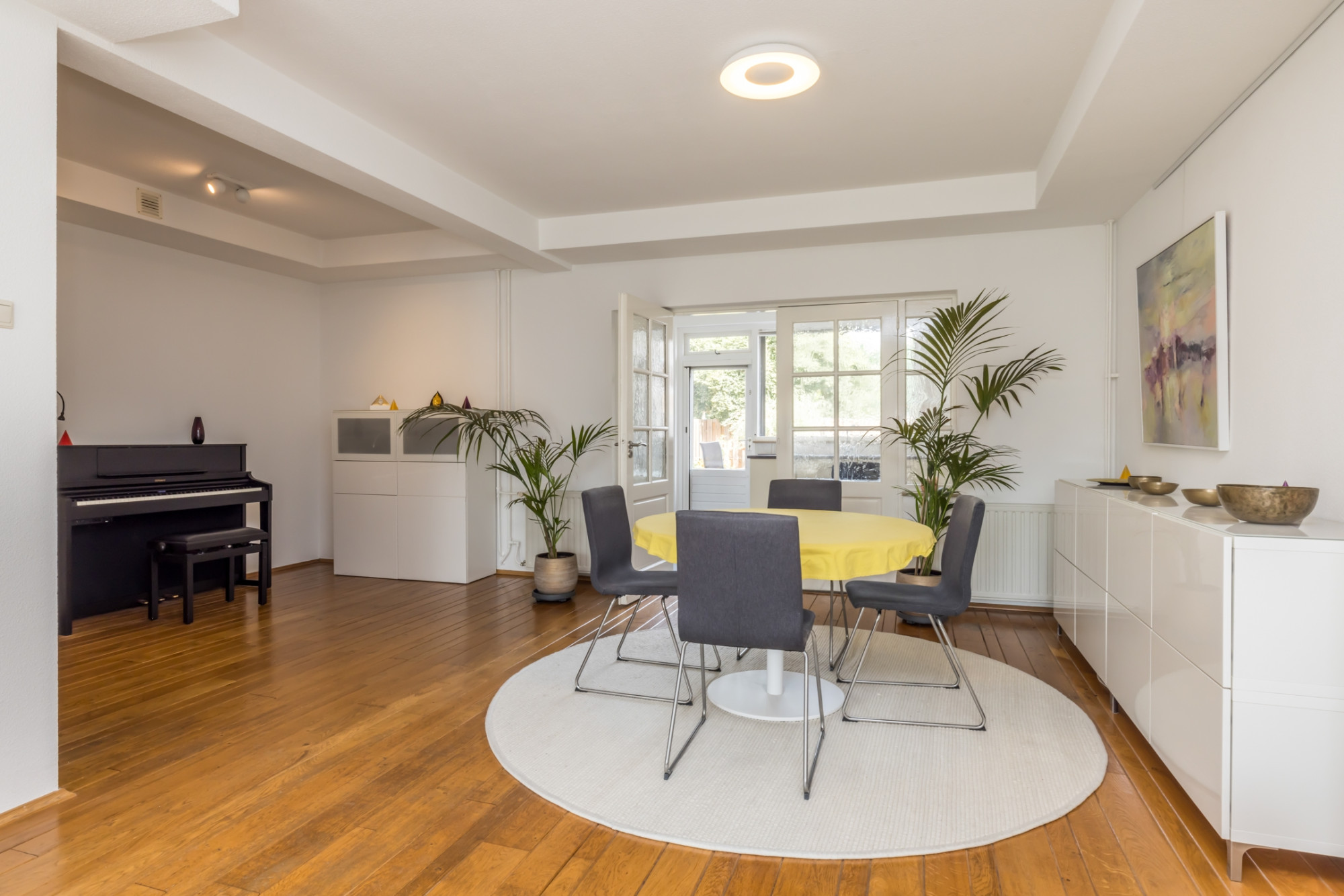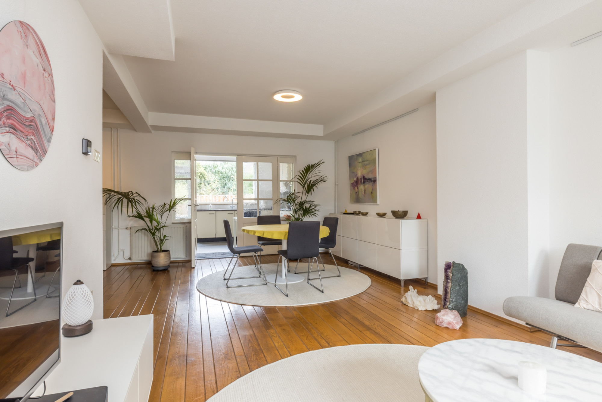 Sfeervolle woonkamer met veel lichtinval en parketvloer. Uitgebouwde keuken met L-vormige opstelling en de volgende apparatuur: inductiekookplaat, afzuigkap, koelkast, vaatwasser en oven. Bijkeuken met voldoende bergruimte en aansluitpunten voor de wasapparatuur.