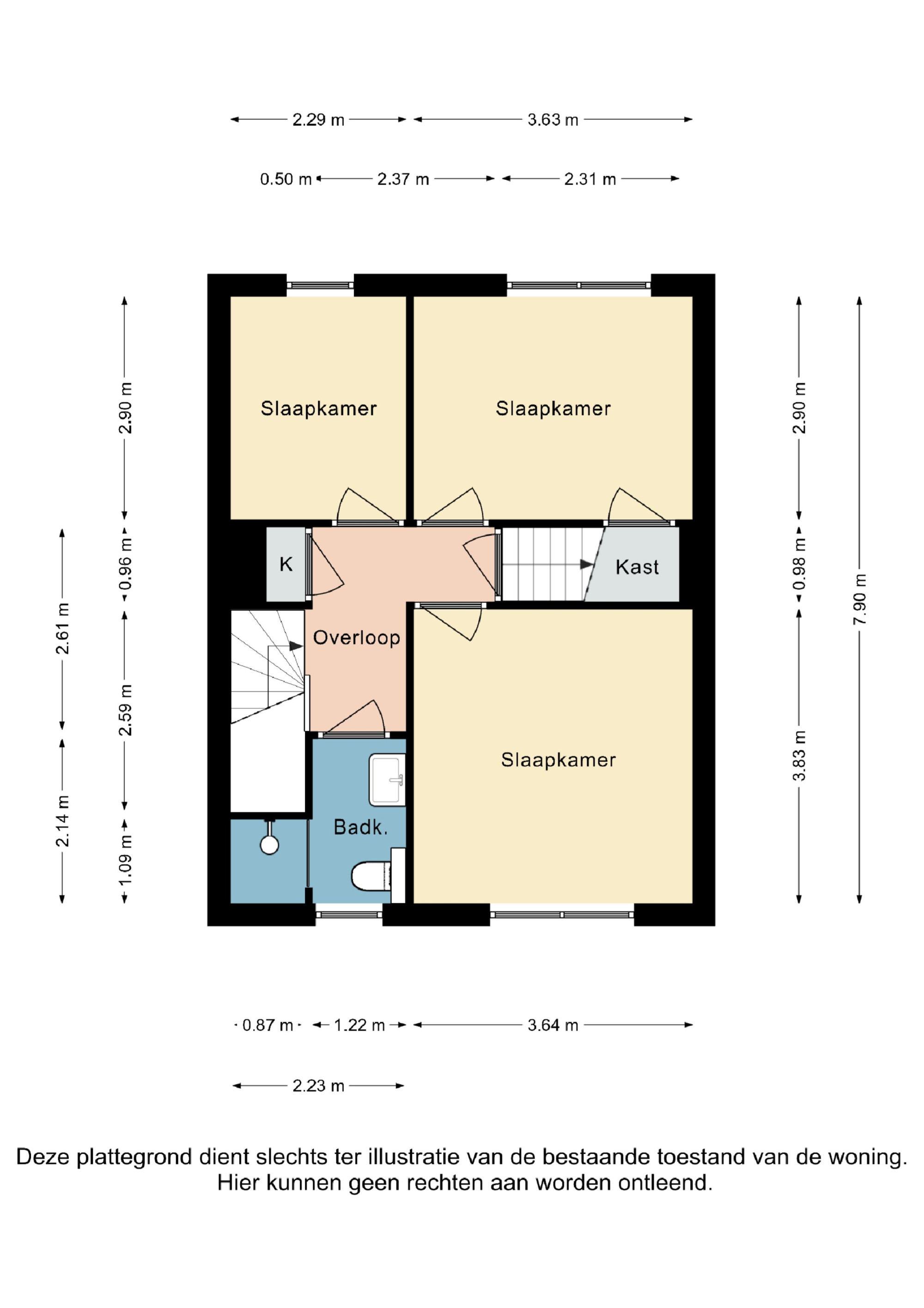 Overloop met toegang naar 3 slaapkamers en de badkamer. De slaapkamers zijn resp. groot: 13,9 m², 10,5 m² en 6,7 m².