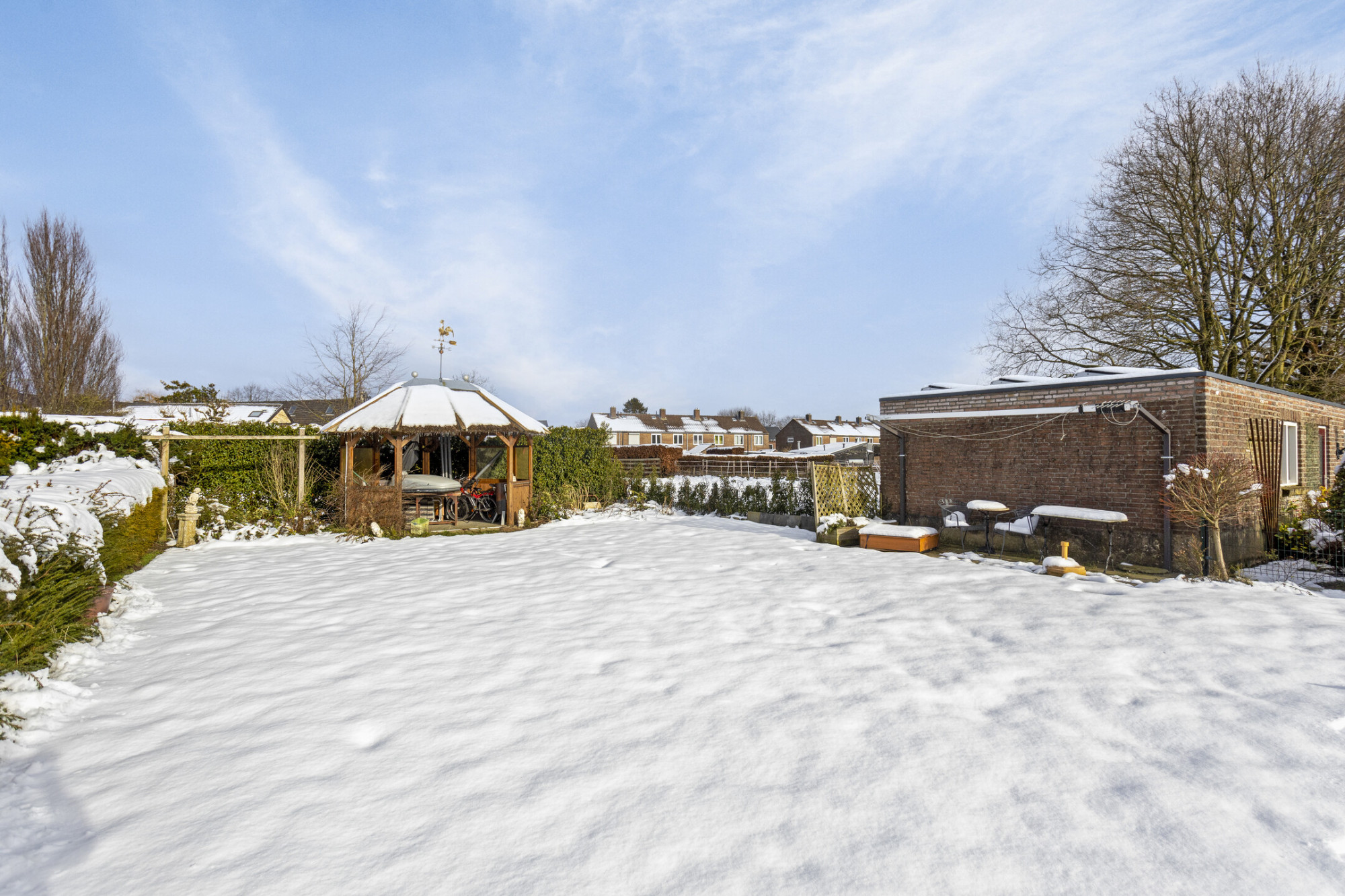 De tuin is circa 45 meter diep en is voorzien van terras (deels overkapt) een zonnescherm, gazon, diverse beplantingen en aan de achterkant van de tuin is er nog een prieeltje.
