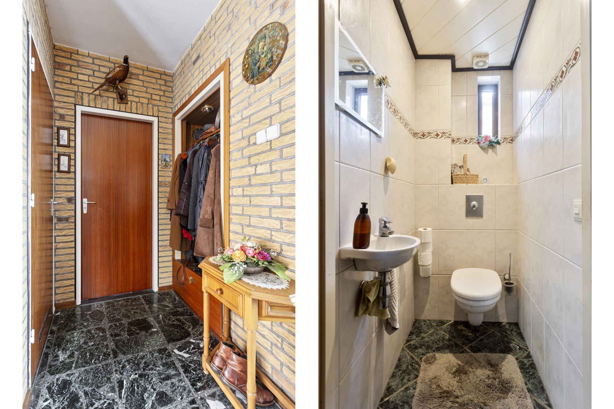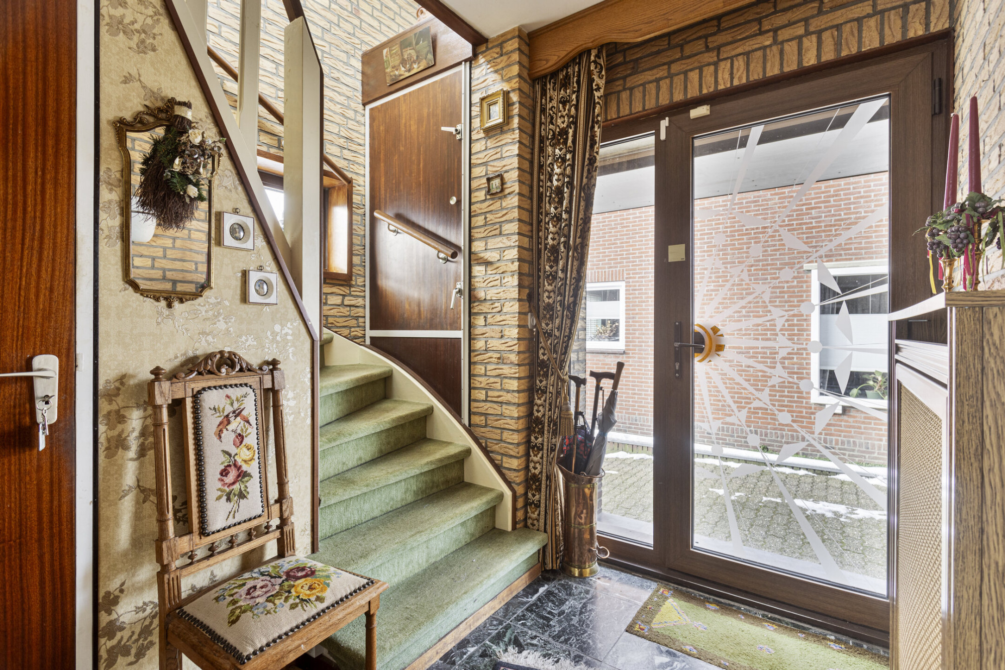 Voortuin. Royale oprit. Overdekte entree. Hal met originele tegelvloer, meterkast, verdiepingstrap en toiletruimte met hangend closet.