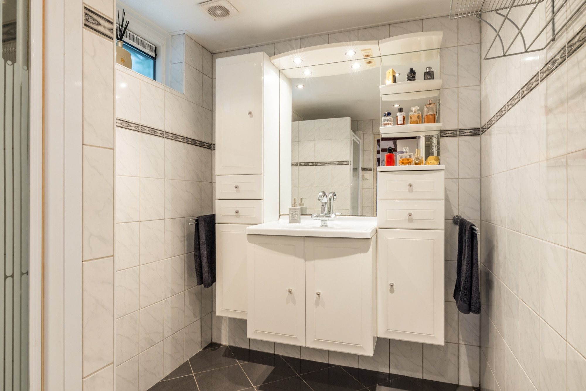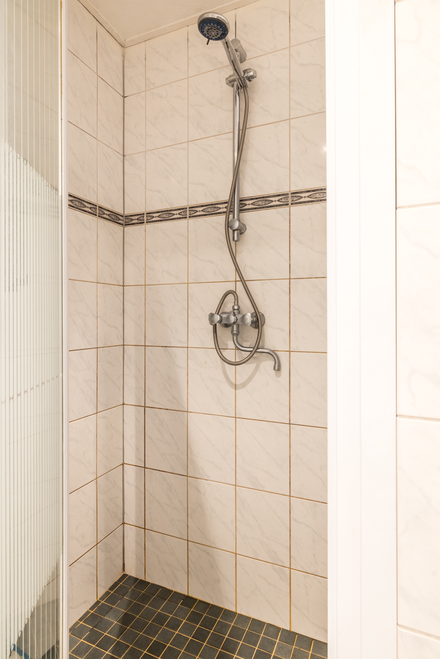 - Geheel betegelde badkamer op de begane grond voorzien van wastafelmeubel met een inloopdouche