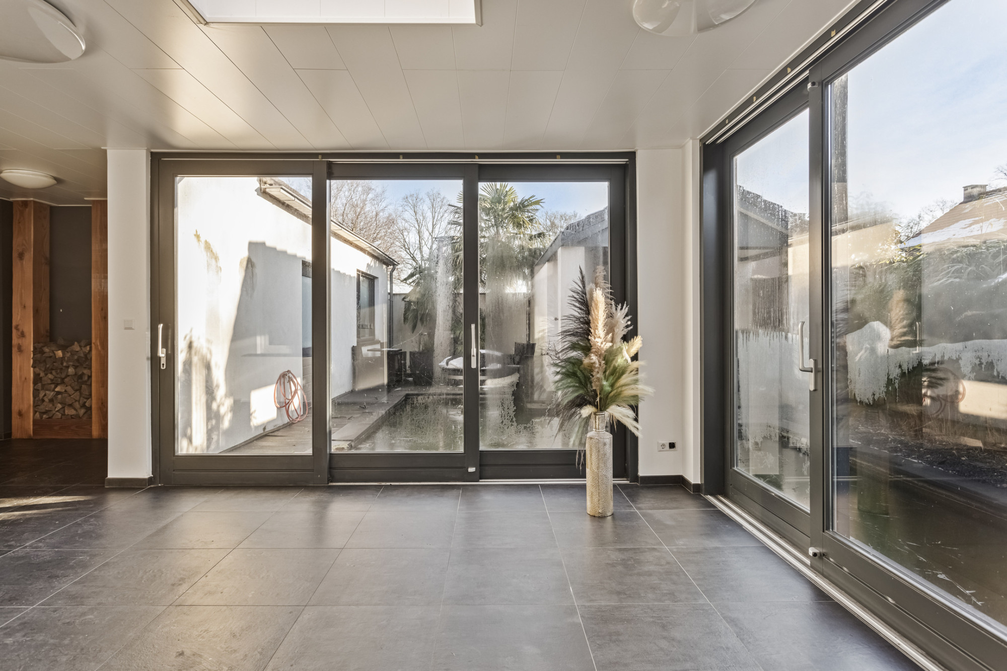 De woonkamer beschikt over tuindeuren aan de zijkant van de woning en een schuifpui aan de achterzijde naar de grote aangebouwde serre. Deze serre, met airco, heeft 2x schuifdeuren naar de achtertuin en toegang tot de grote garage ernaast.