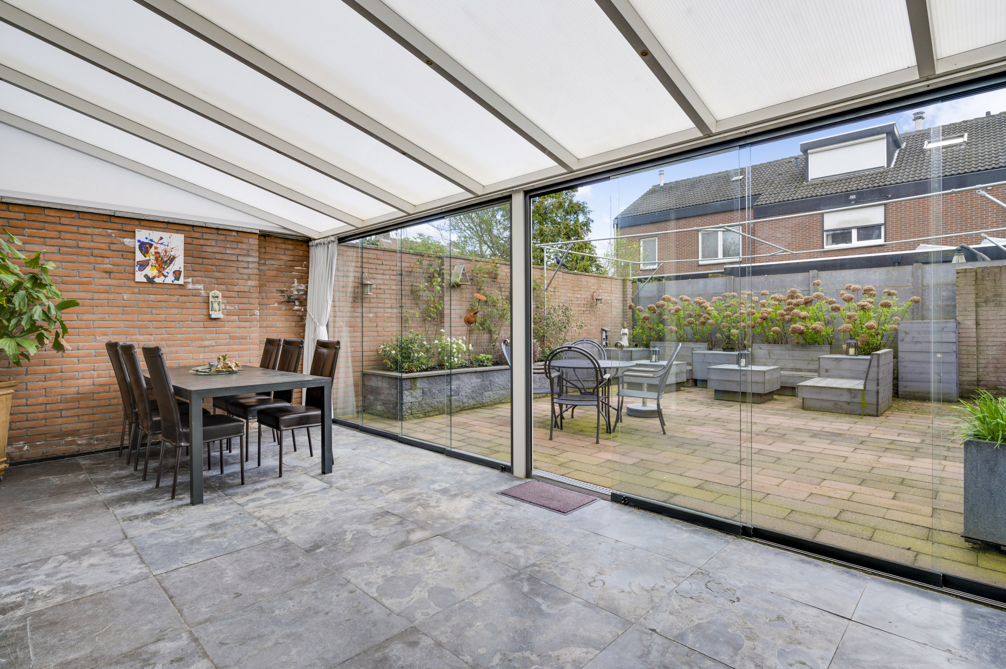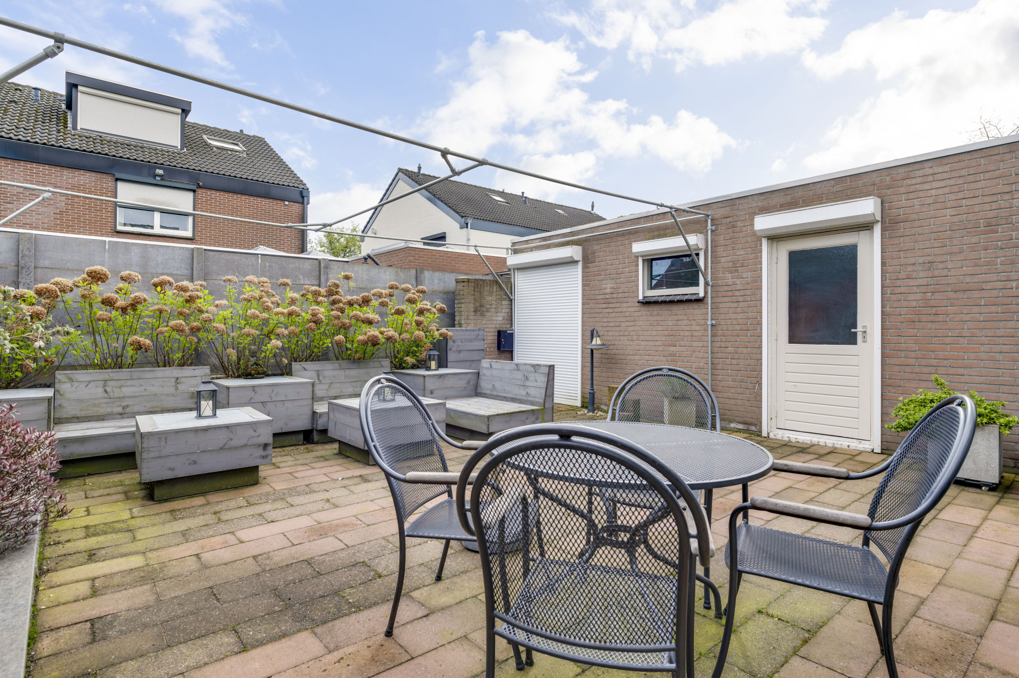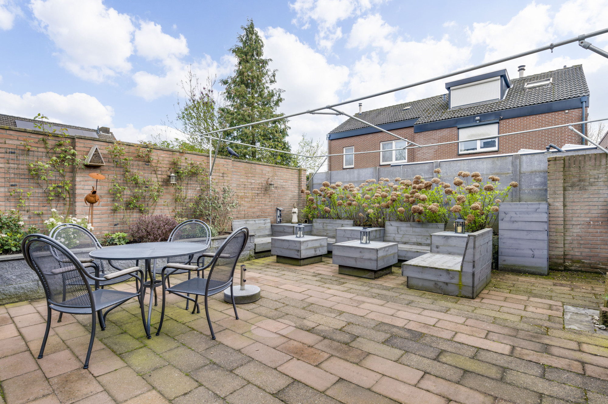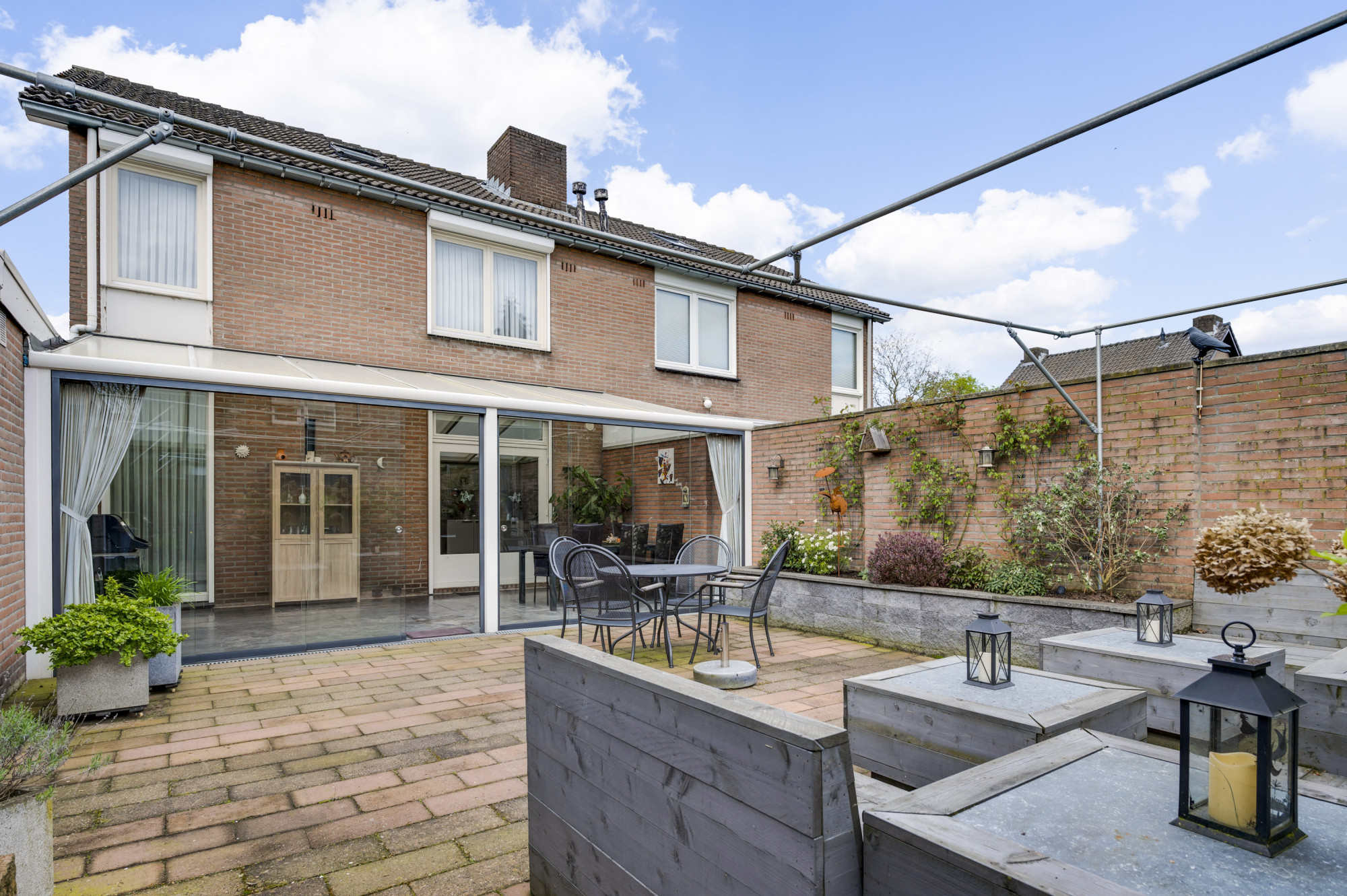 Er is een voortuin met oprit aanwezig die plaatst biedt aan 2 voertuigen en leidt naar de garage met voorliggende overkapping. De zonnige achtertuin is onderhoudsvriendelijk ingericht met bestrating en borders en vanuit hier zijn maar liefst 2 bergingen toegankelijk.