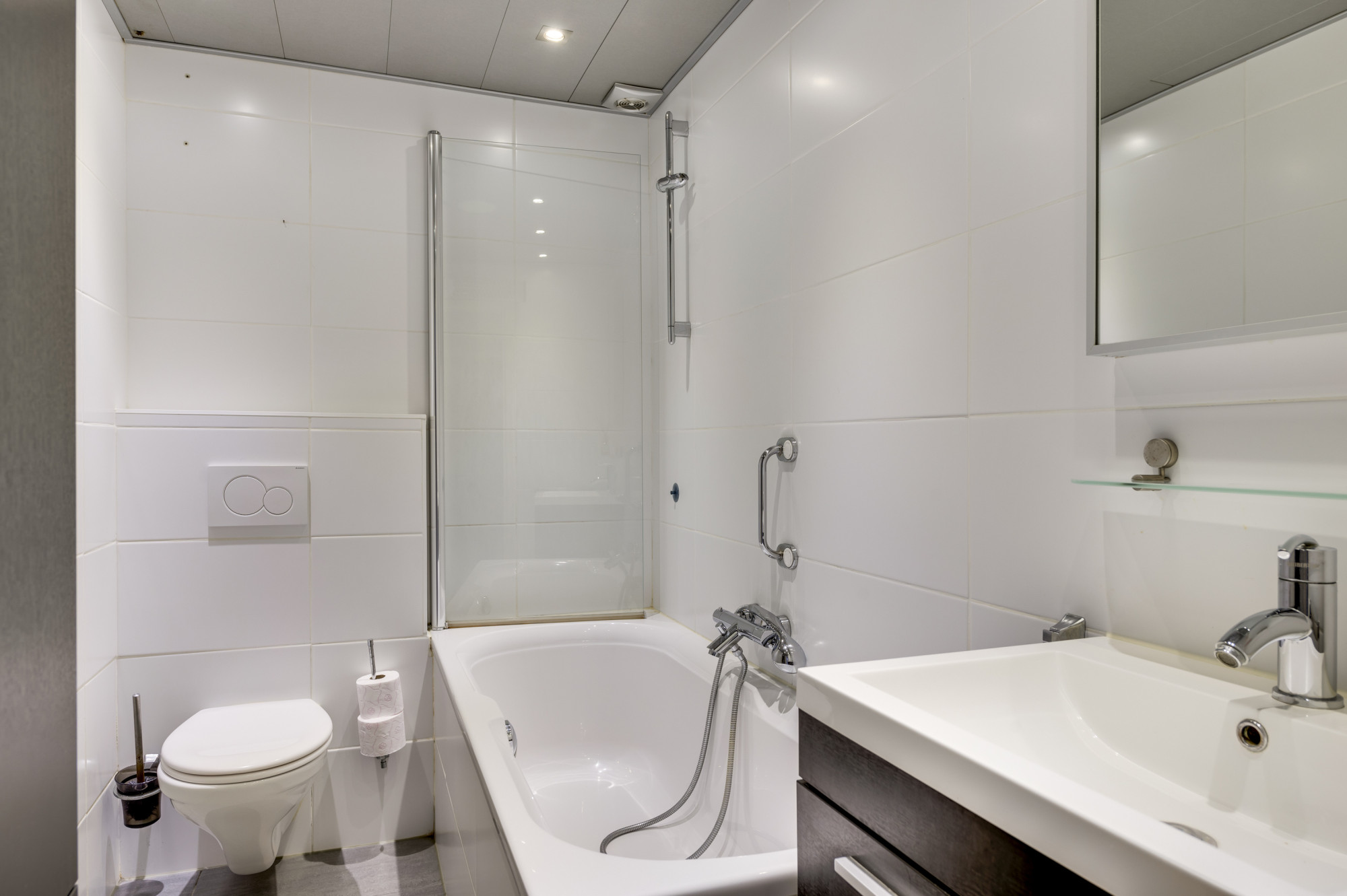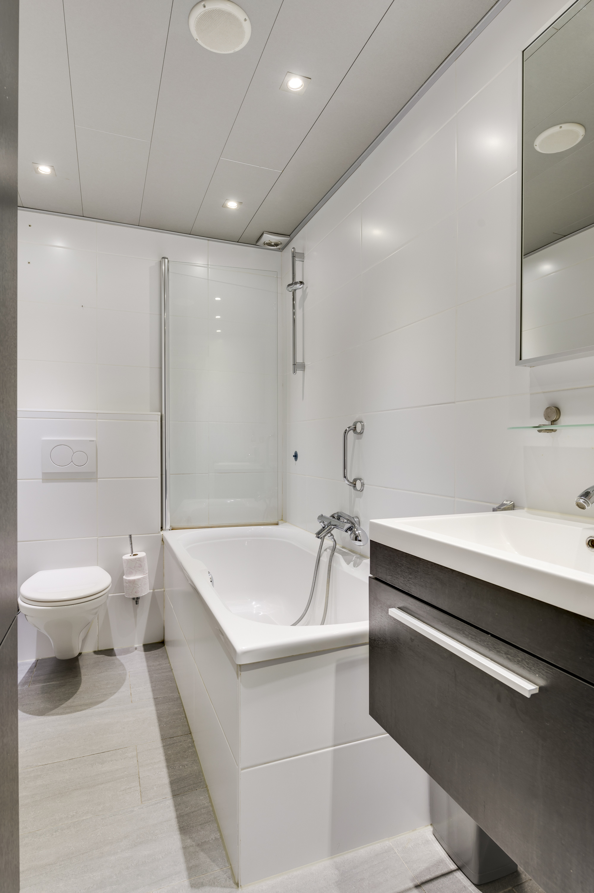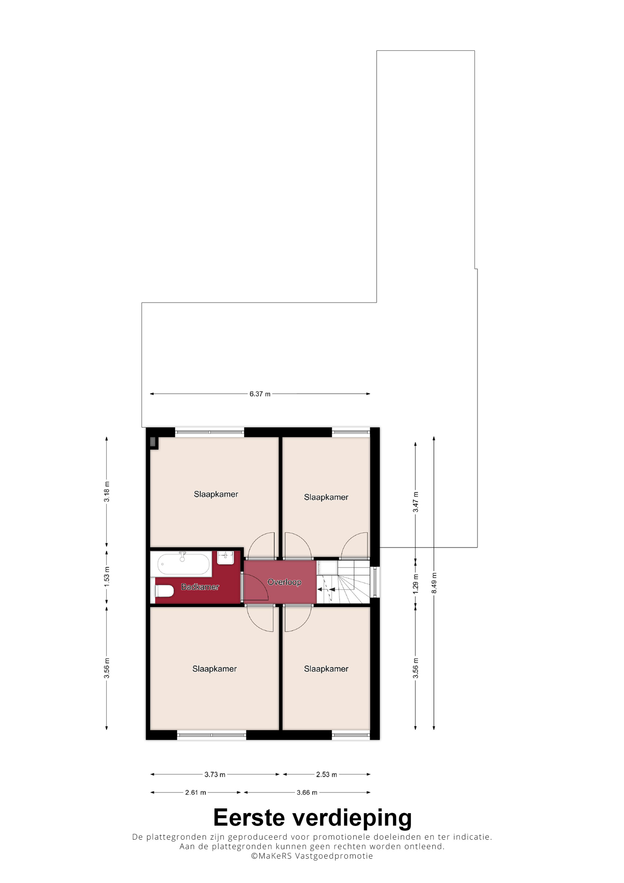 Vanuit de overloop zijn hier de eerste 4 slaapkamers alsmede de badkamer toegankelijk. De geheel betegelde badkamer is uitgerust met een ligbad-/douchecombinatie, toilet en wastafel met meubel, alsmede nog een kast voor badkamerartikelen. De eerste verdieping is met uitzondering van de badkamer voorzien van een laminaatvloer.