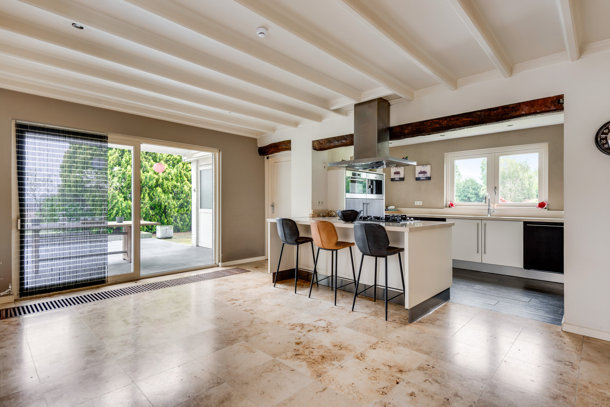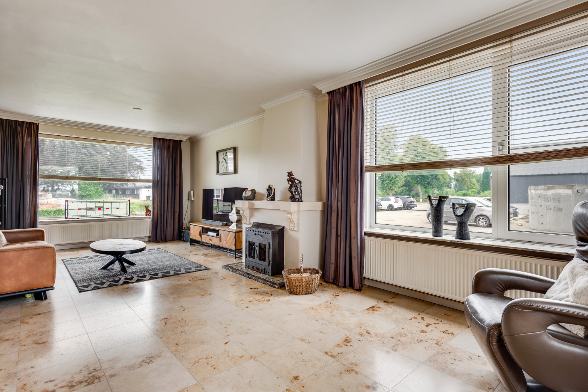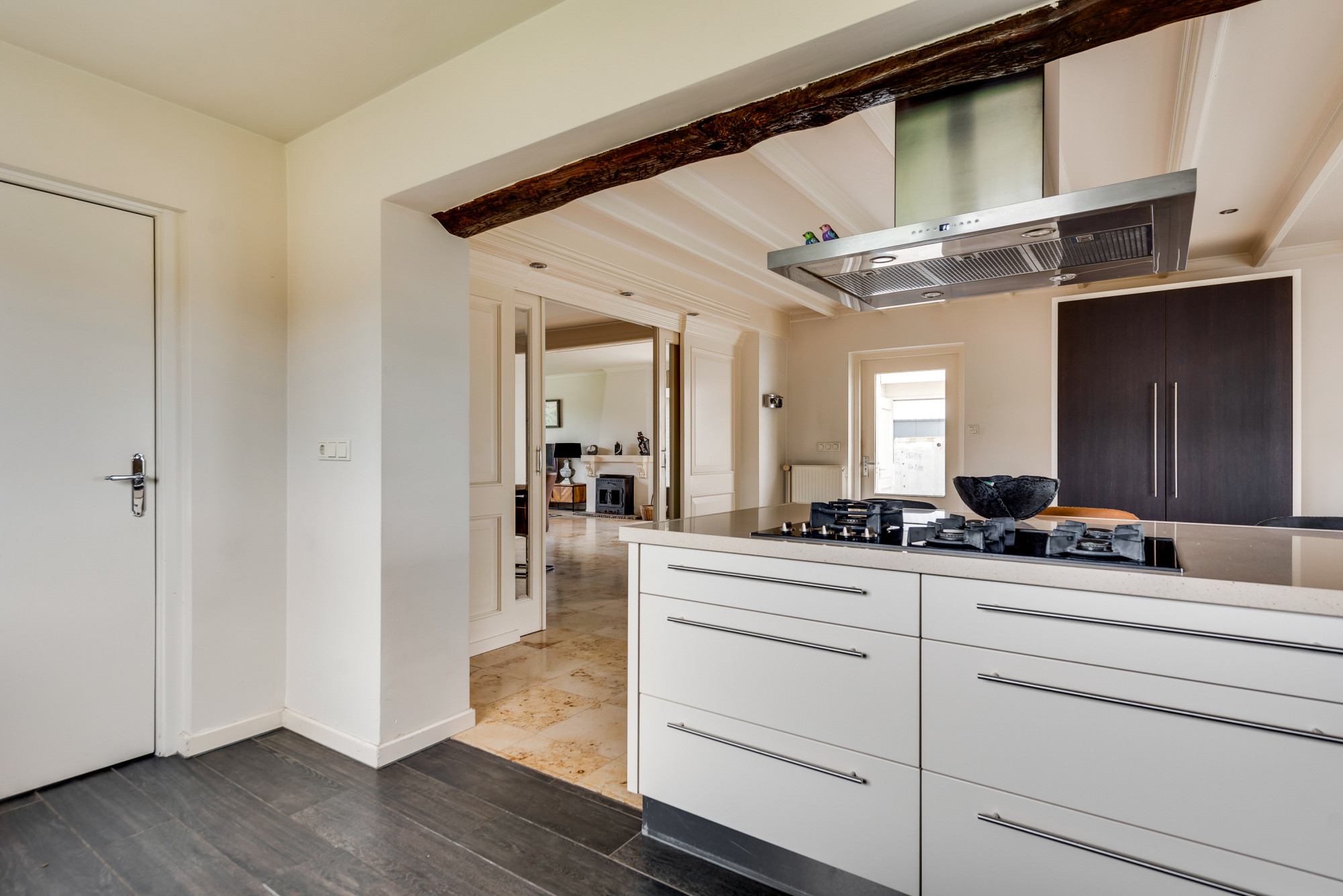 Bij binnenkomst via de overdekte entree betreedt u de ruime hal met meterkast en trapopgang naar de eerste verdieping. Vanuit de hal heeft u toegang tot de royale woonkamer en de gelijkvloerse 1e slaap/hobbykamer, momenteel in gebruik als kantoor. De woonkamer straalt sfeer uit met een fraaie schouw met houtkachel, en biedt een mooi uitzicht op de achtertuin. De tegelvloer zorgt voor een strakke afwerking. De ruime woonkeuken is via schuifdeuren te bereiken en beschikt over een combinatie met kook/schiereiland en moderne inbouwapparatuur, waaronder een gasfornuis, afzuigkap, combi-oven, koelkast, vriezer, Quooker kraan, koffiezetapparaat en een vaatwasser. Aangrenzend bevindt zich een praktische bijkeuken met een aanrechtblad, wasbak, witgoedaansluitingen en de opstelling van de cv-combiketel (Nefit Topline HR, eigendom, ca. 2012). Vanuit de keuken heeft u zowel via een loopdeur als een schuifdeur toegang tot de achtertuin. De gelijkvloerse 1e badkamer, eveneens toegankelijk vanuit de keuken, is uitgerust met een douche, toilet, urinoir en wastafelmeubel, beschikt over vloerverwarming en biedt ook toegang tot de achtertuin.