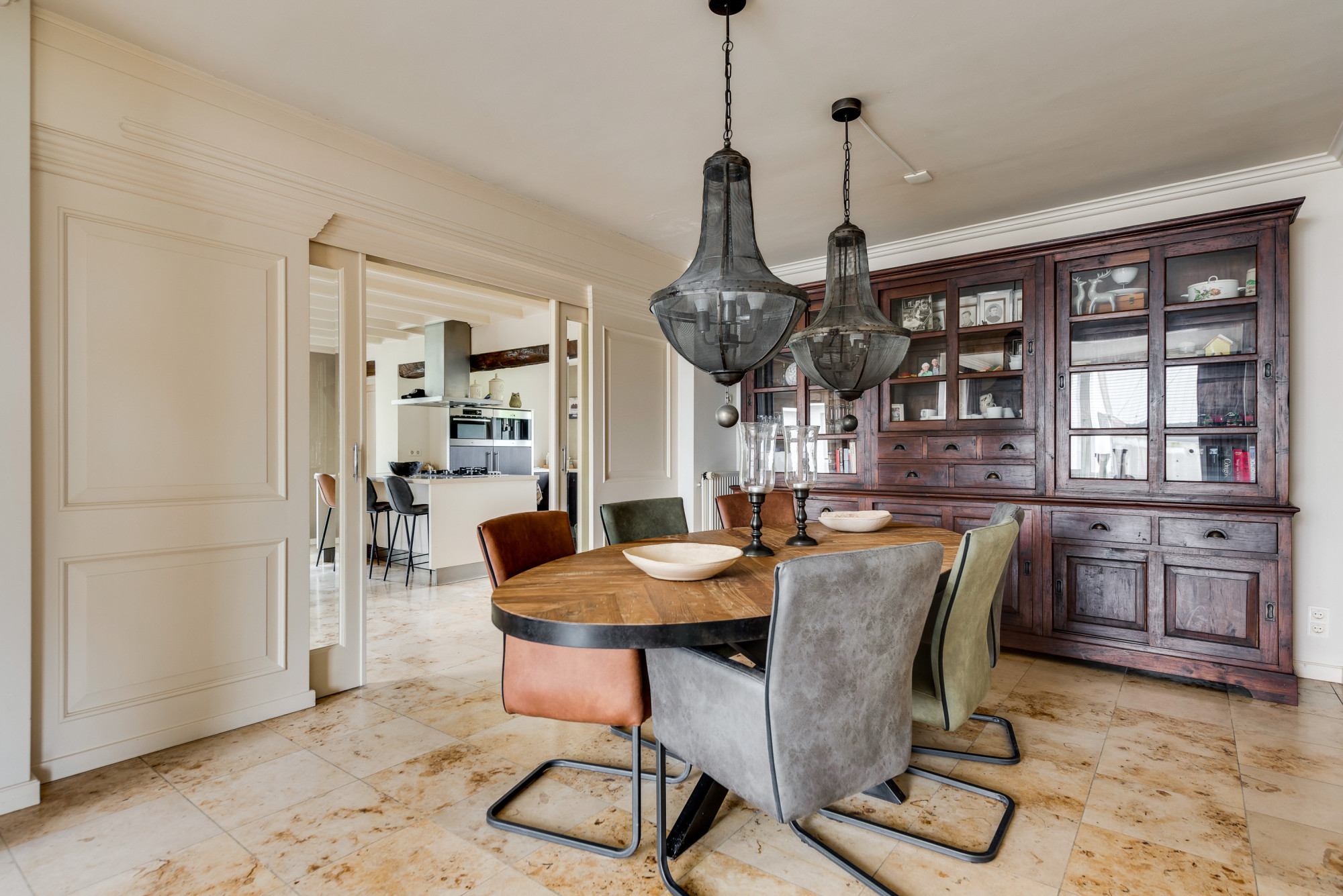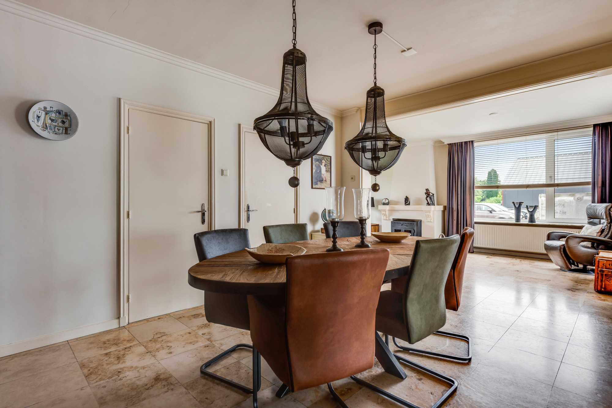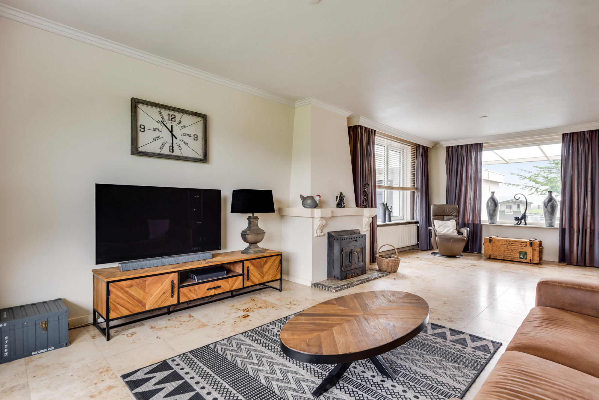 Bij binnenkomst via de overdekte entree betreedt u de ruime hal met meterkast en trapopgang naar de eerste verdieping. Vanuit de hal heeft u toegang tot de royale woonkamer en de gelijkvloerse 1e slaap/hobbykamer, momenteel in gebruik als kantoor. De woonkamer straalt sfeer uit met een fraaie schouw met houtkachel, en biedt een mooi uitzicht op de achtertuin. De tegelvloer zorgt voor een strakke afwerking. De ruime woonkeuken is via schuifdeuren te bereiken en beschikt over een combinatie met kook/schiereiland en moderne inbouwapparatuur, waaronder een gasfornuis, afzuigkap, combi-oven, koelkast, vriezer, Quooker kraan, koffiezetapparaat en een vaatwasser. Aangrenzend bevindt zich een praktische bijkeuken met een aanrechtblad, wasbak, witgoedaansluitingen en de opstelling van de cv-combiketel (Nefit Topline HR, eigendom, ca. 2012). Vanuit de keuken heeft u zowel via een loopdeur als een schuifdeur toegang tot de achtertuin. De gelijkvloerse 1e badkamer, eveneens toegankelijk vanuit de keuken, is uitgerust met een douche, toilet, urinoir en wastafelmeubel, beschikt over vloerverwarming en biedt ook toegang tot de achtertuin.