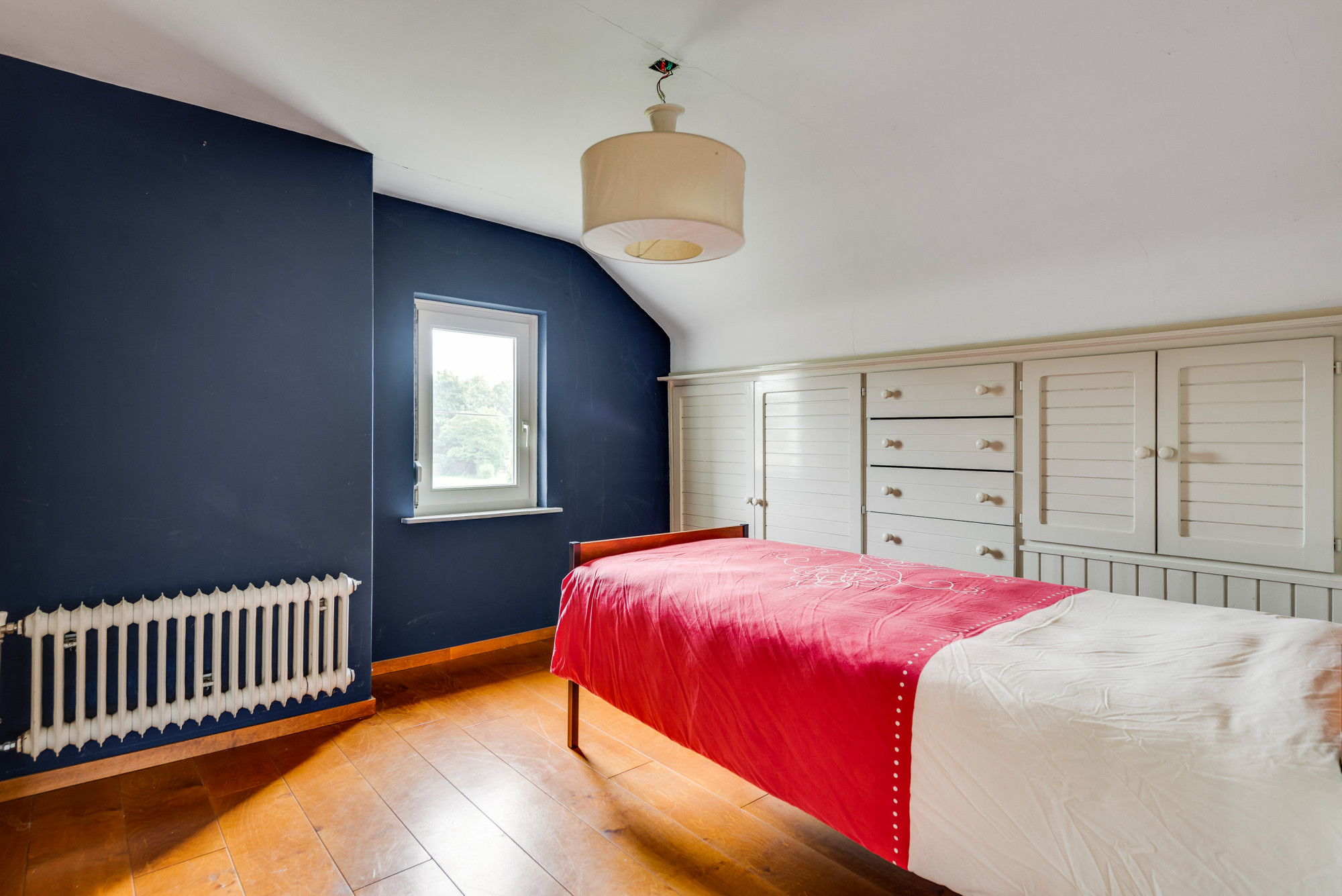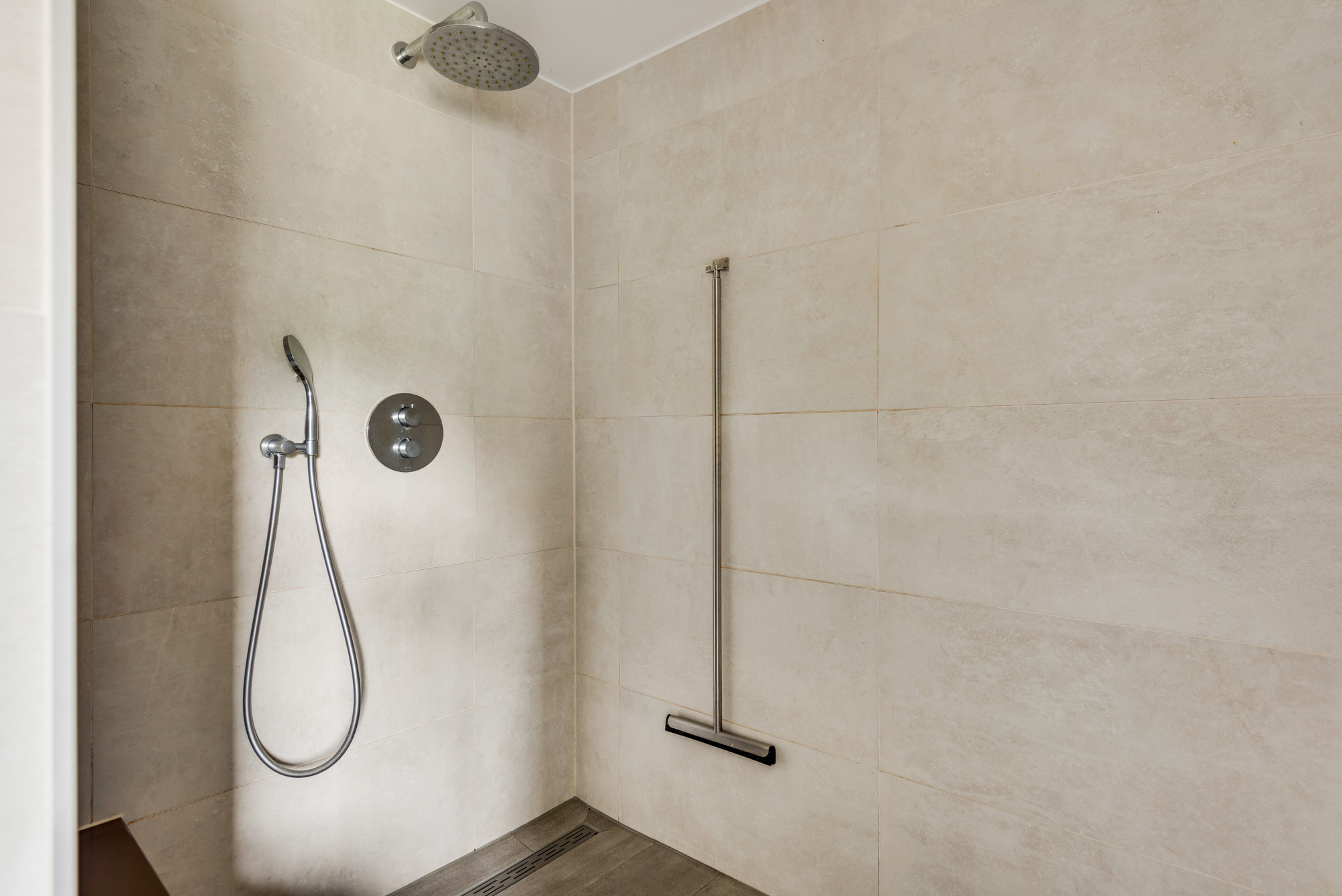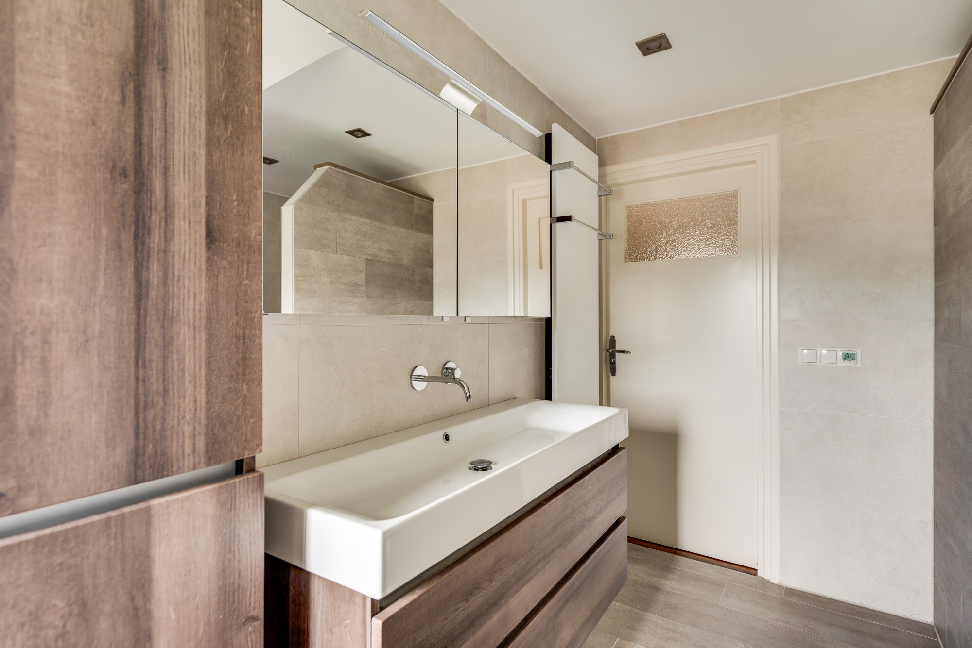 De overloop met bergruimte leidt naar nog vier slaapkamers en een moderne 2e badkamer. Deze is volledig betegeld en voorzien van een inloopdouche, toilet, urinoir, wastafelmeubel en elektrische vloerverwarming. Drie van de slaapkamers zijn uitgerust met handige kastenwanden.