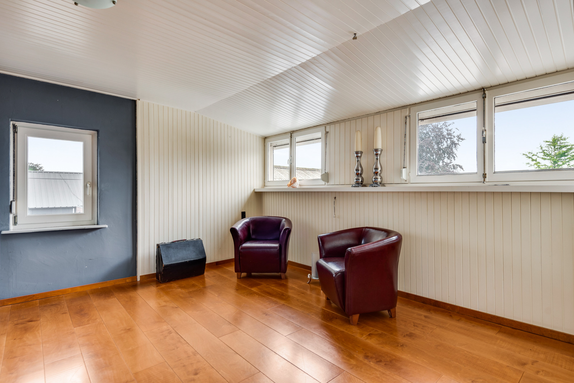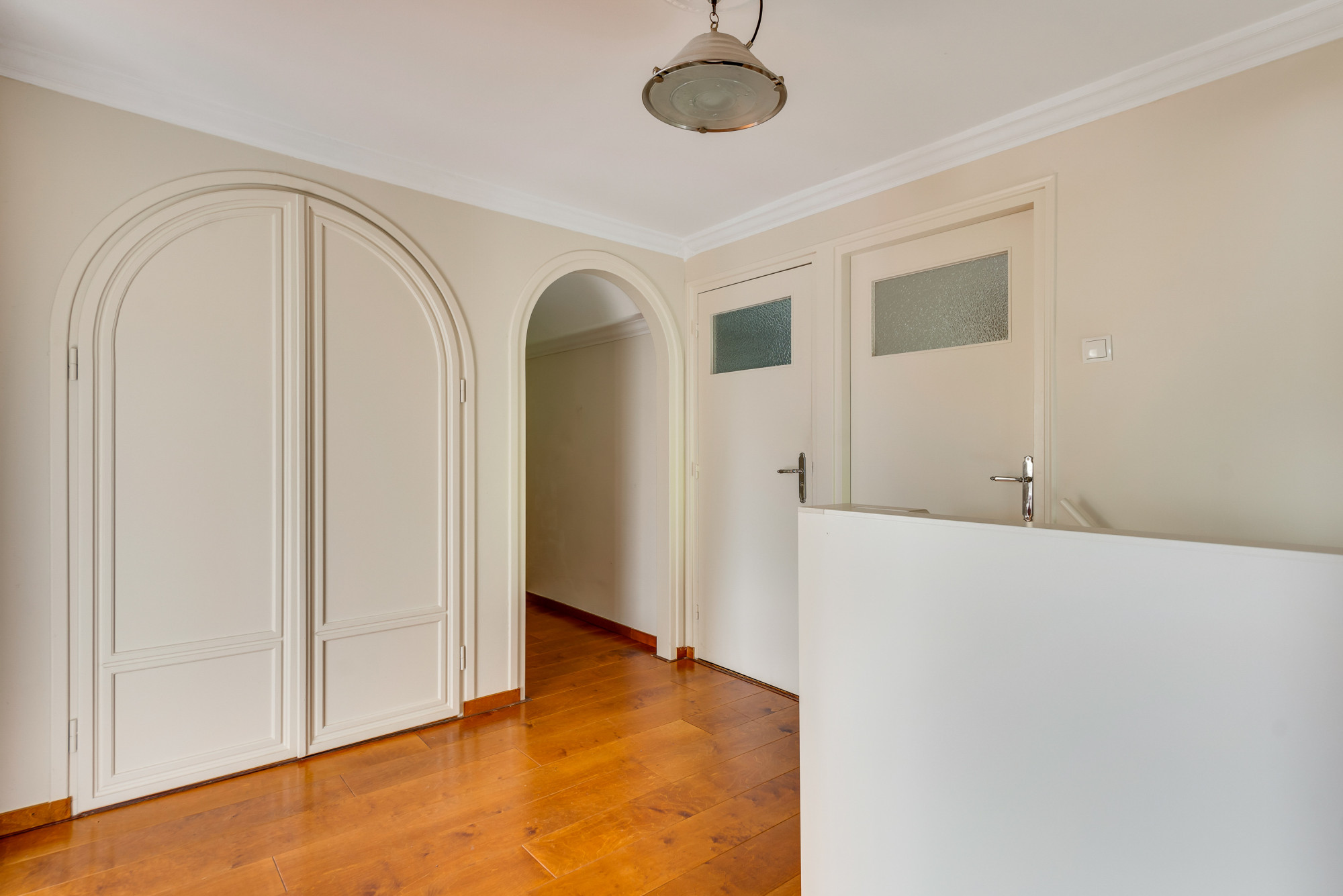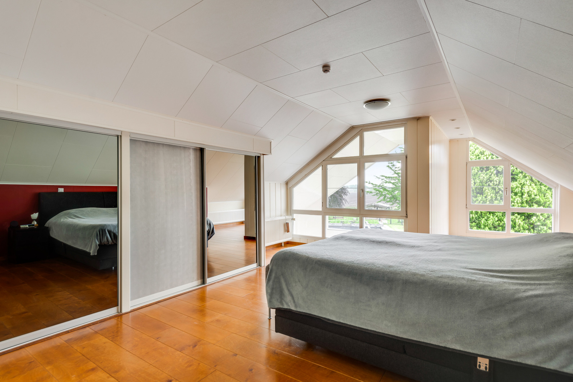 De overloop met bergruimte leidt naar nog vier slaapkamers en een moderne 2e badkamer. Deze is volledig betegeld en voorzien van een inloopdouche, toilet, urinoir, wastafelmeubel en elektrische vloerverwarming. Drie van de slaapkamers zijn uitgerust met handige kastenwanden.