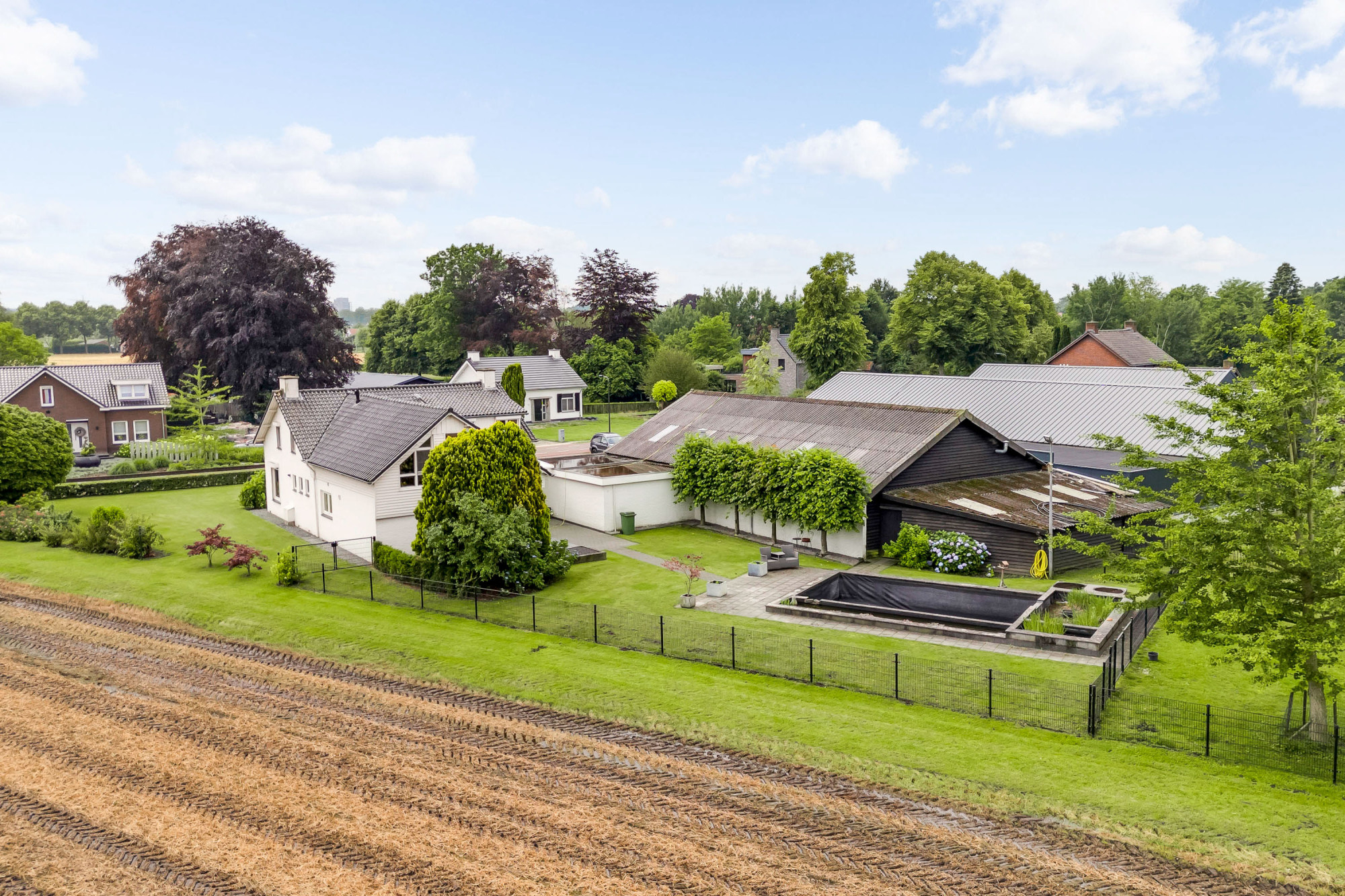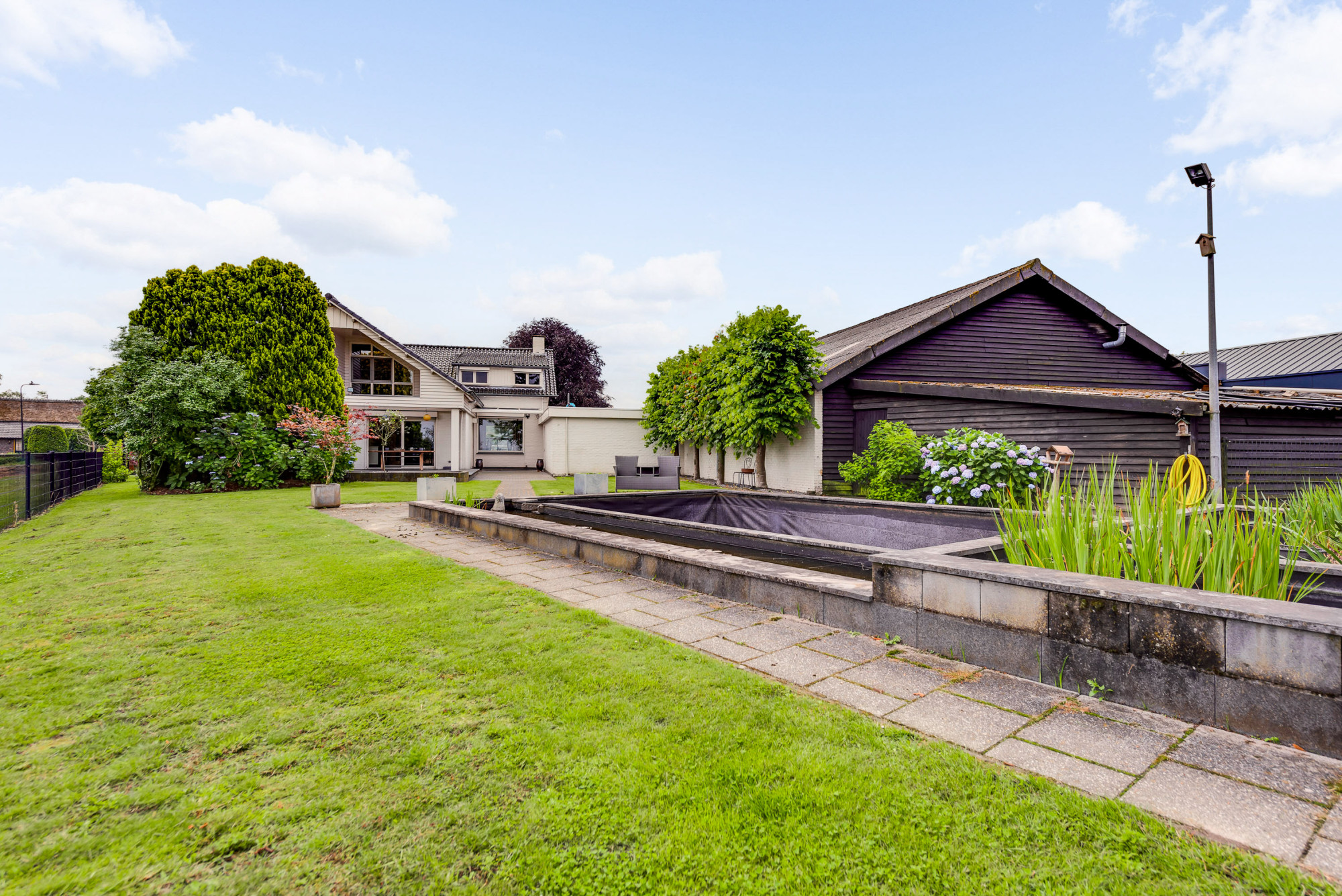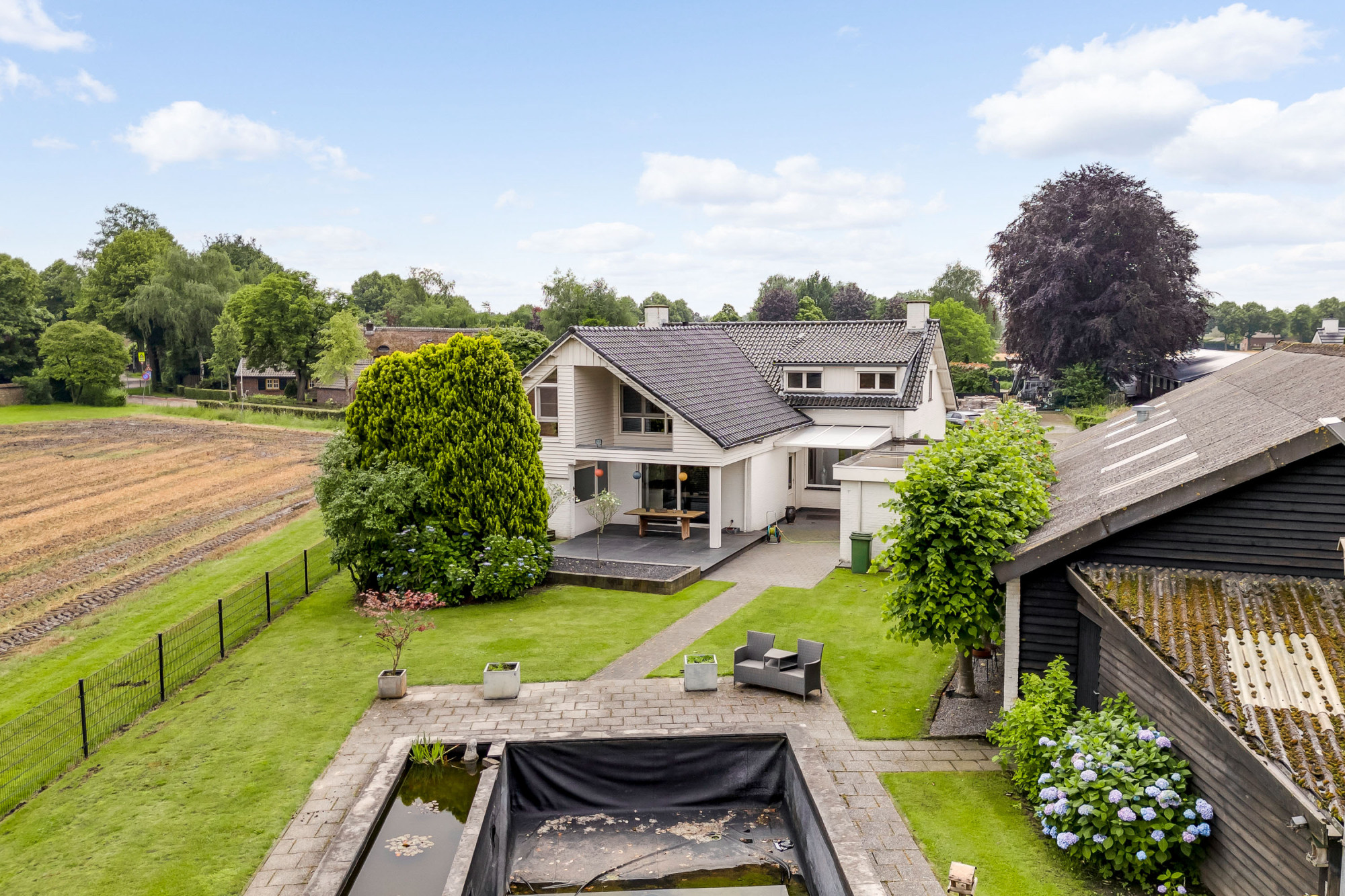 Aan de voorzijde van de woning vindt u een voortuin en bestrating met voldoende parkeerruimte en toegang tot de garage met elektrische poort en de achtertuin. De achtertuin biedt weids uitzicht over de landerijen en beschikt o.a. over gazon, een weitje, diverse aanplant, meerdere overkappingen en een (zwem)vijver (voormalig zwembad; deze is weer na enige aanpassingen ook als zwembad weer te gebruiken). Verder is er nog een riante schuur en een houten tuinhuis/dierenverblijf aanwezig. Indien gewenst is, in combinatie met de woning, een aangrenzend bijgebouw (loods) met voorterrein ook te koop (of te huur in combinatie met aankoop woning) van maar liefst ca. 224 m2 (niet in huidige vraagprijs inbegrepen). Deze multifunctionele ruimte heeft een hoge nok en een inpandige, eenvoudige kantoorruimte met kitchenette, is verwarmd en biedt eigen aansluitingen voor gas, water en elektra.