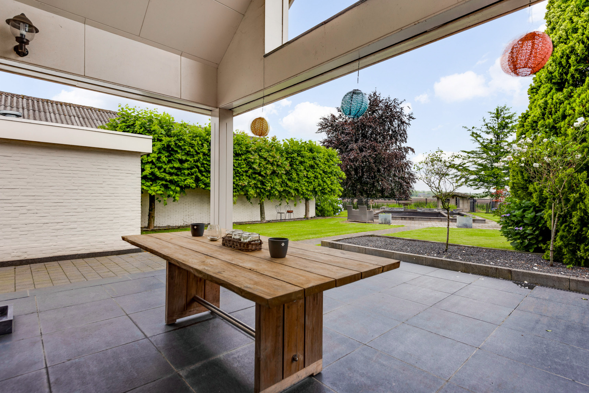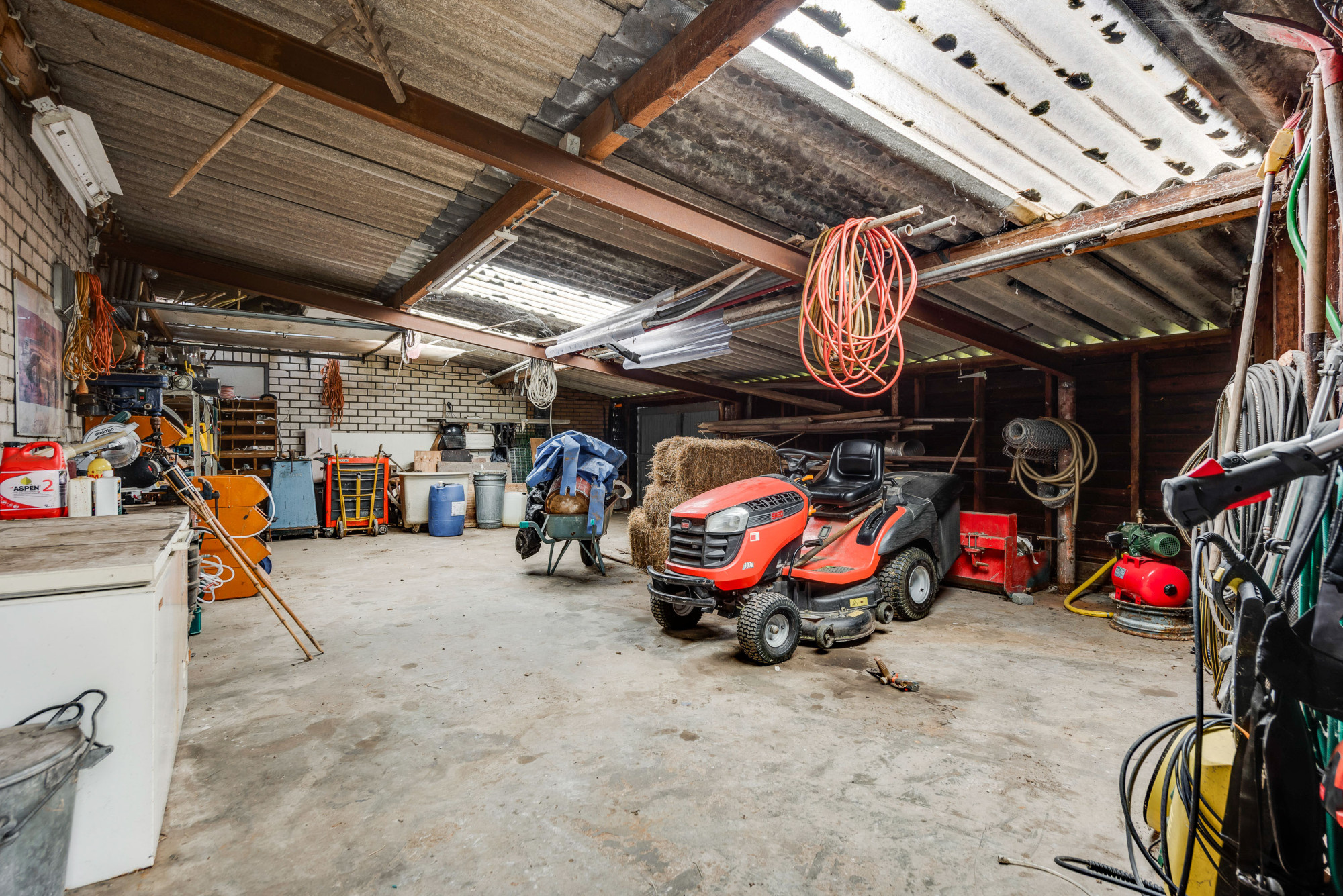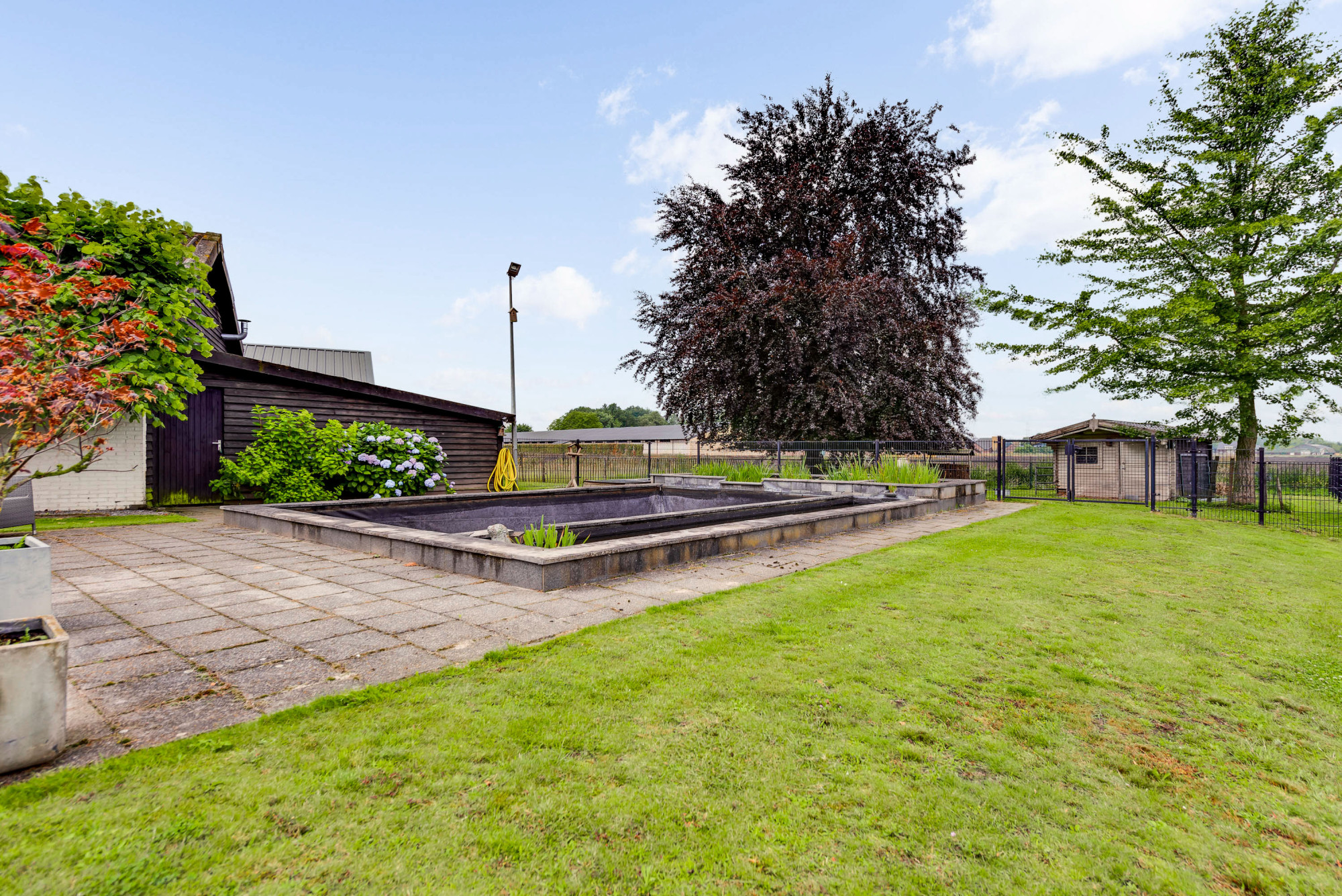 Aan de voorzijde van de woning vindt u een voortuin en bestrating met voldoende parkeerruimte en toegang tot de garage met elektrische poort en de achtertuin. De achtertuin biedt weids uitzicht over de landerijen en beschikt o.a. over gazon, een weitje, diverse aanplant, meerdere overkappingen en een (zwem)vijver (voormalig zwembad; deze is weer na enige aanpassingen ook als zwembad weer te gebruiken). Verder is er nog een riante schuur en een houten tuinhuis/dierenverblijf aanwezig. Indien gewenst is, in combinatie met de woning, een aangrenzend bijgebouw (loods) met voorterrein ook te koop (of te huur in combinatie met aankoop woning) van maar liefst ca. 224 m2 (niet in huidige vraagprijs inbegrepen). Deze multifunctionele ruimte heeft een hoge nok en een inpandige, eenvoudige kantoorruimte met kitchenette, is verwarmd en biedt eigen aansluitingen voor gas, water en elektra.