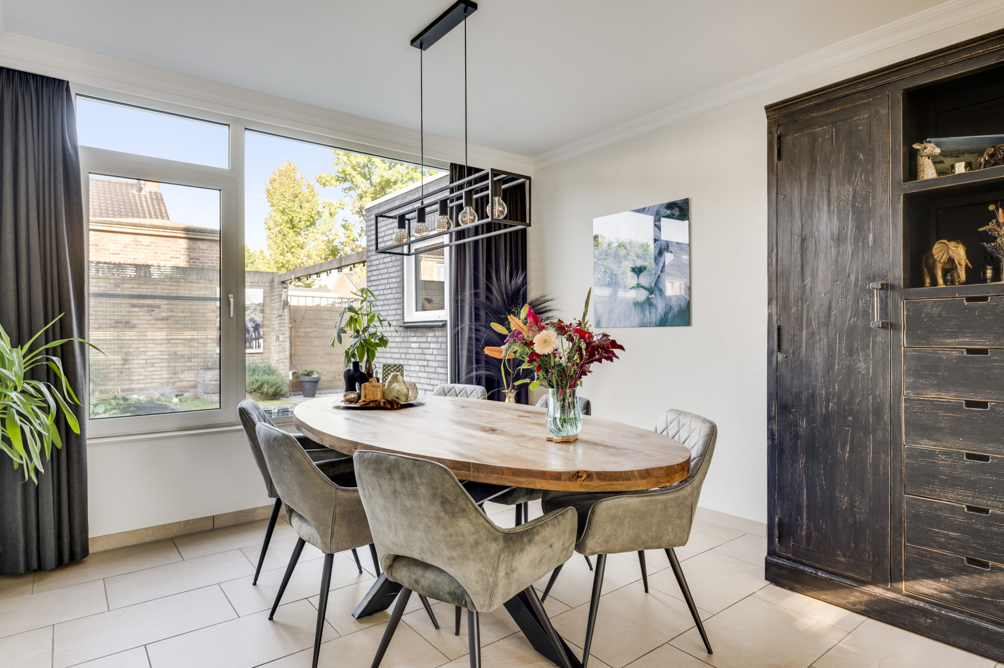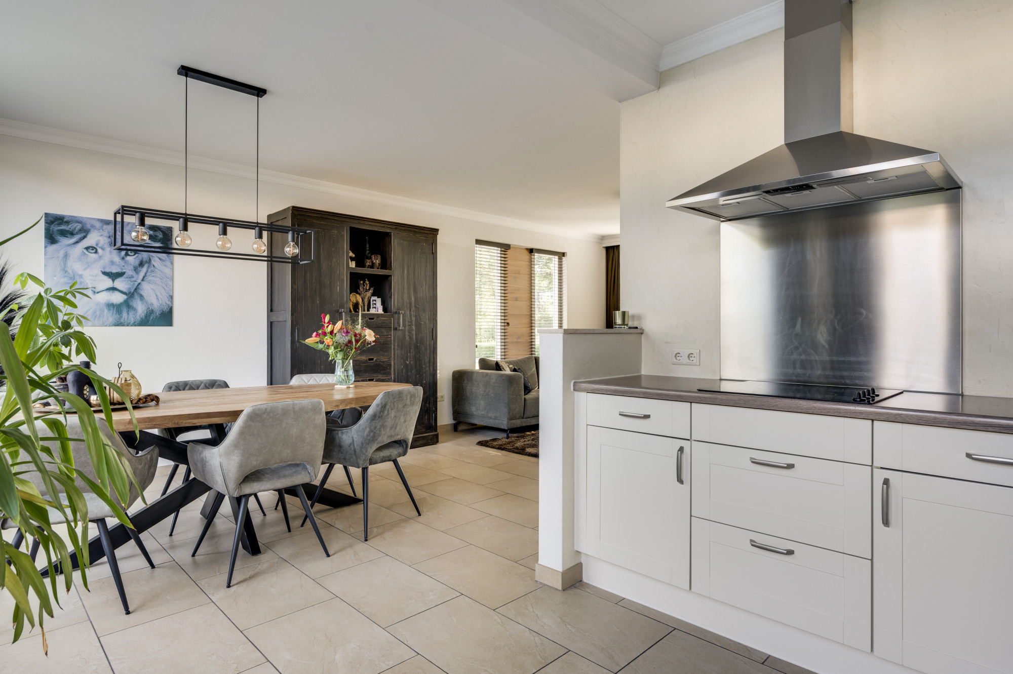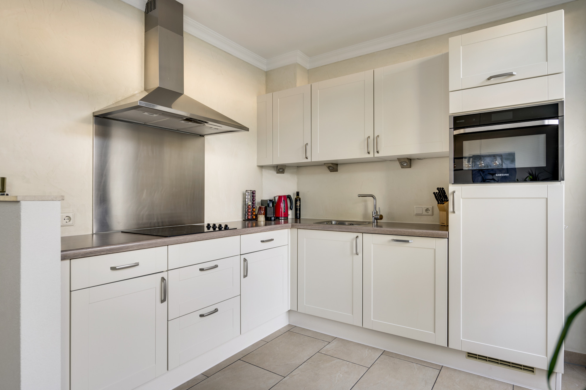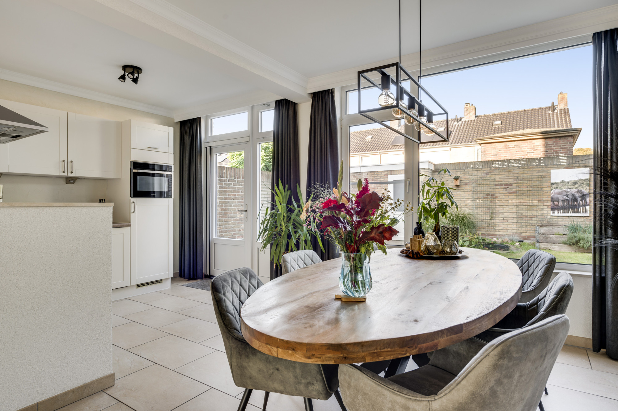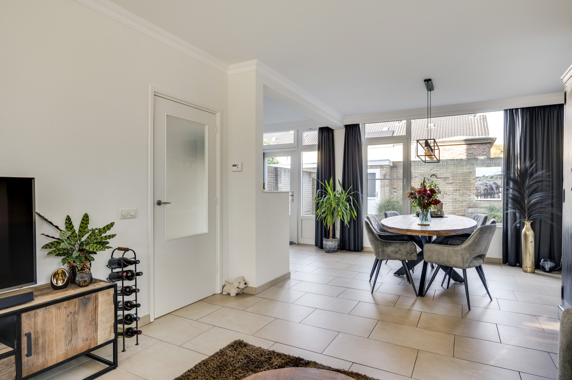 Hal/entree met de vernieuwde meterkast en een moderne toiletruimte, voorzien van een zwevend toilet en fonteintje. Vanuit de hal is er verder toegang tot de lichte woonkamer met veel ramen met vrij zicht aan 3 kanten. De woonkamer staat in open verbinding met de keuken. Deze keuken is ingericht met een combinatie in hoekopstelling en voorzien van moderne inbouwapparatuur, waaronder een keramische kookplaat, afzuigkap, koelkast, combi-oven (2019) en een vaatwasser (2019). De begane grond is afgewerkt met een stijlvolle tegelvloer mét vloerverwarming, wat zorgt voor extra comfort. Vanuit de keuken heeft u toegang tot de achtertuin.