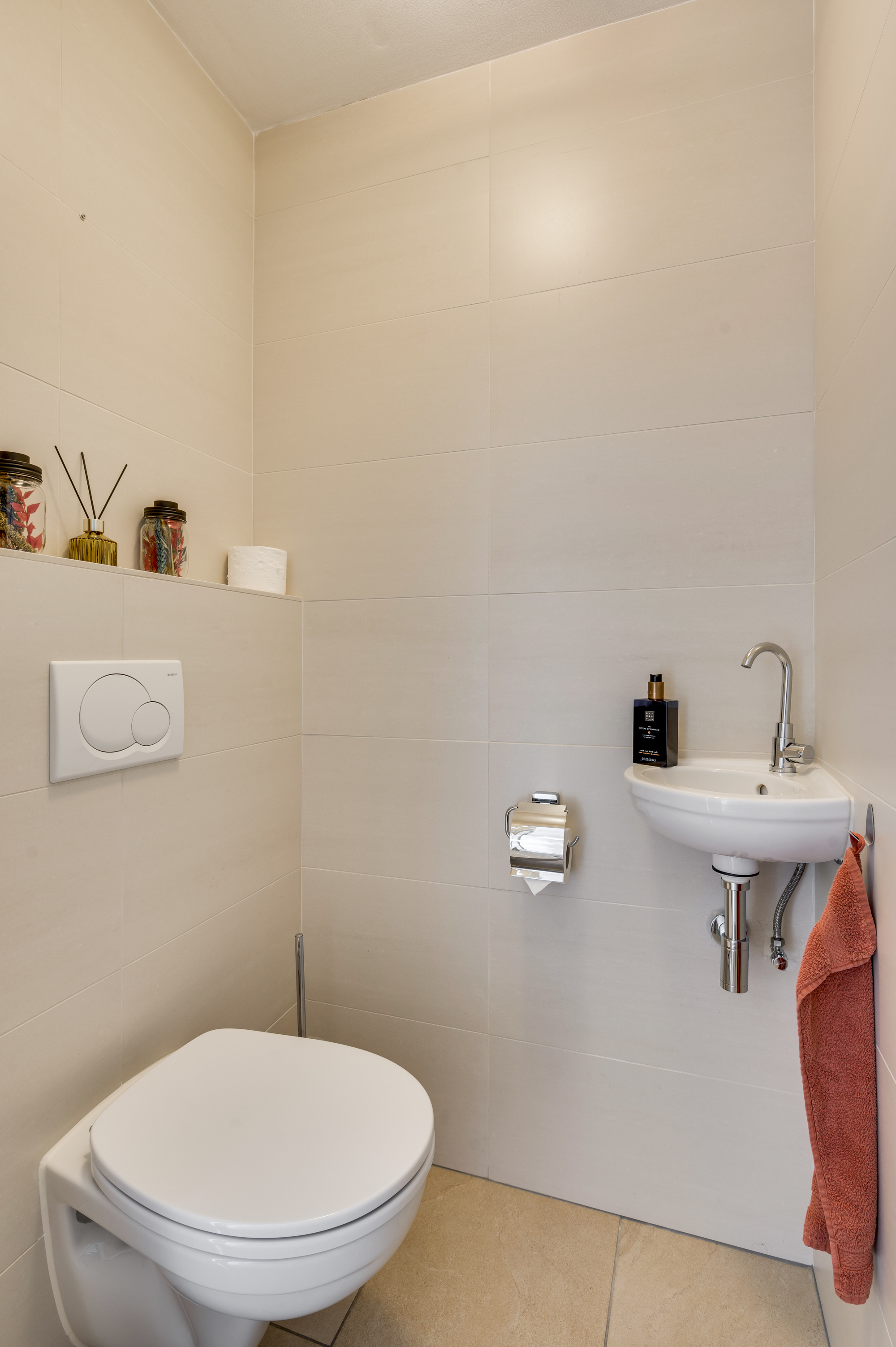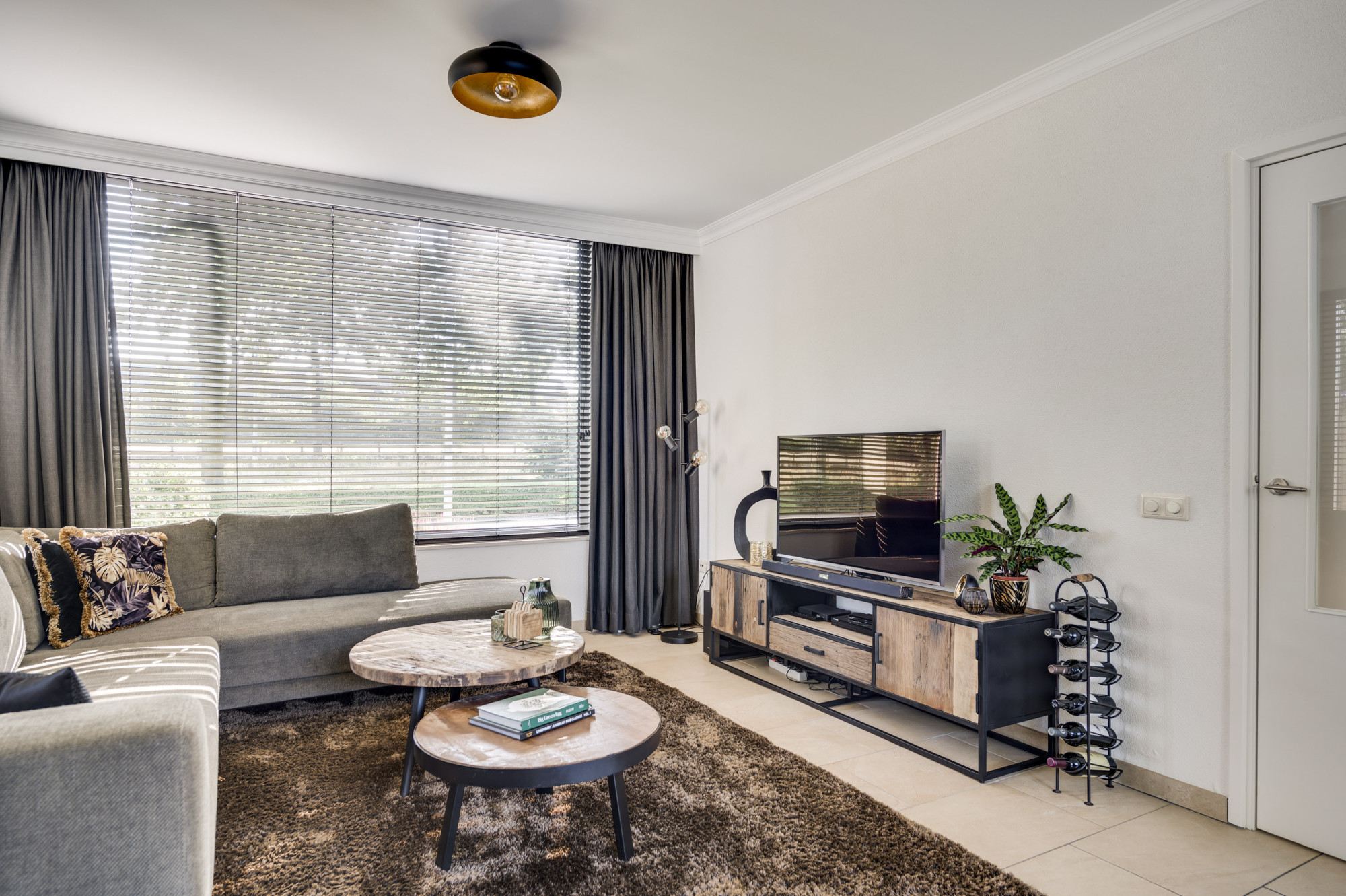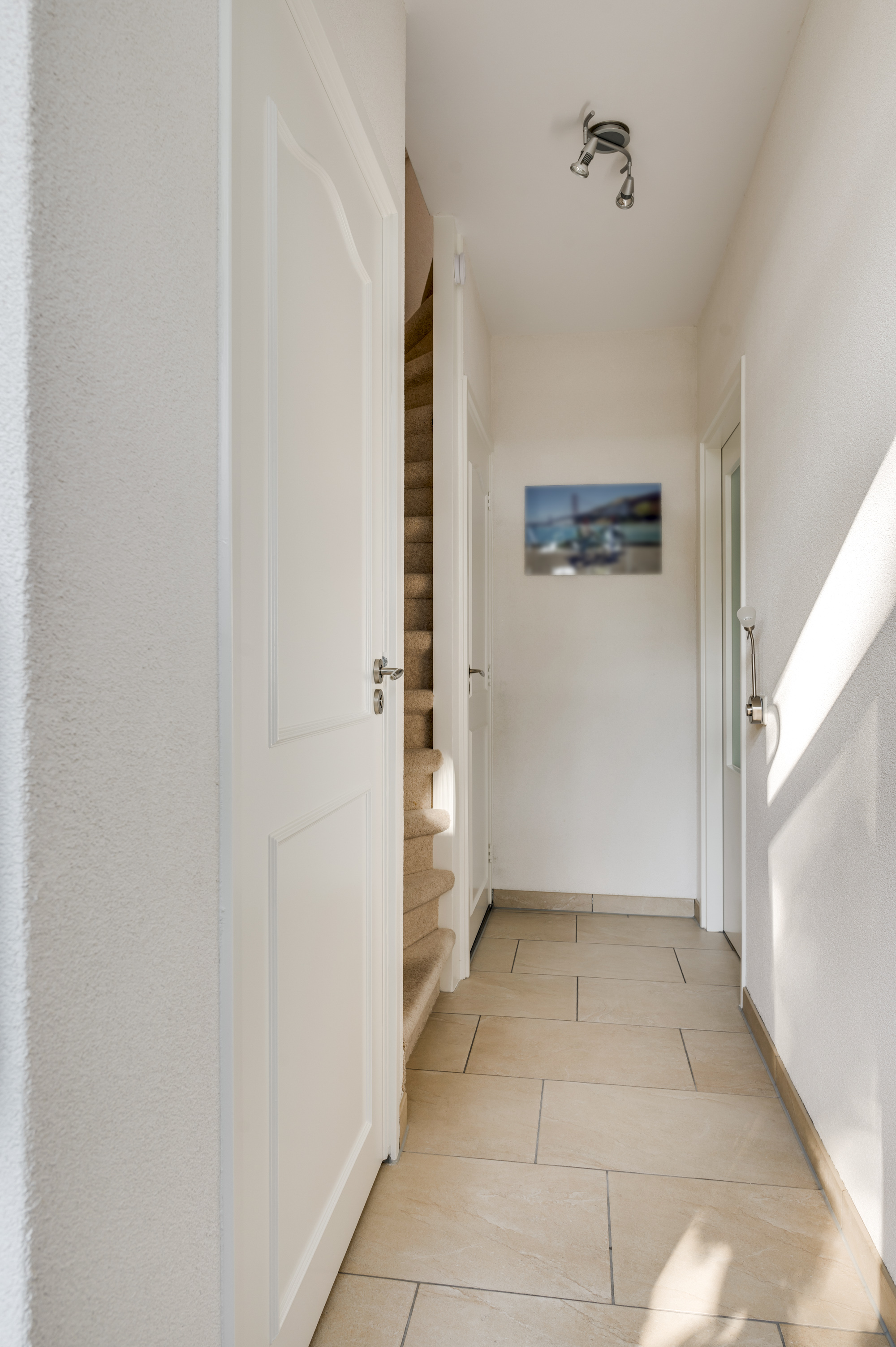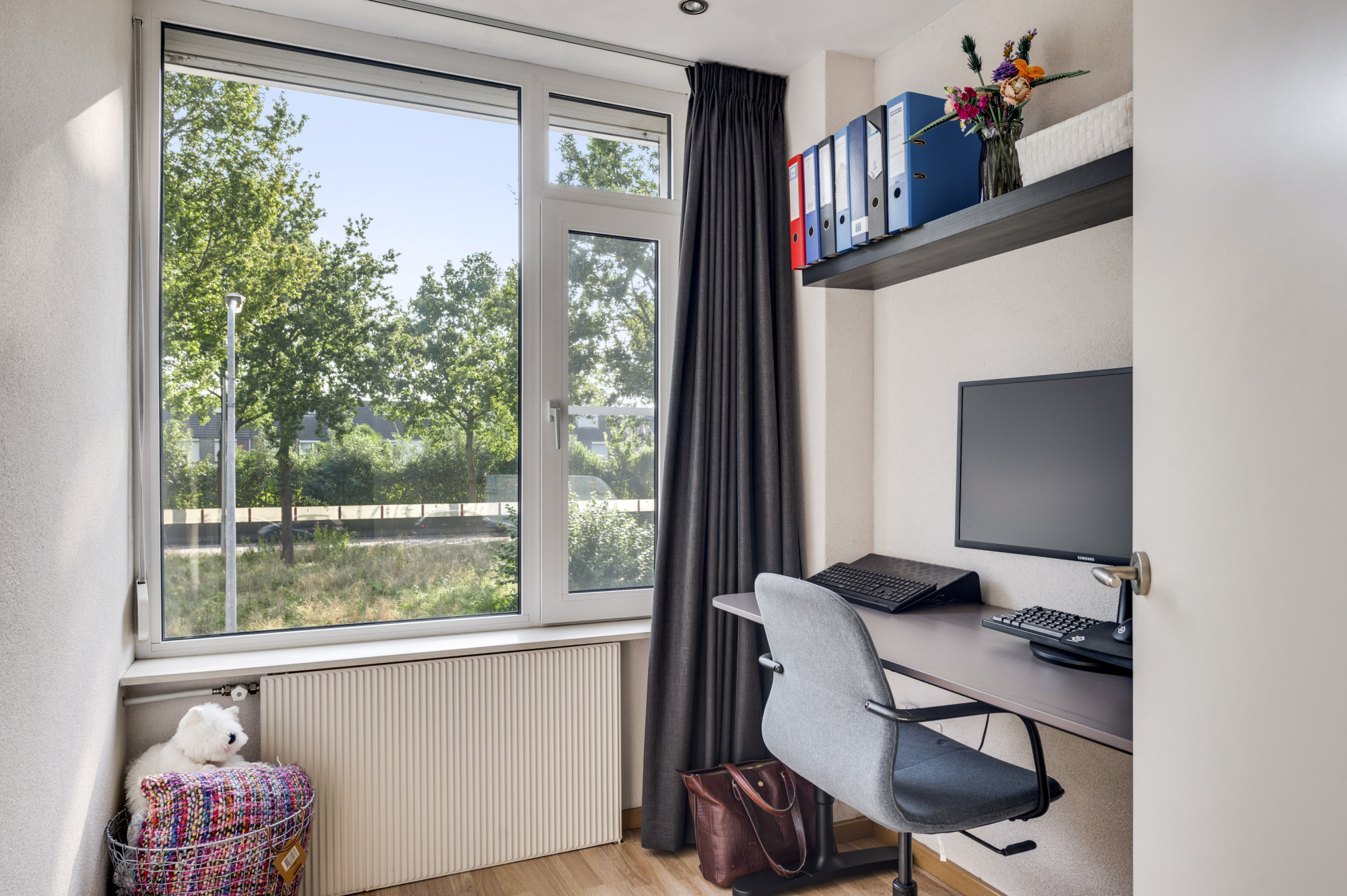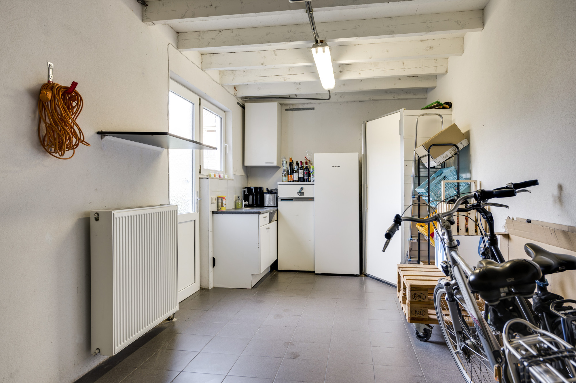 Hal/entree met de vernieuwde meterkast en een moderne toiletruimte, voorzien van een zwevend toilet en fonteintje. Vanuit de hal is er verder toegang tot de lichte woonkamer met veel ramen met vrij zicht aan 3 kanten. De woonkamer staat in open verbinding met de keuken. Deze keuken is ingericht met een combinatie in hoekopstelling en voorzien van moderne inbouwapparatuur, waaronder een keramische kookplaat, afzuigkap, koelkast, combi-oven (2019) en een vaatwasser (2019). De begane grond is afgewerkt met een stijlvolle tegelvloer mét vloerverwarming, wat zorgt voor extra comfort. Vanuit de keuken heeft u toegang tot de achtertuin.