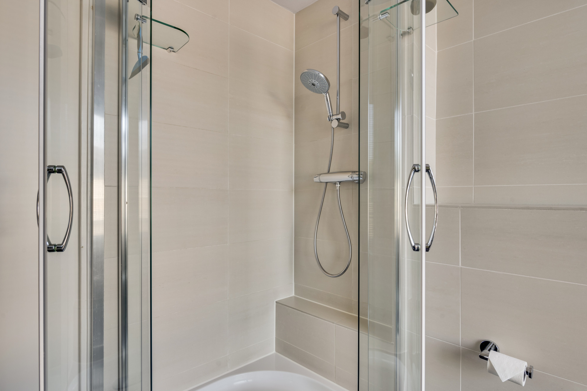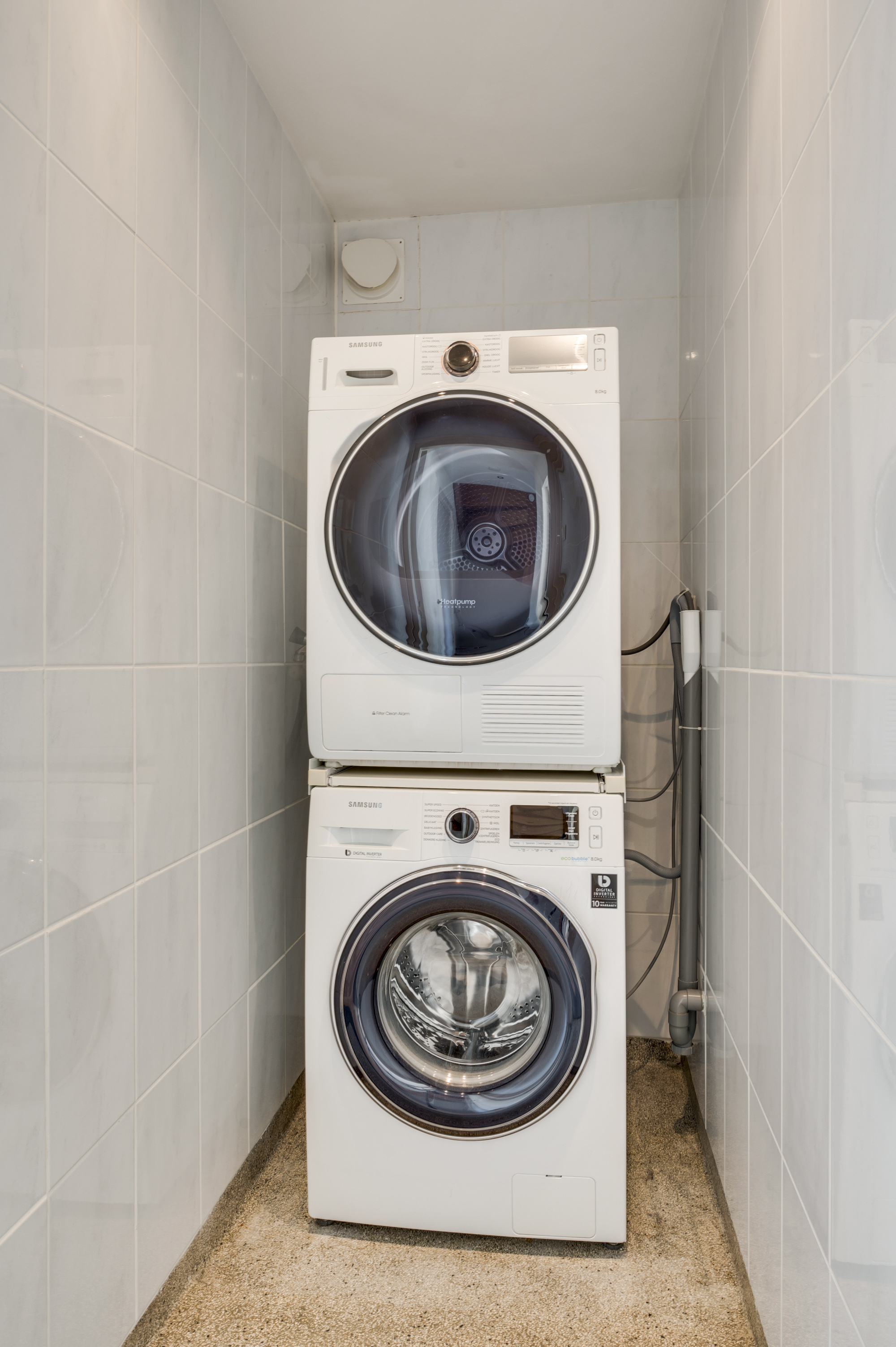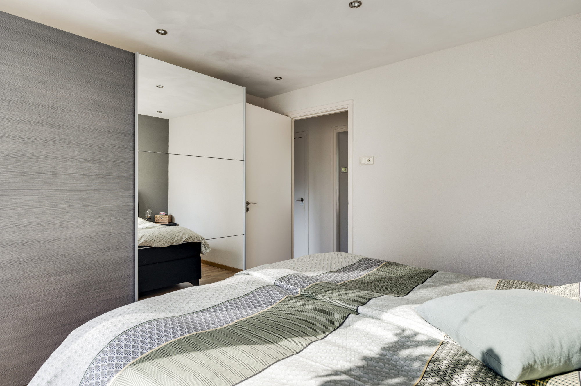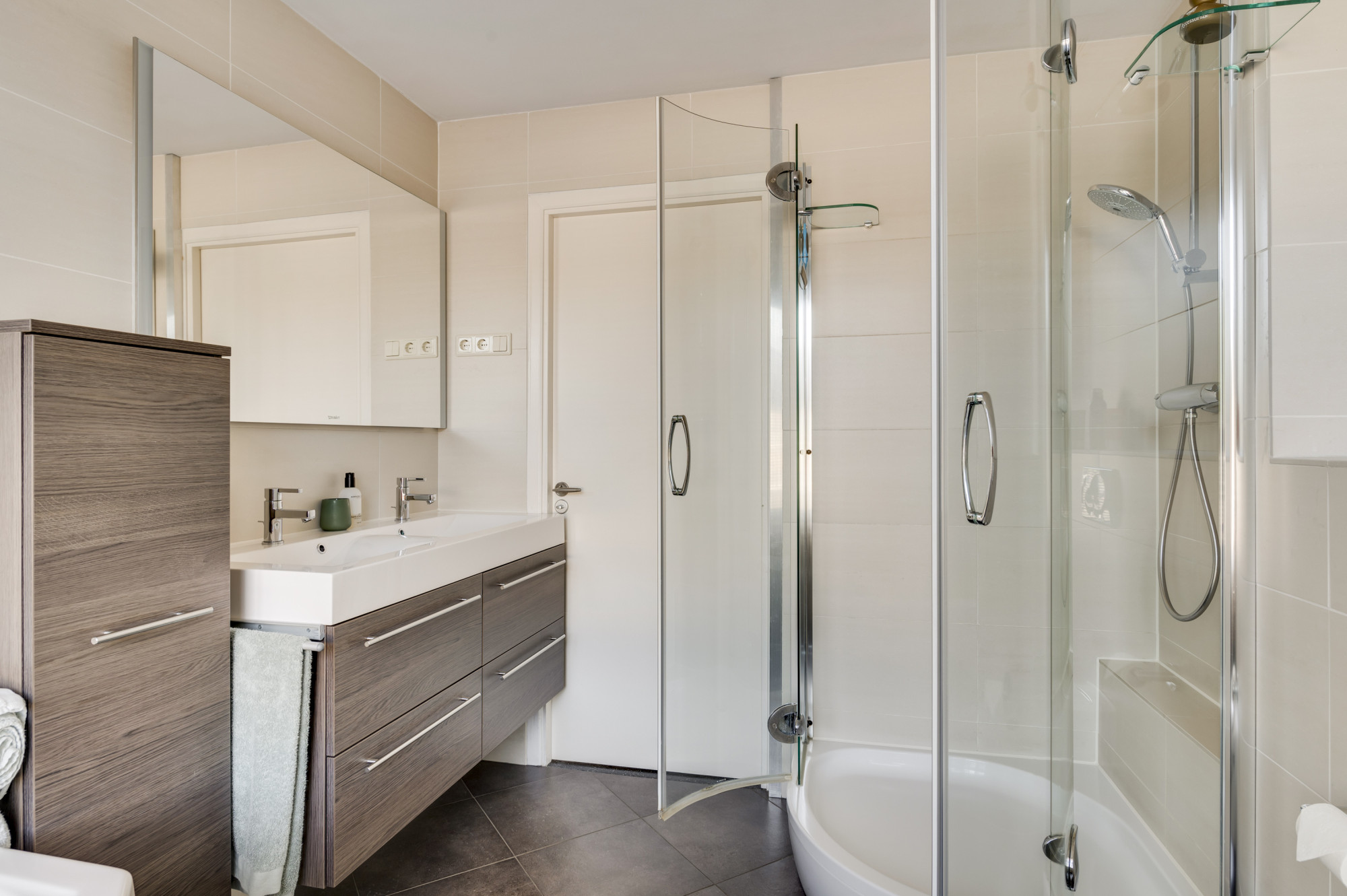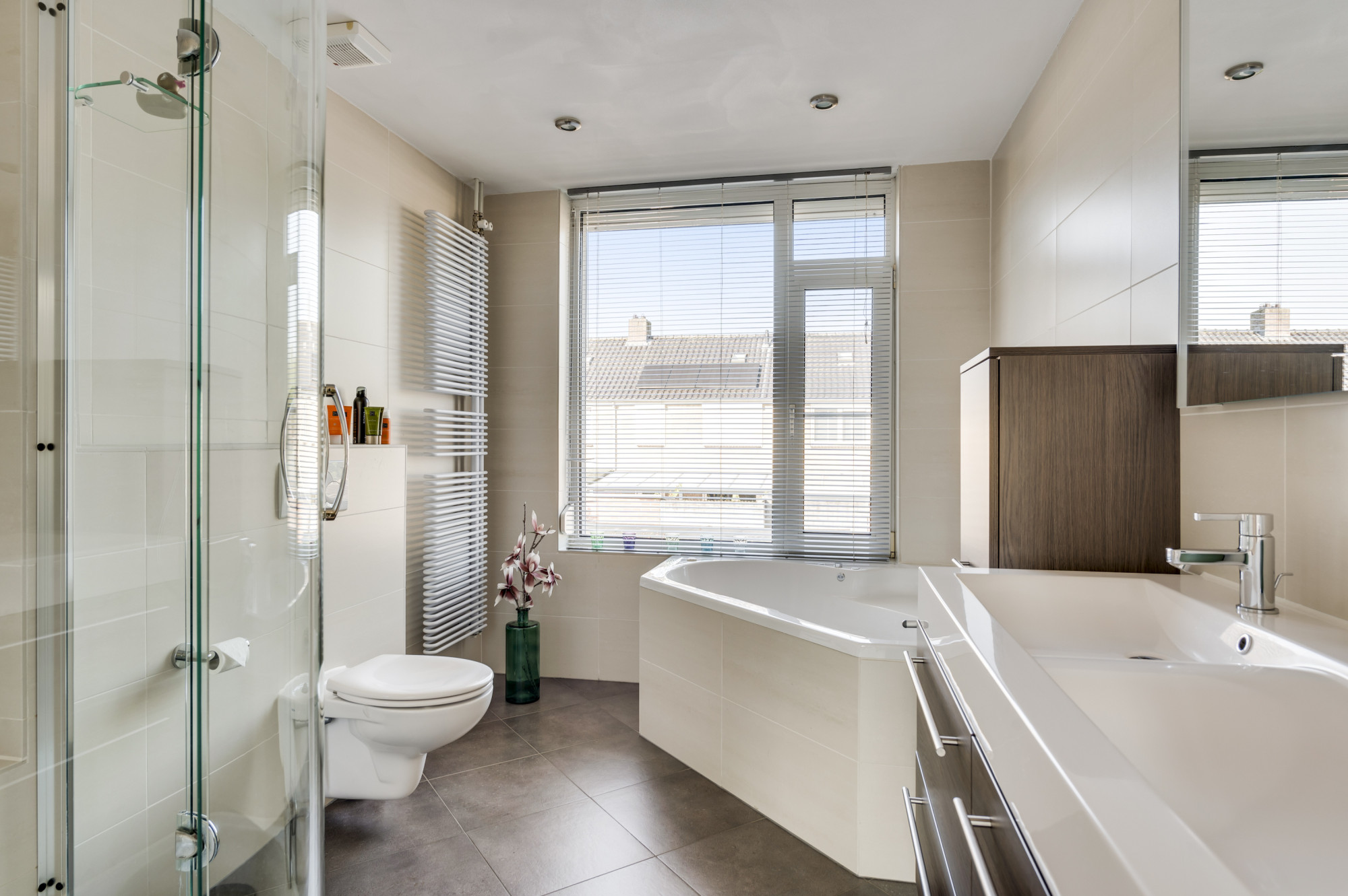 Op de eerste verdieping vindt u de eerste drie slaapkamers. De badkamer is compleet uitgerust met een ligbad met whirlpool, een aparte douche, toilet en een dubbele wastafel met meubel. Daarnaast is er vanuit de overloop een praktische bergkast te bereiken met aansluitingen voor de wasmachine en droger.