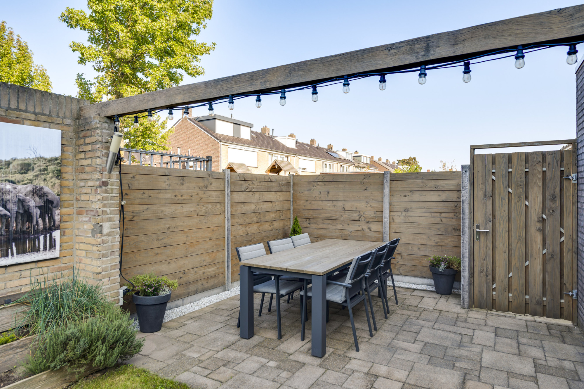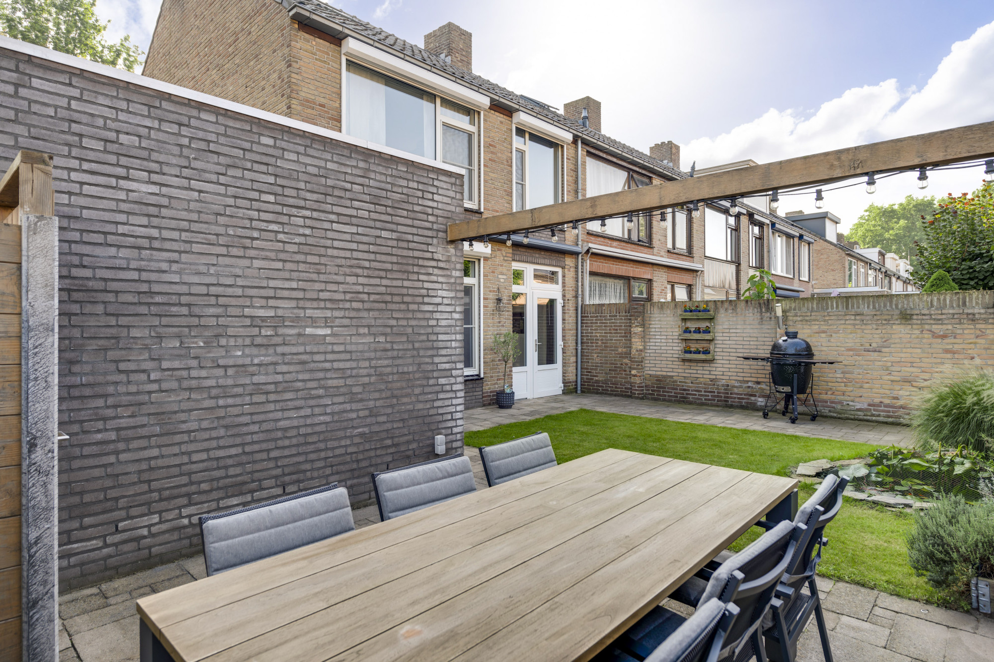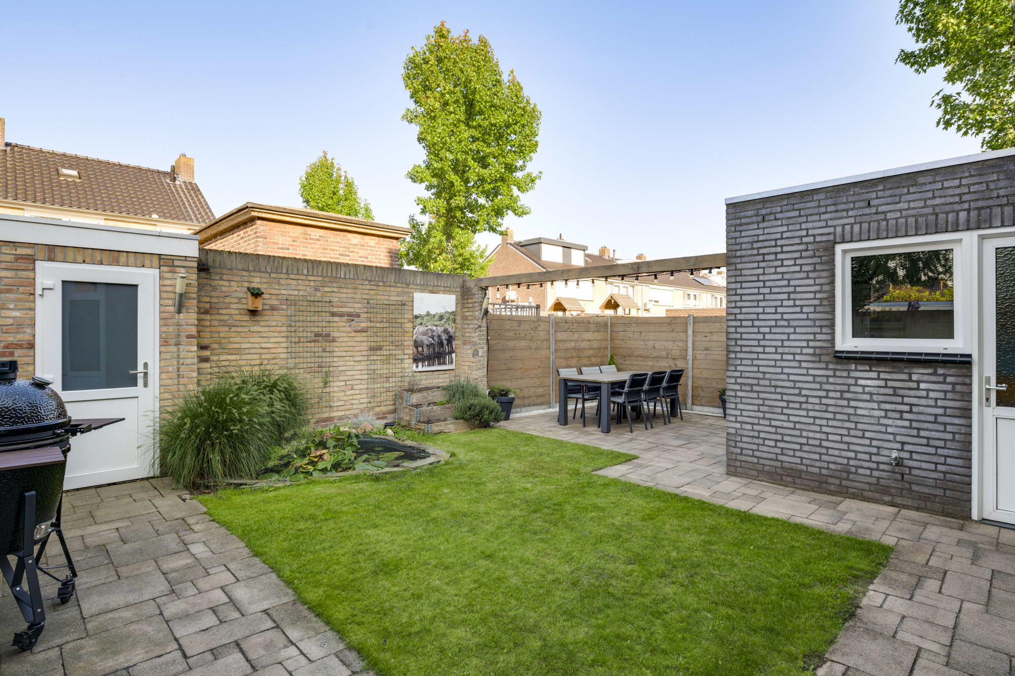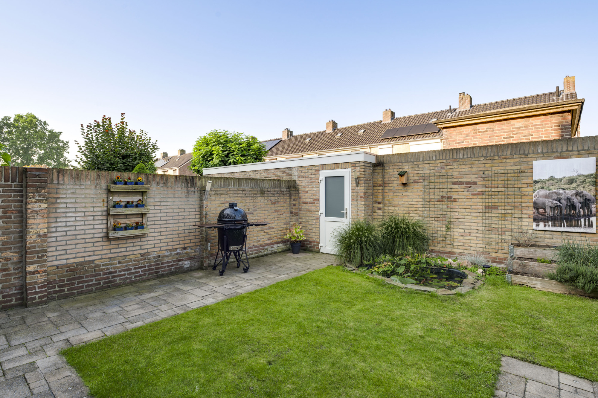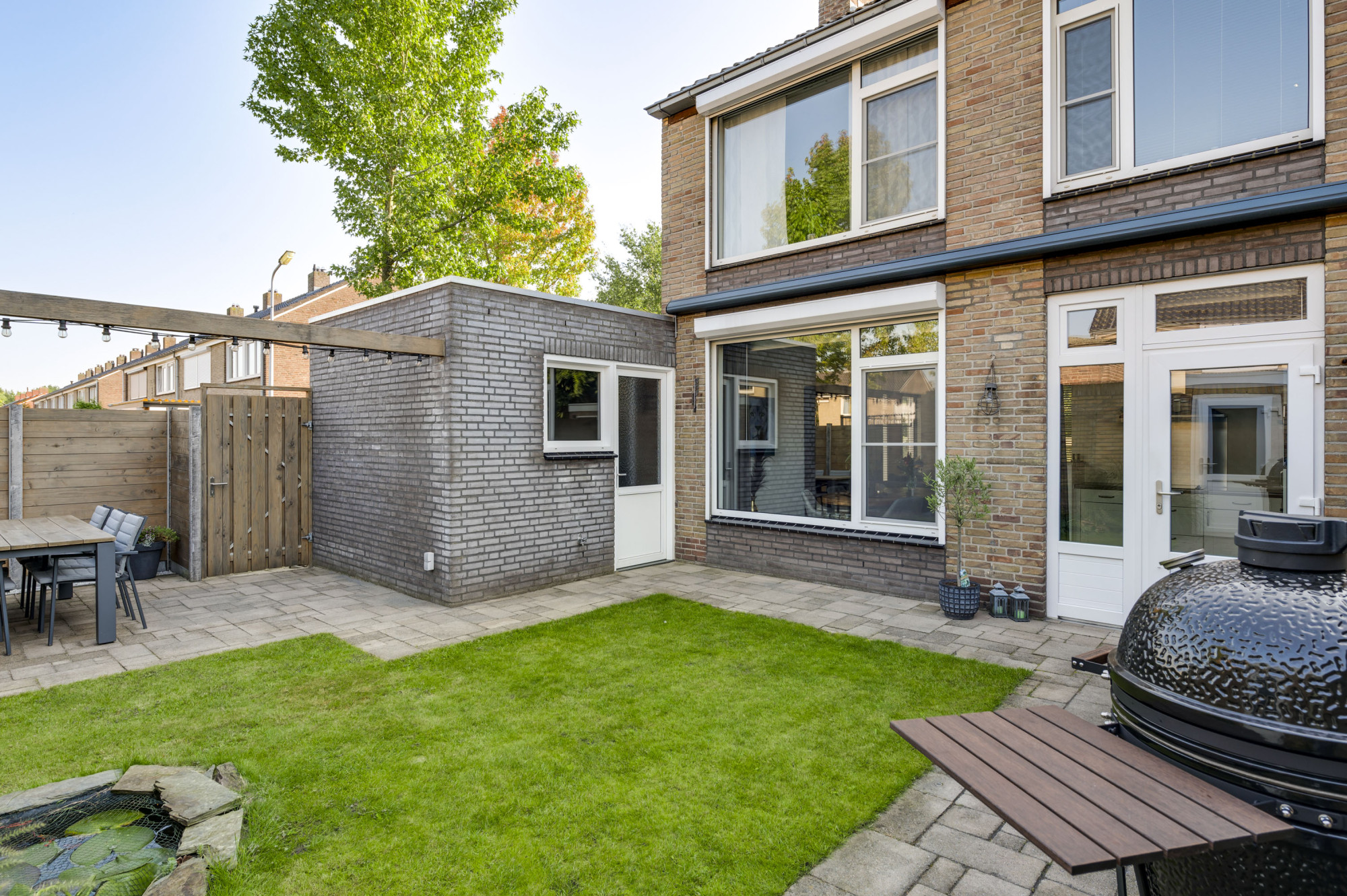 Er is een voortuin met een eigen oprit die leidt naar de ruime garage die in spouw is gebouwd, geïsoleerd en voorzien van een sectionaalpoort, verwarming, elektra, een voorraadkast, een keukenblok met spoelbak en een doucheruimte. De sfeervolle en zonnige achtertuin biedt een gazon, een kleine vijver, terrassen (waarvan 1 met een elektrisch zonnescherm aan de woning), een stenen berging en een vrije achterom.
