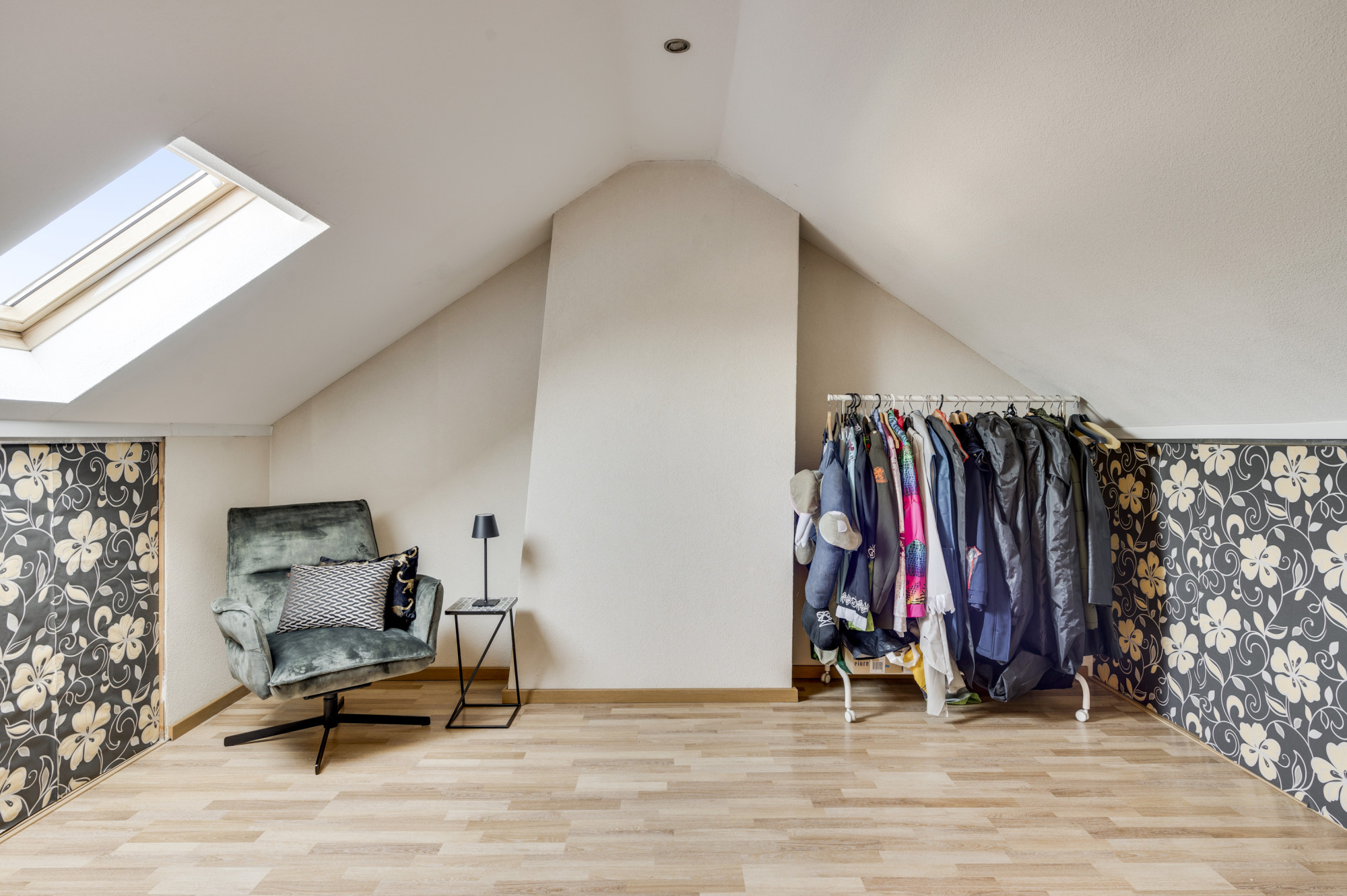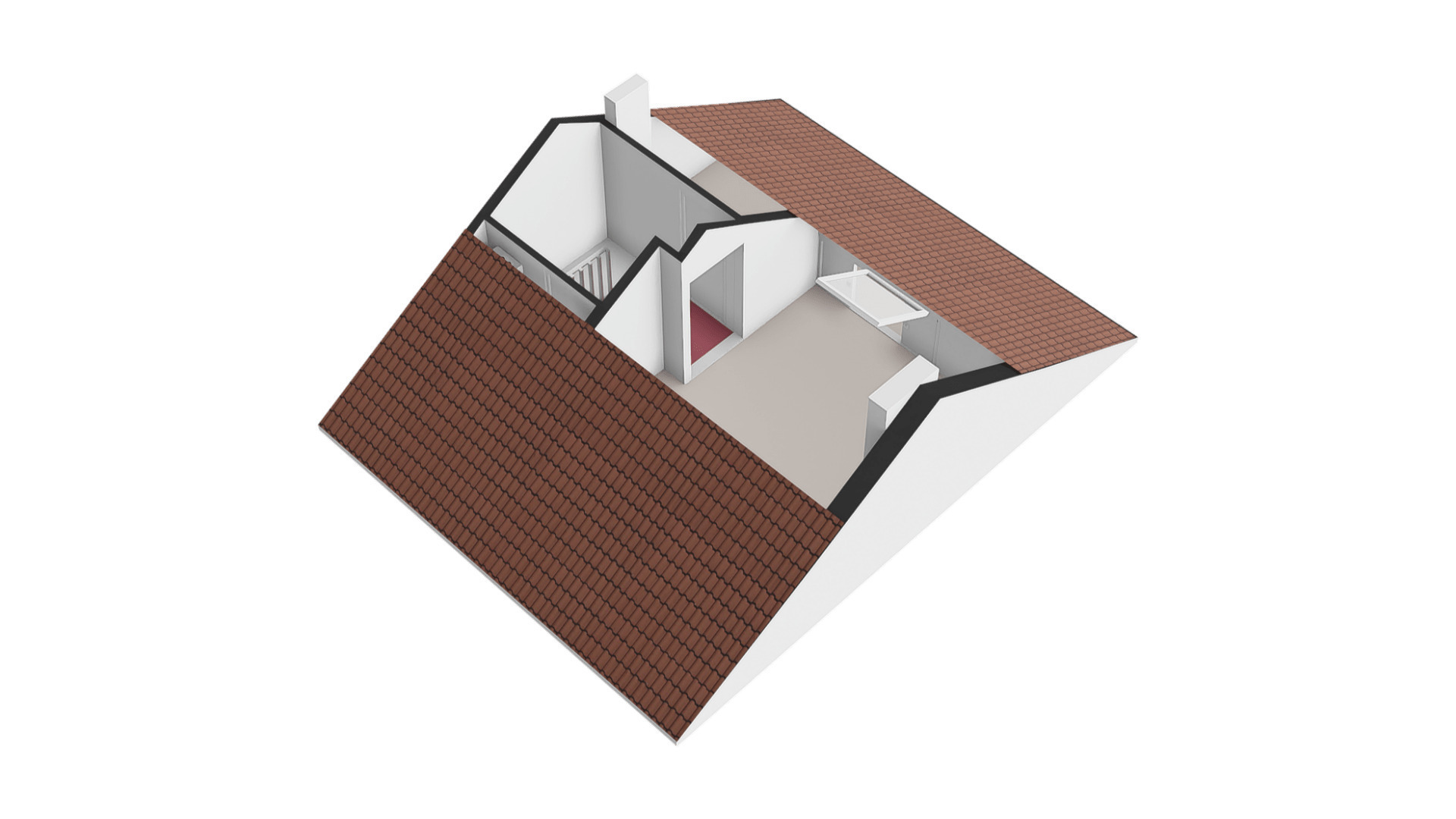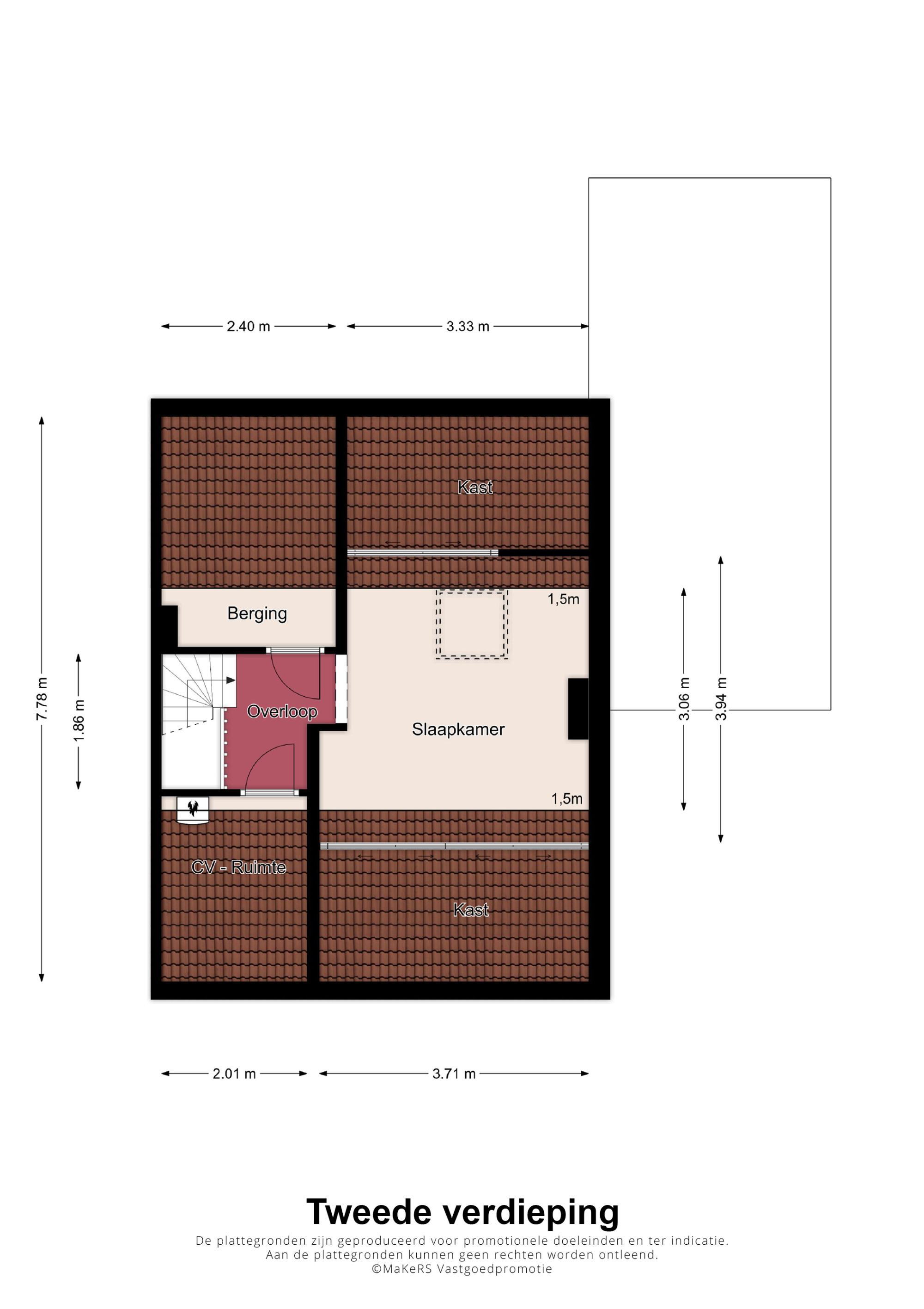 De tweede verdieping is bereikbaar via een vaste trap en biedt een riante zolder-/slaapkamer met veel bergruimte. Op deze verdieping vindt u ook de cv-ruimte met opstelling cv combi ketel (Rehema Quinta 28c, eigendom, ca. 2007) en extra opbergruimte.