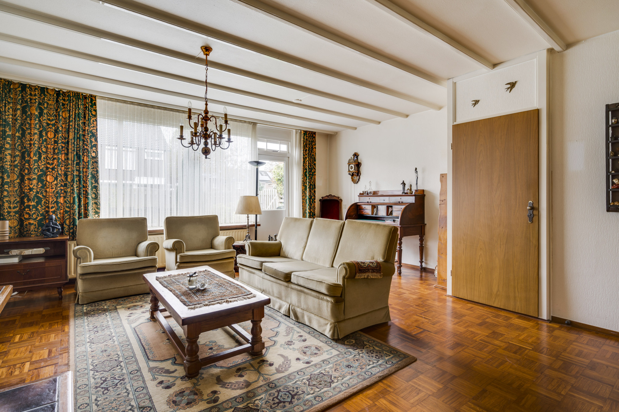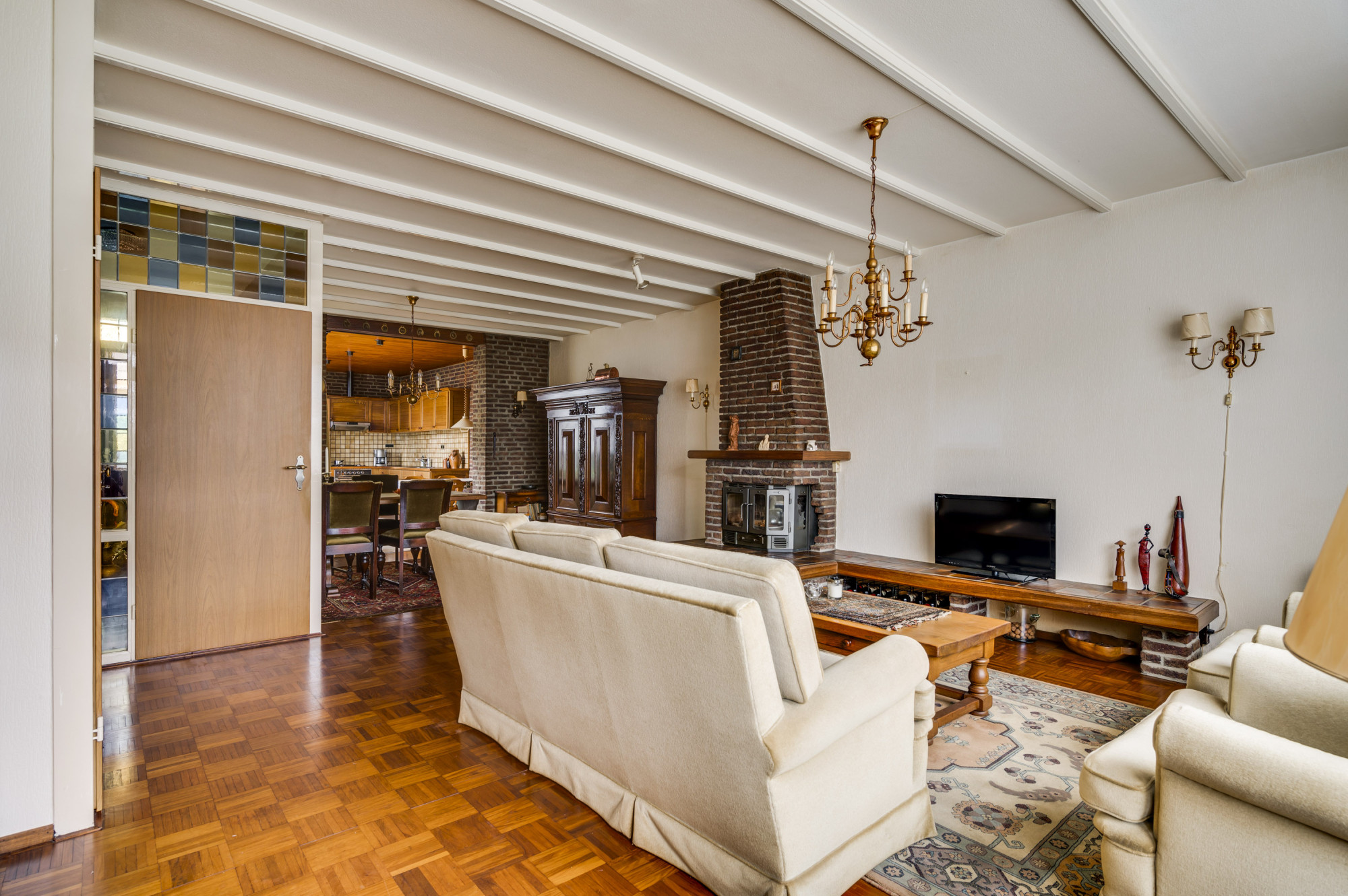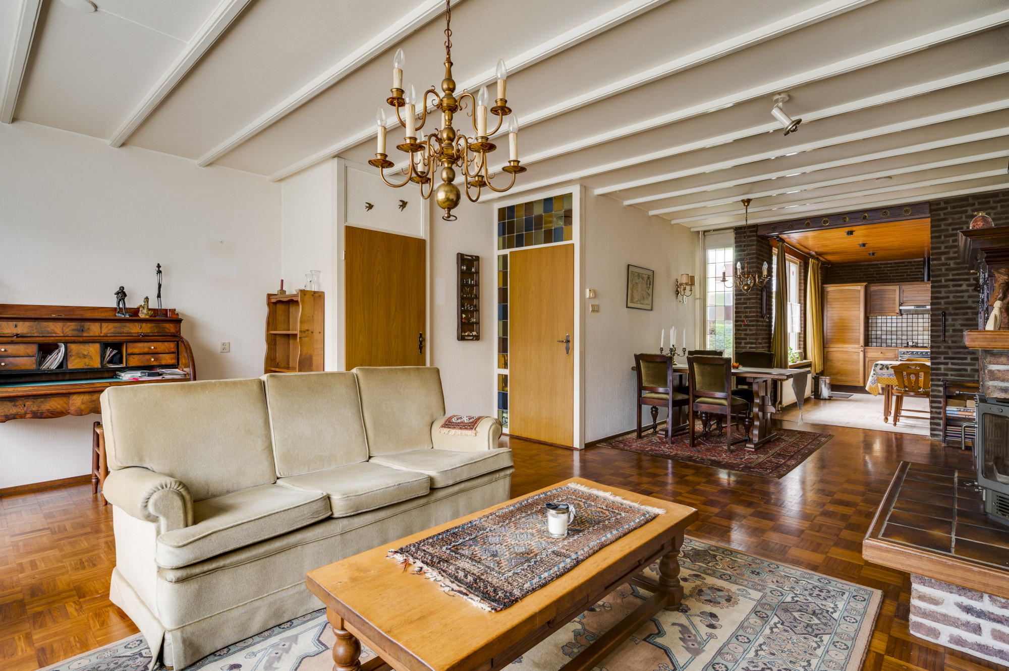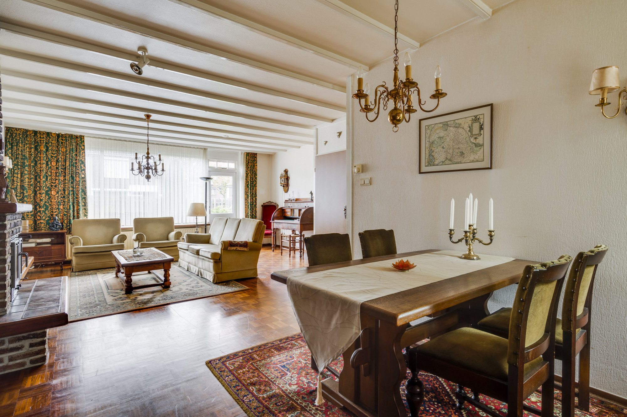Hal/entree met de meterkast, de trapopgang naar de eerste verdieping en toegang tot de royale woonkamer met een houtkachel en heerlijk tuincontact door de grote raampartijen. Vanuit de woonkamer is een praktische trapkast te bereiken, alsmede de aangebouwde en ruime woonkeuken met een eenvoudige combinatie in hoekopstelling met een eetgedeelte en eenvoudige (inbouw)apparatuur (o.a. gasfornuis, afzuigkap, oven, koelkast en boiler).