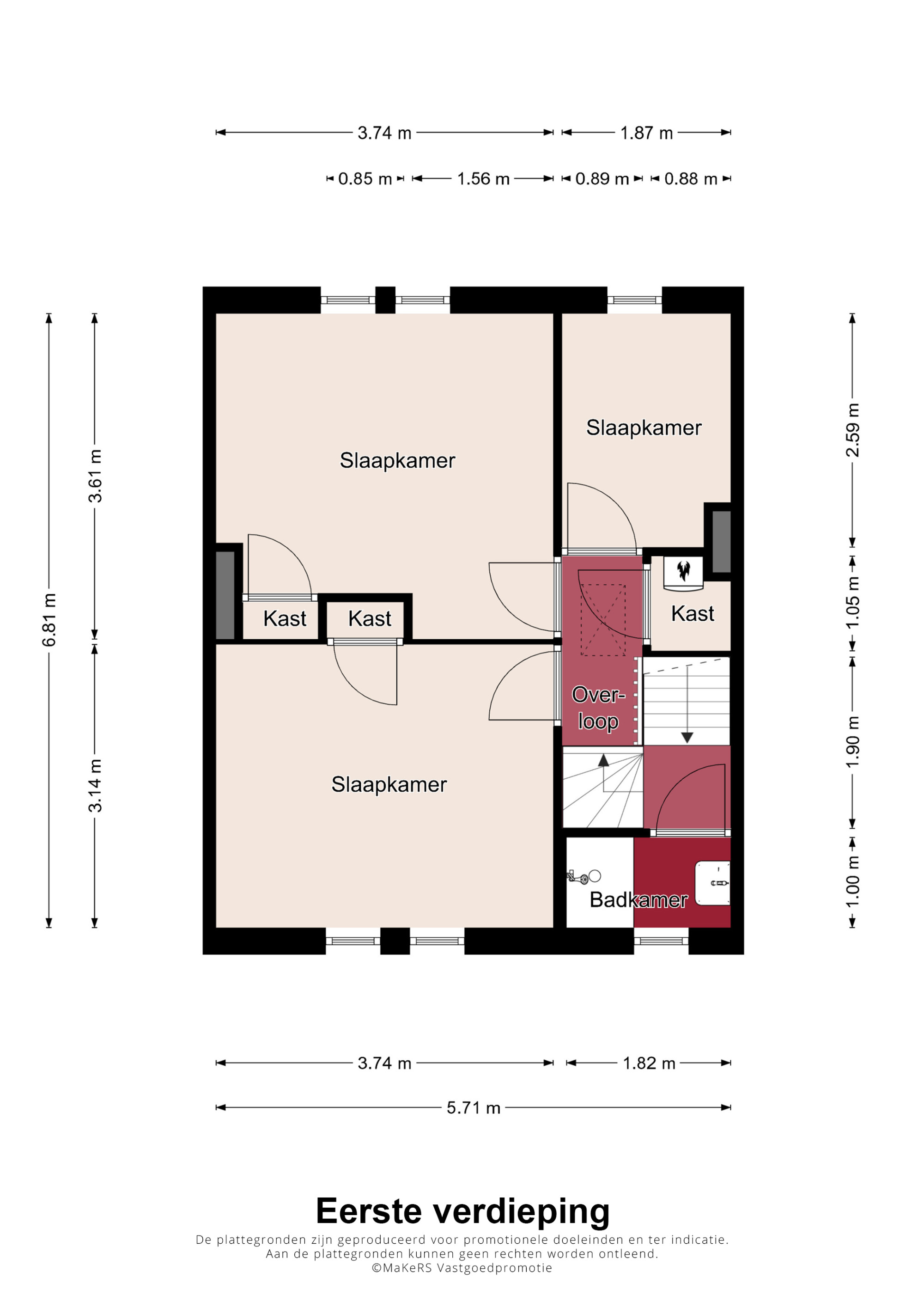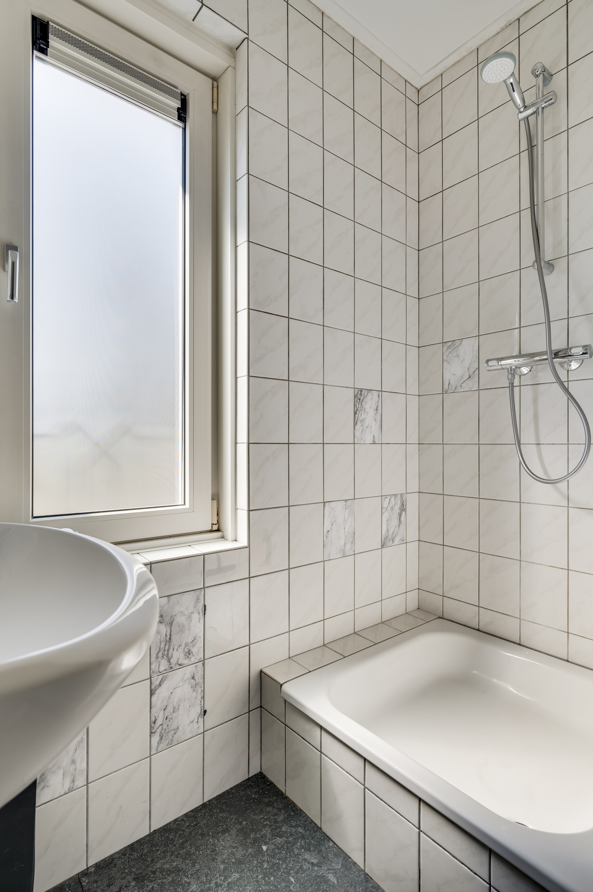 De overloop geeft toegang tot slaapkamer 2, 3 en 4. Twee van de 3 slaapkamers op deze woonlaag beschikken over een handige muurkast. Vanuit de overloop is een praktische muurkast bereikbaar waarin de cv-combiketel is opgesteld (Bosch 26 HRC, ca. 2006, eigendom). De gehele verdieping is afgewerkt met een laminaatvloer. Halverwege de trap naar de eerste verdieping bevindt zich de knusse, moderne badkamer. Deze is volledig betegeld en voorzien van een douche en wastafel.