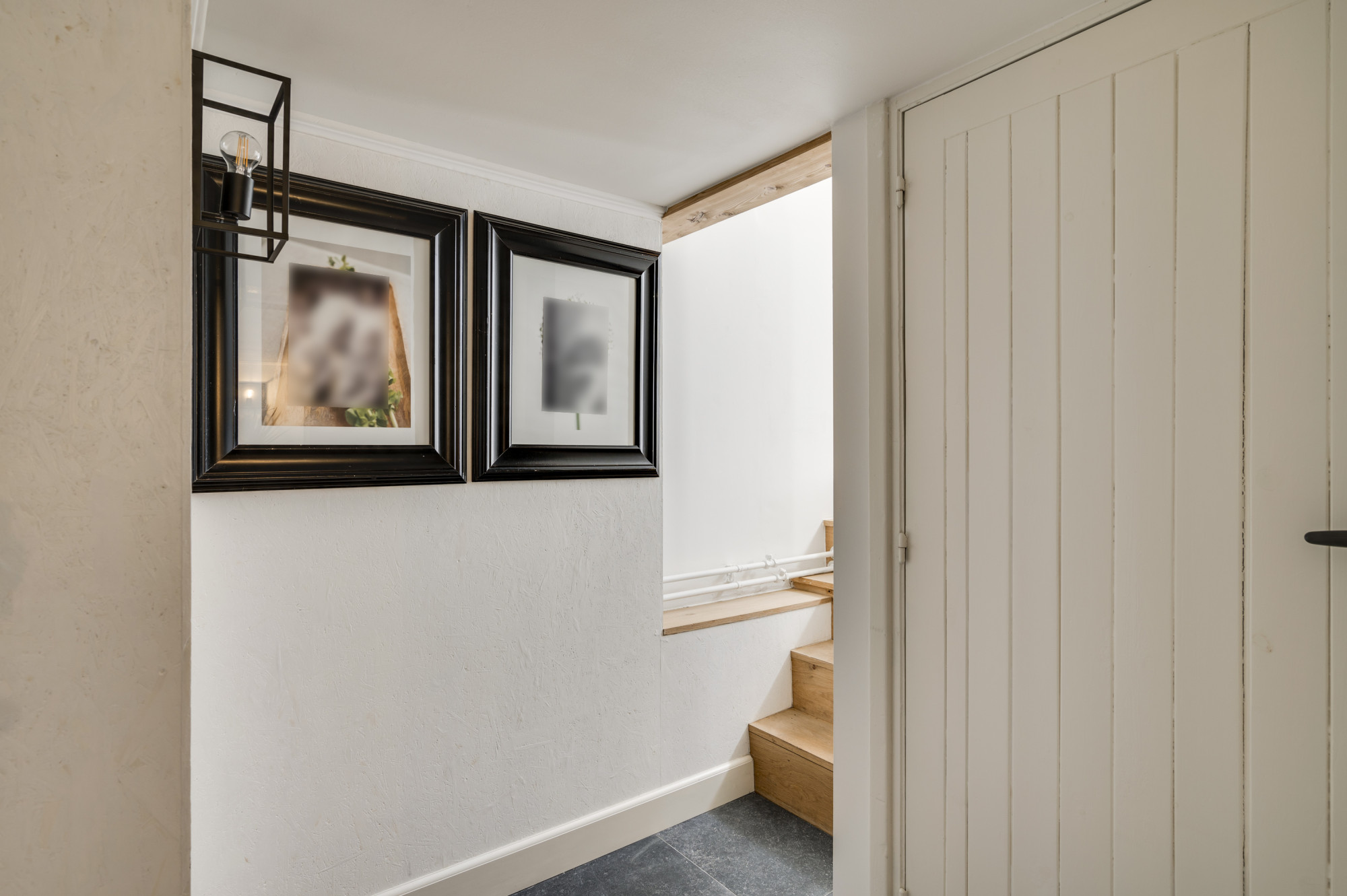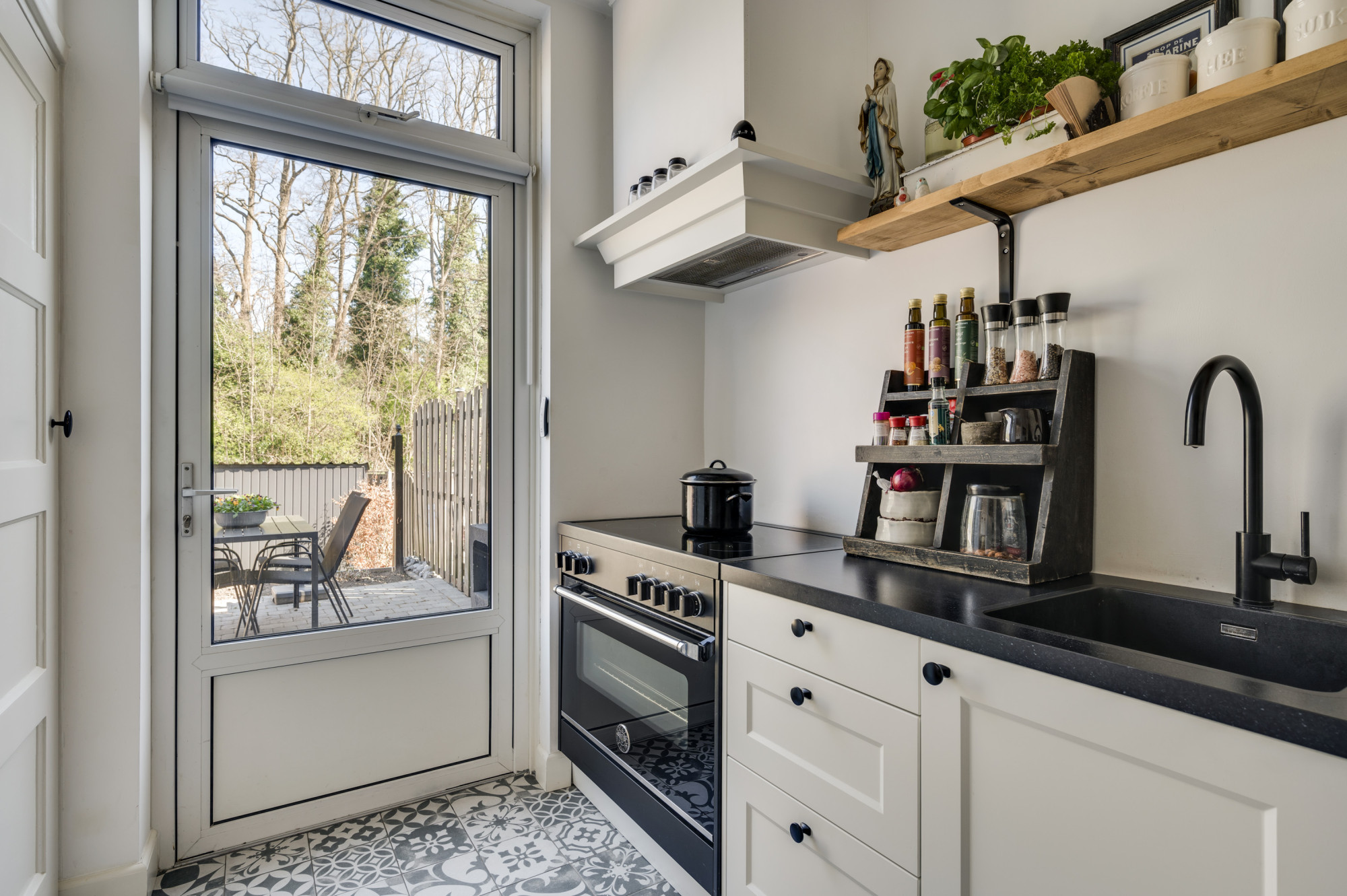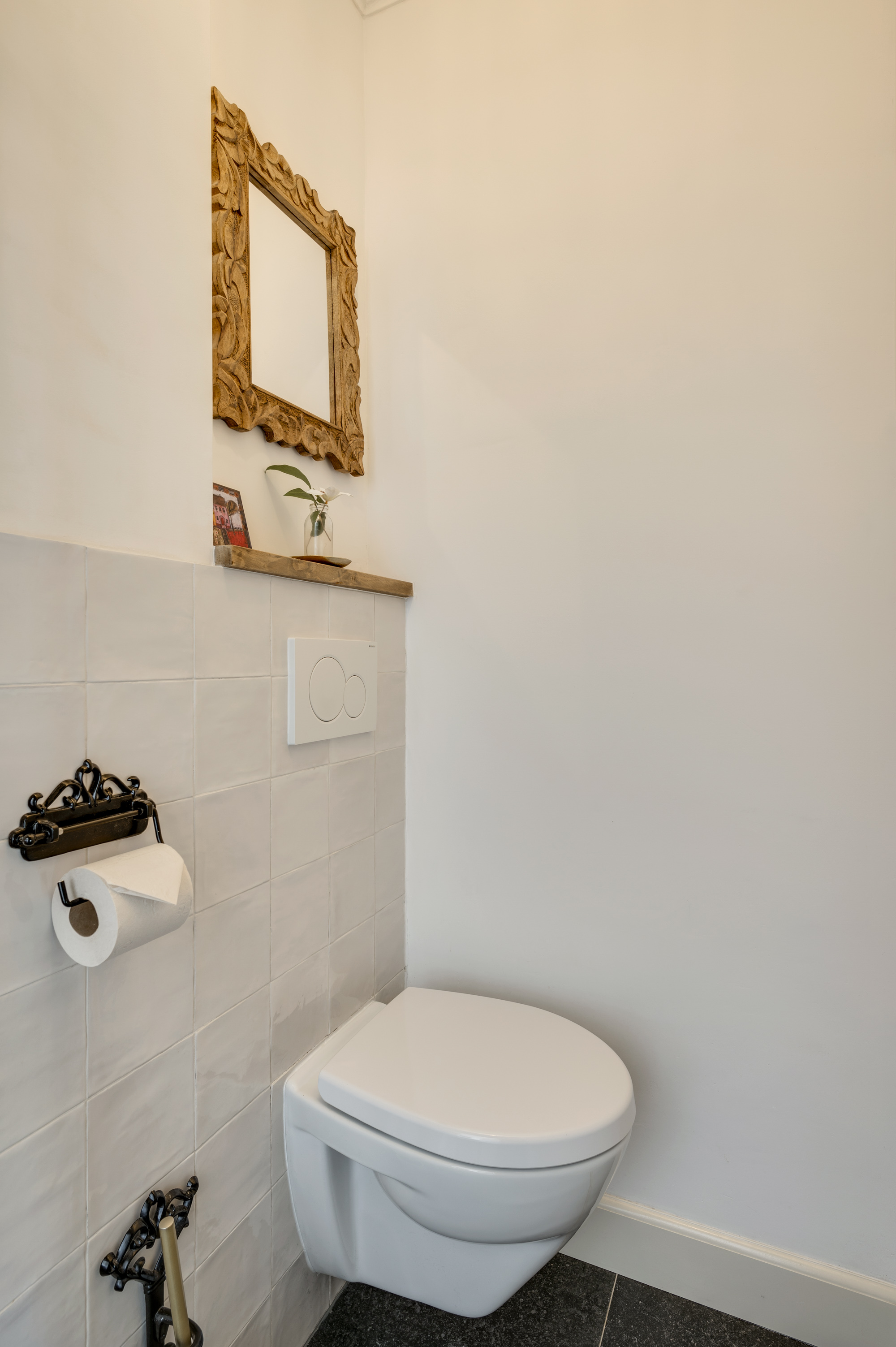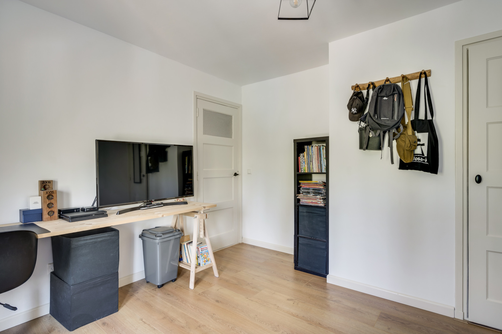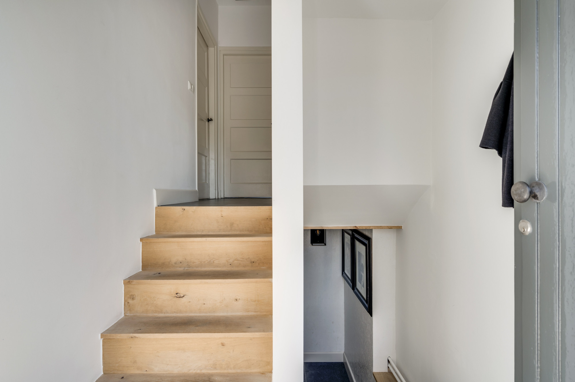 De hal geeft toegang tot het souterrain, de moderne toiletruimte met zwevend toilet, de keuken en de woonkamer. De woonkamer met schouwpartij is heerlijk licht dankzij de grote schuifpui naar de tuin en is afgewerkt met een mooie eiken parketvloer. Een vaste muurkast zorgt voor extra opbergruimte. De keuken biedt een moderne opstelling en is uitgerust met een inductiekookplaat, afzuigkap, oven en een koelkast. Ook vanuit de keuken is de tuin bereikbaar.