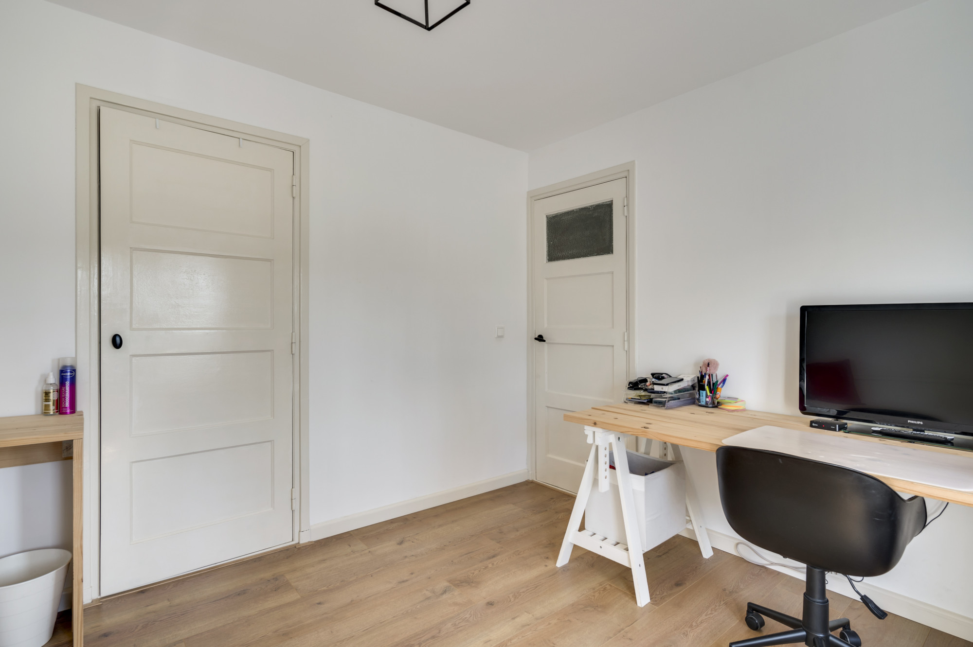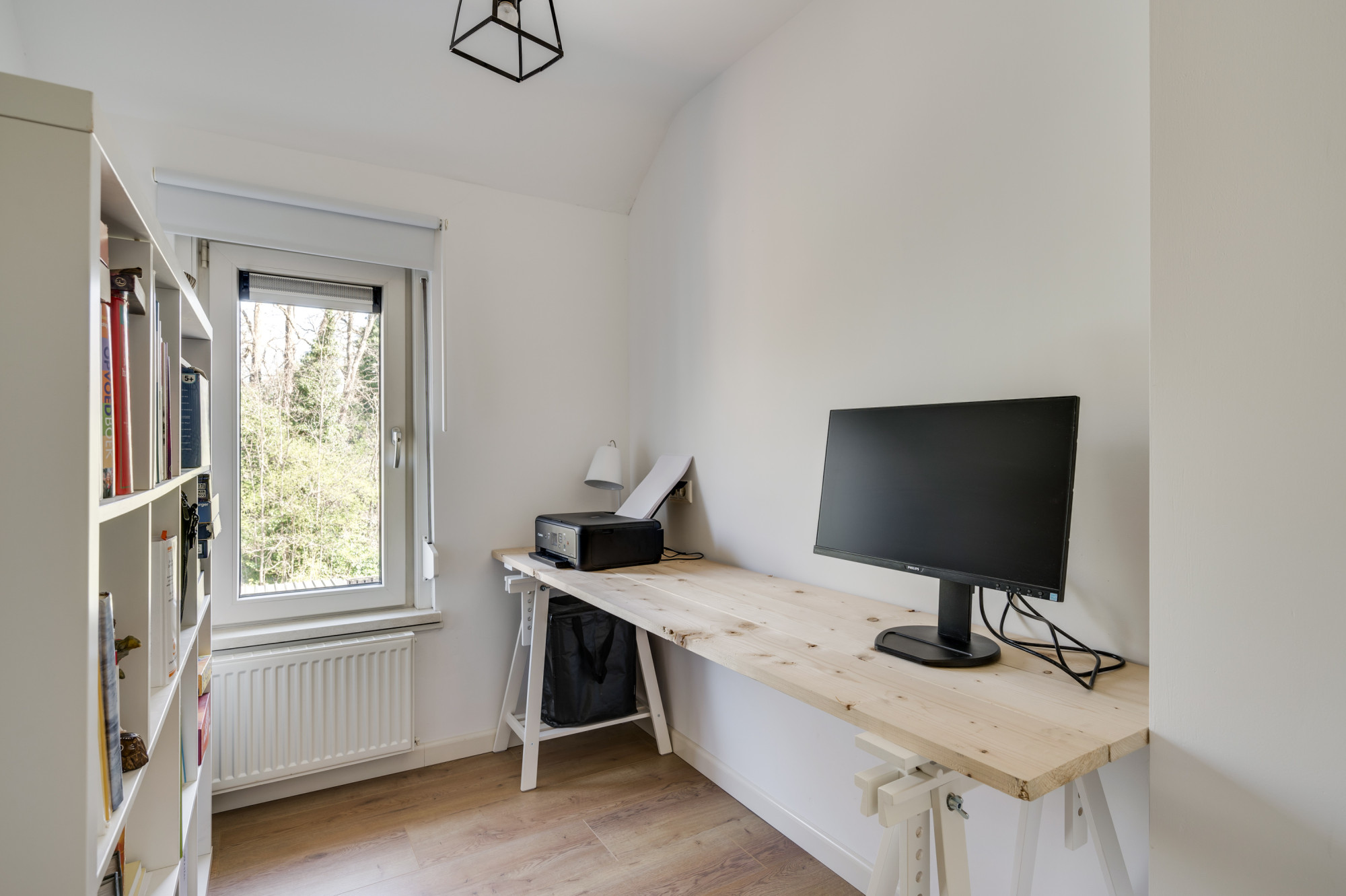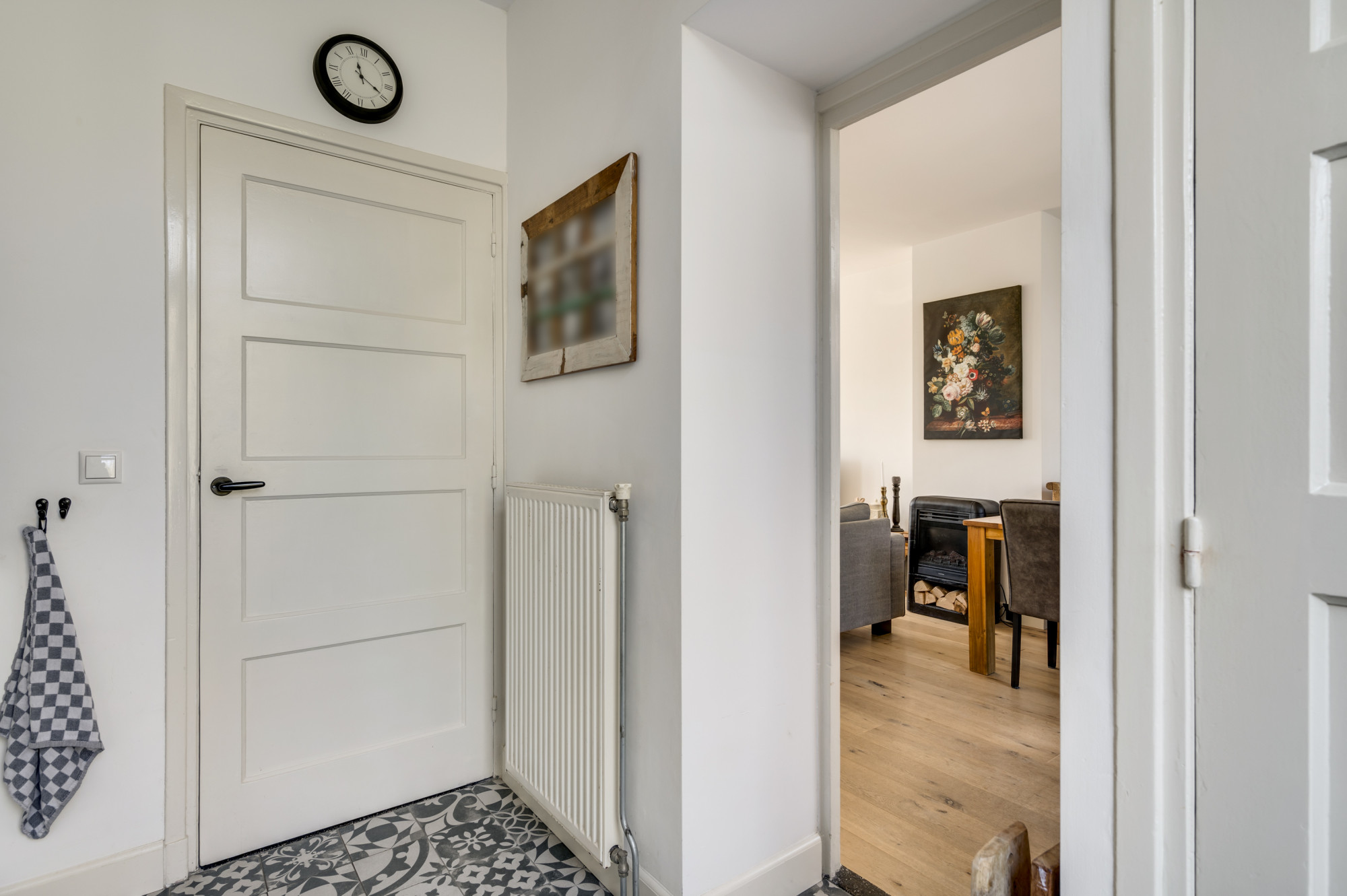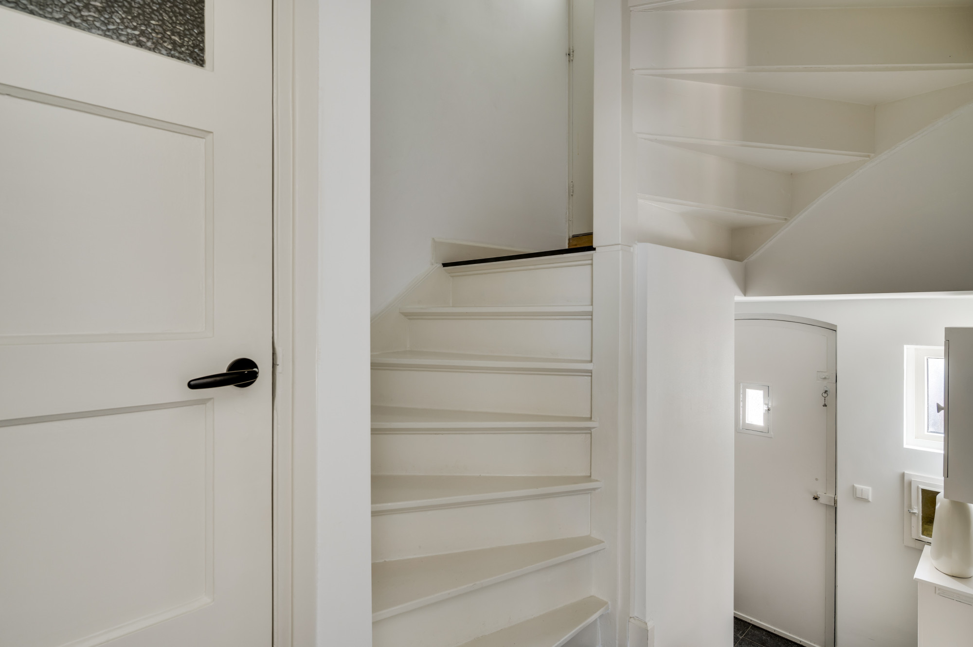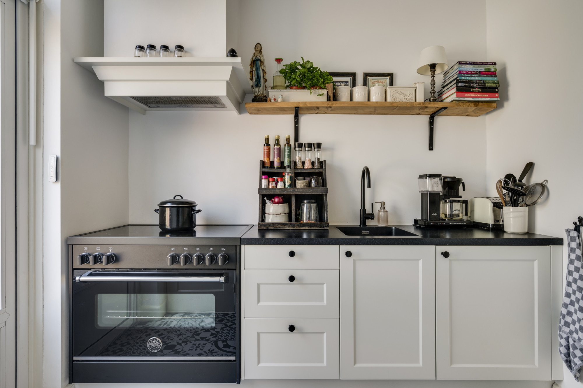 De hal geeft toegang tot het souterrain, de moderne toiletruimte met zwevend toilet, de keuken en de woonkamer. De woonkamer met schouwpartij is heerlijk licht dankzij de grote schuifpui naar de tuin en is afgewerkt met een mooie eiken parketvloer. Een vaste muurkast zorgt voor extra opbergruimte. De keuken biedt een moderne opstelling en is uitgerust met een inductiekookplaat, afzuigkap, oven en een koelkast. Ook vanuit de keuken is de tuin bereikbaar.