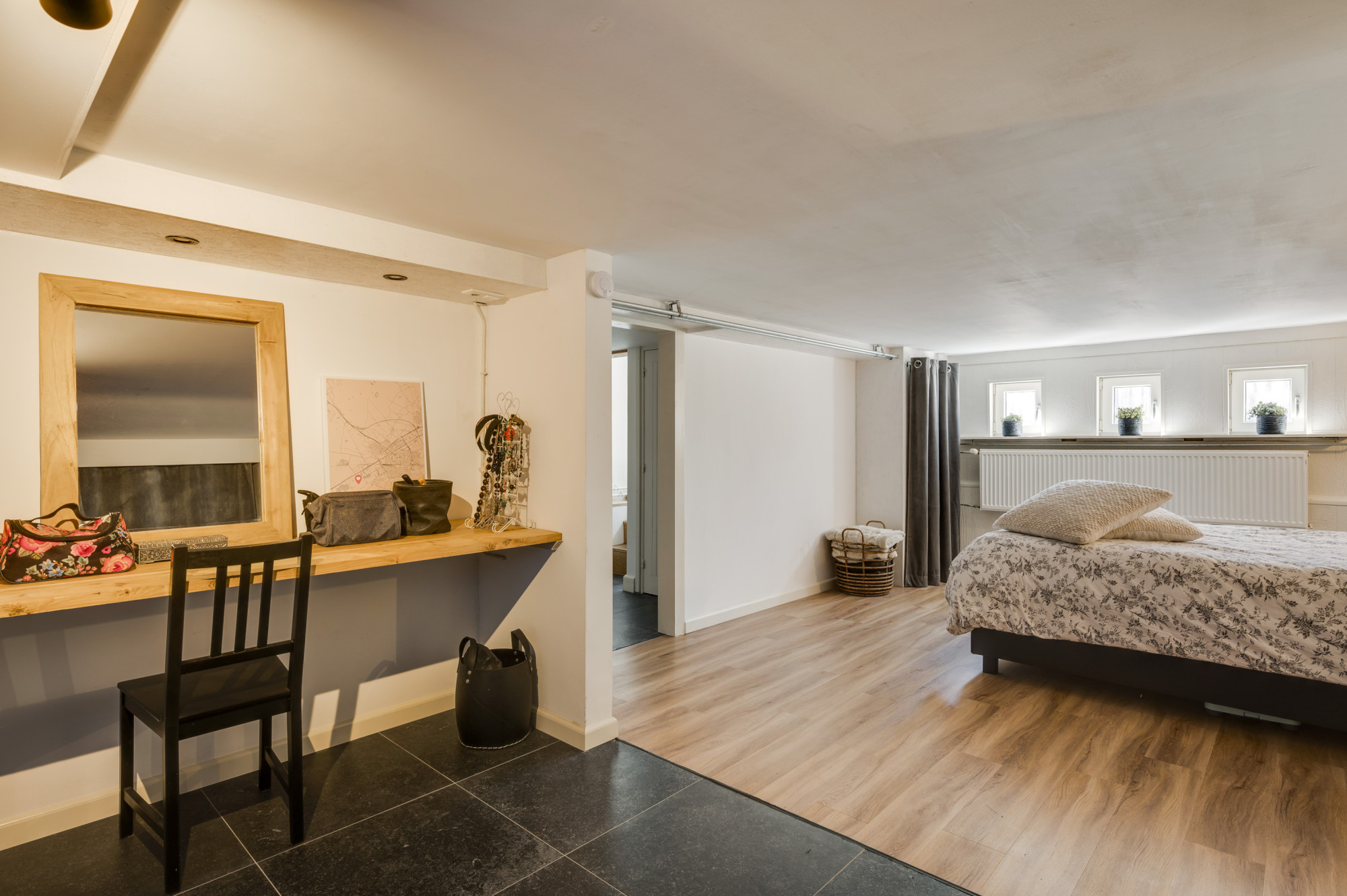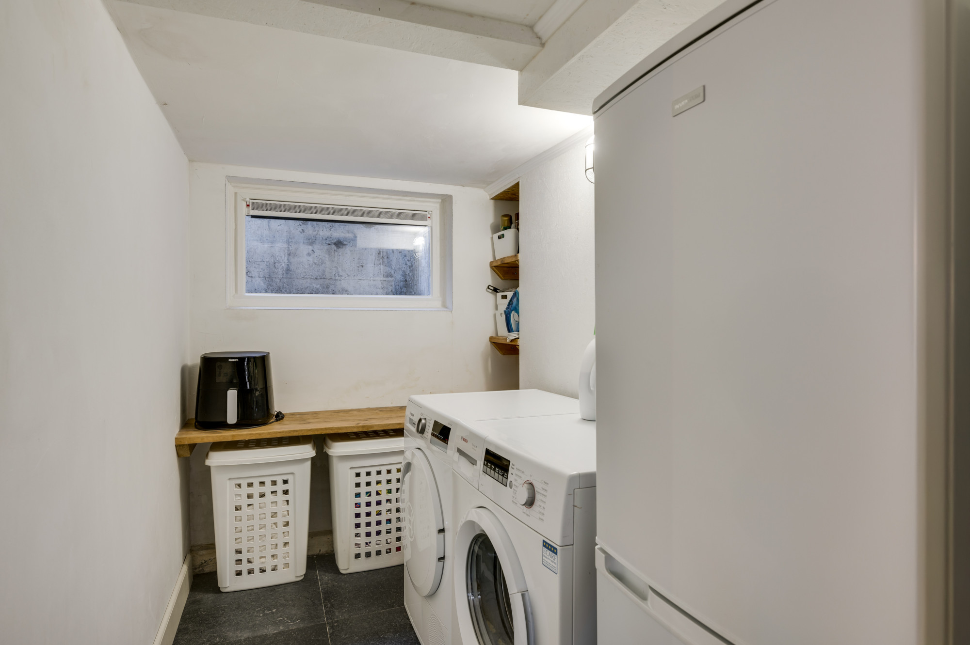 Via de hal bereik je het tussenportaal met een vaste bergkast. Aangrenzend ligt een royale multifunctionele 1e (slaap)kamer, die ook ideaal te gebruiken is als werk-, hobby- of speelkamer. Daarnaast is er een praktische waskamer met de witgoedaansluitingen. Deze woonlaag is voorzien van een pvc vloer en tegelvloer.