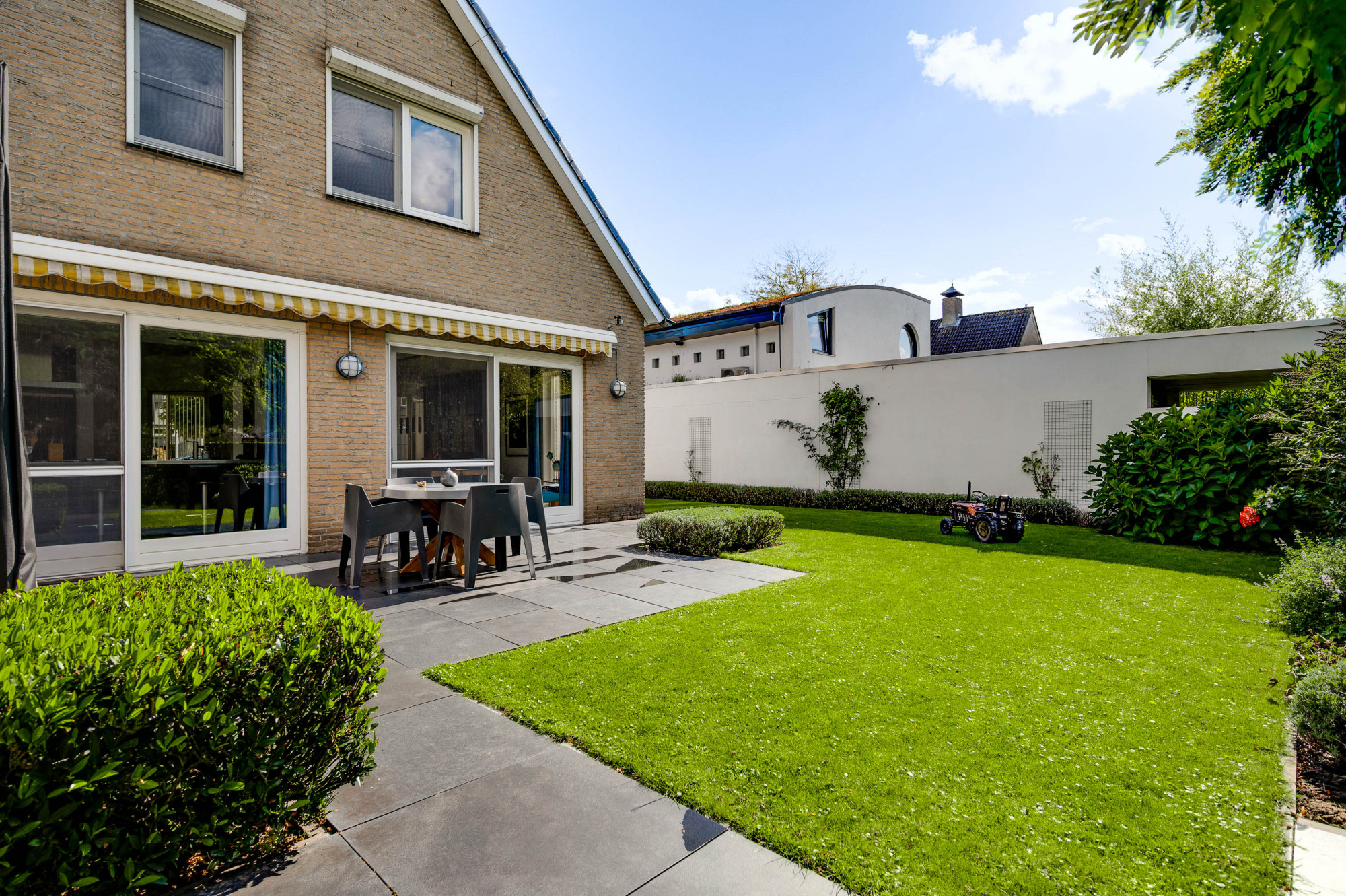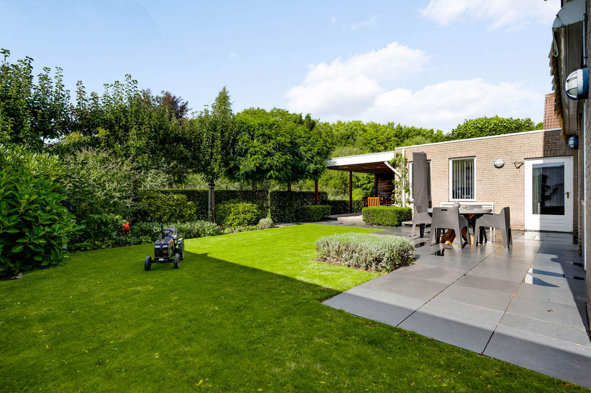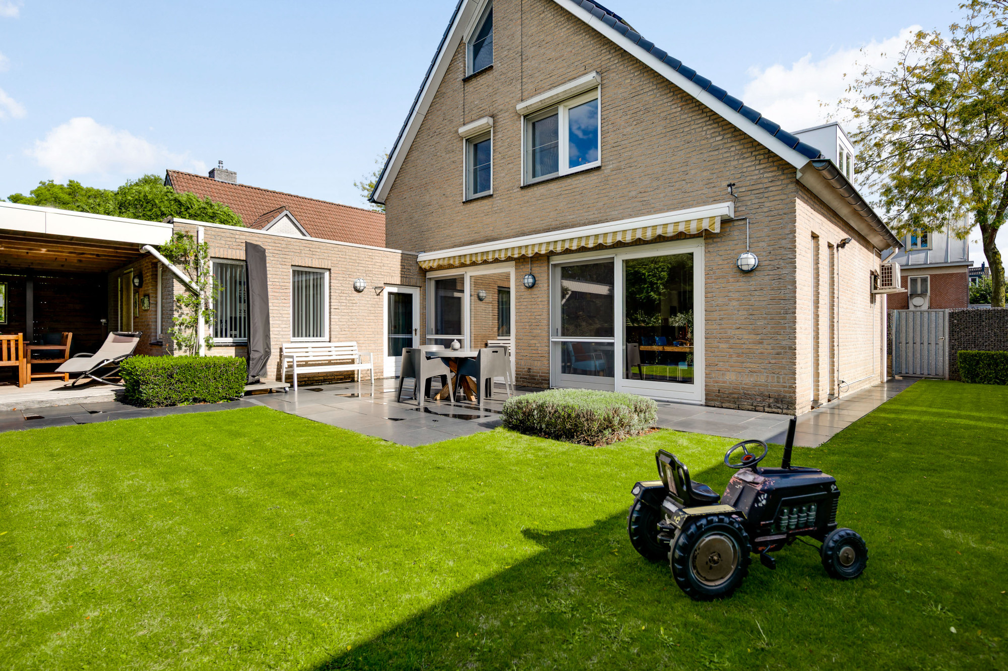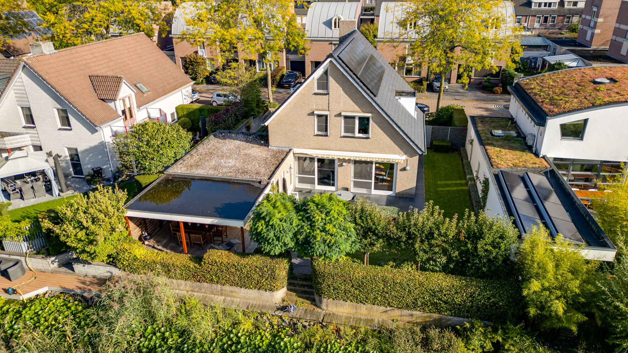 Aan de voorzijde ligt een verzorgde tuin met gazon en een looppad dat via een achterom toegang biedt tot de achtertuin. De oprit biedt plaats voor meerdere auto’s en een autolader en leidt naar de inpandige garage met een extra loopdeur. De achtertuin is fraai aangelegd met gazon, plantenborders, een ruime houten overkapping en een breed elektrisch zonnescherm, zodat u hier in alle rust en privacy kunt genieten van het buitenleven aan het water.