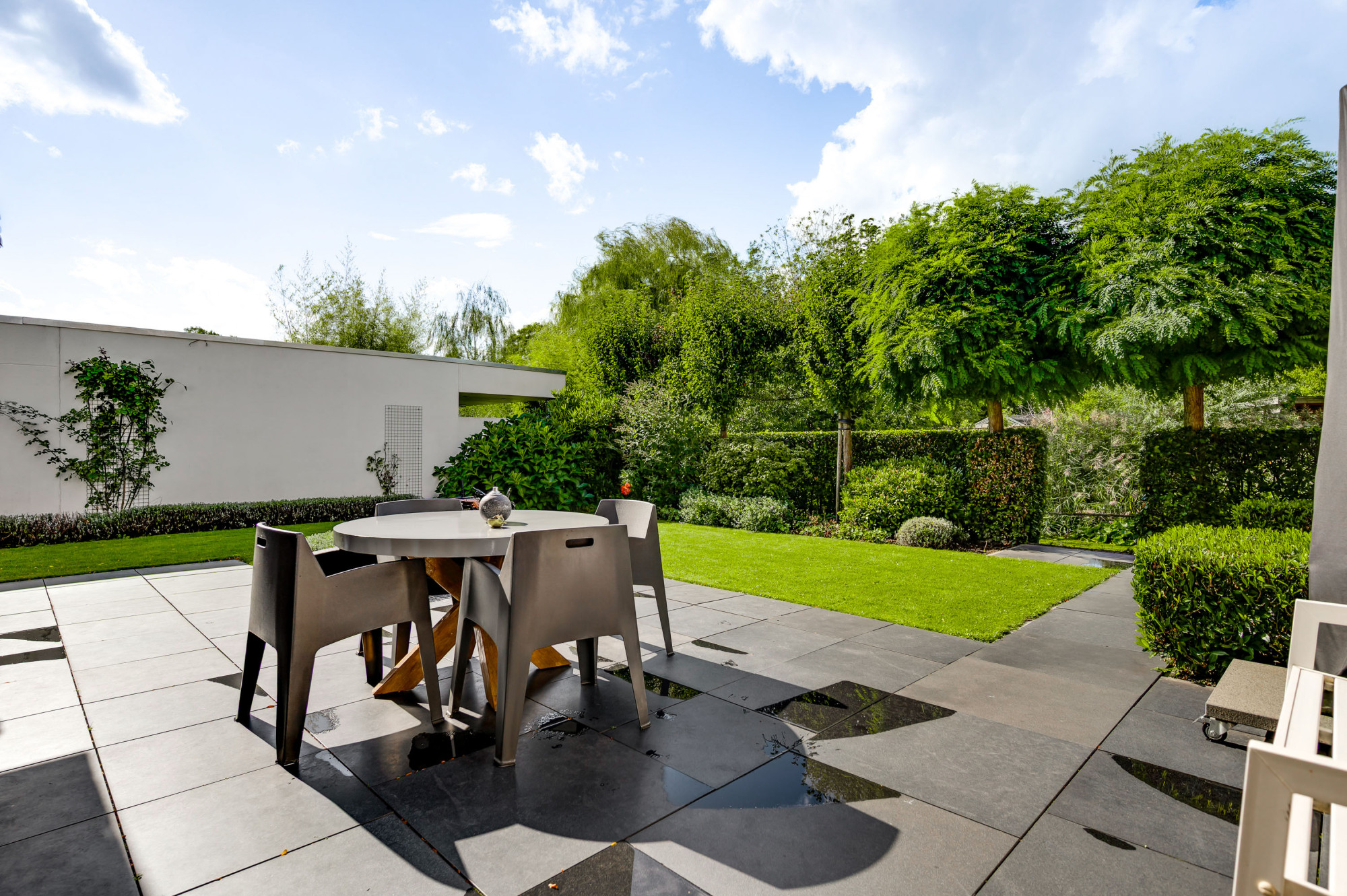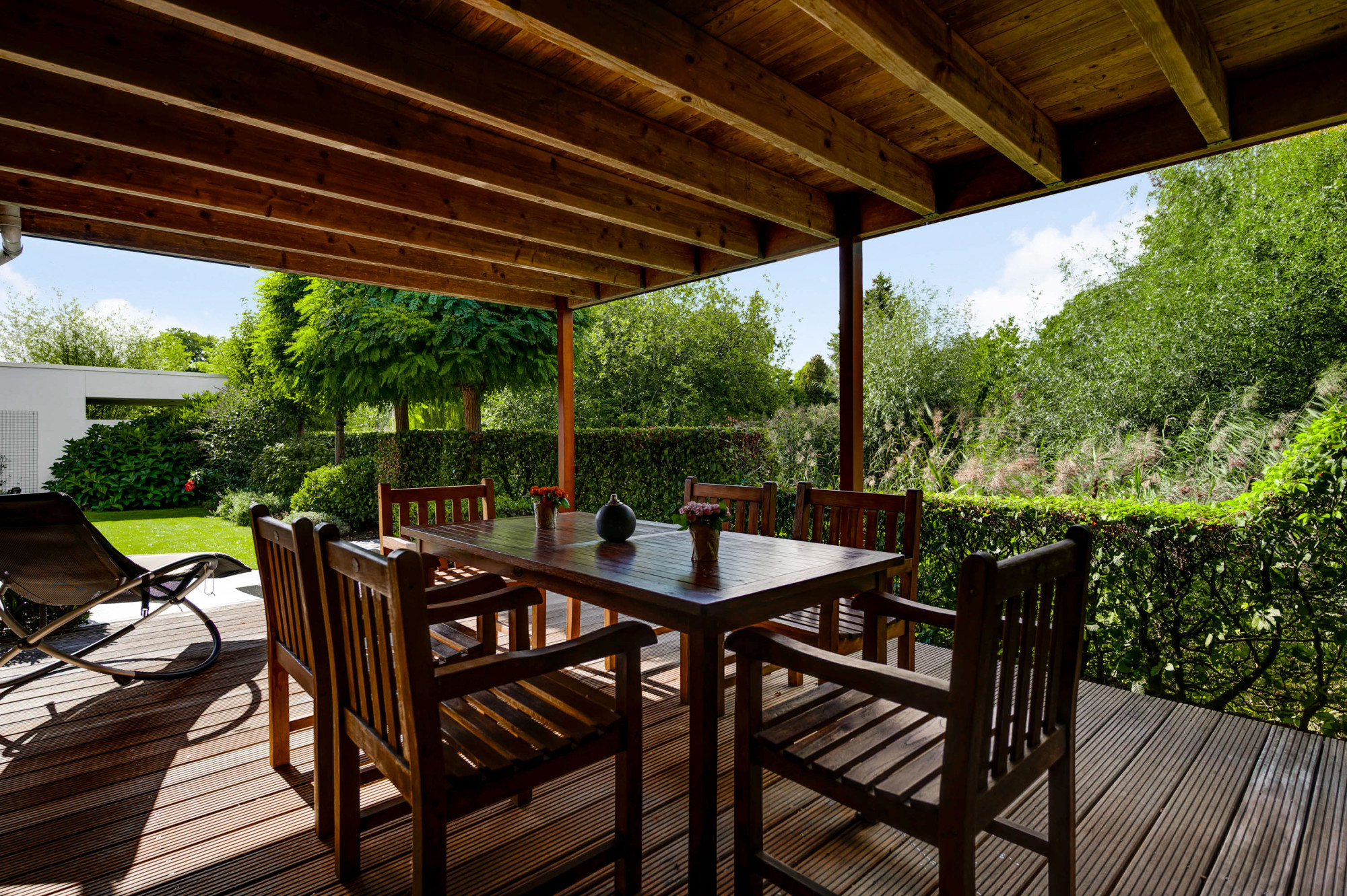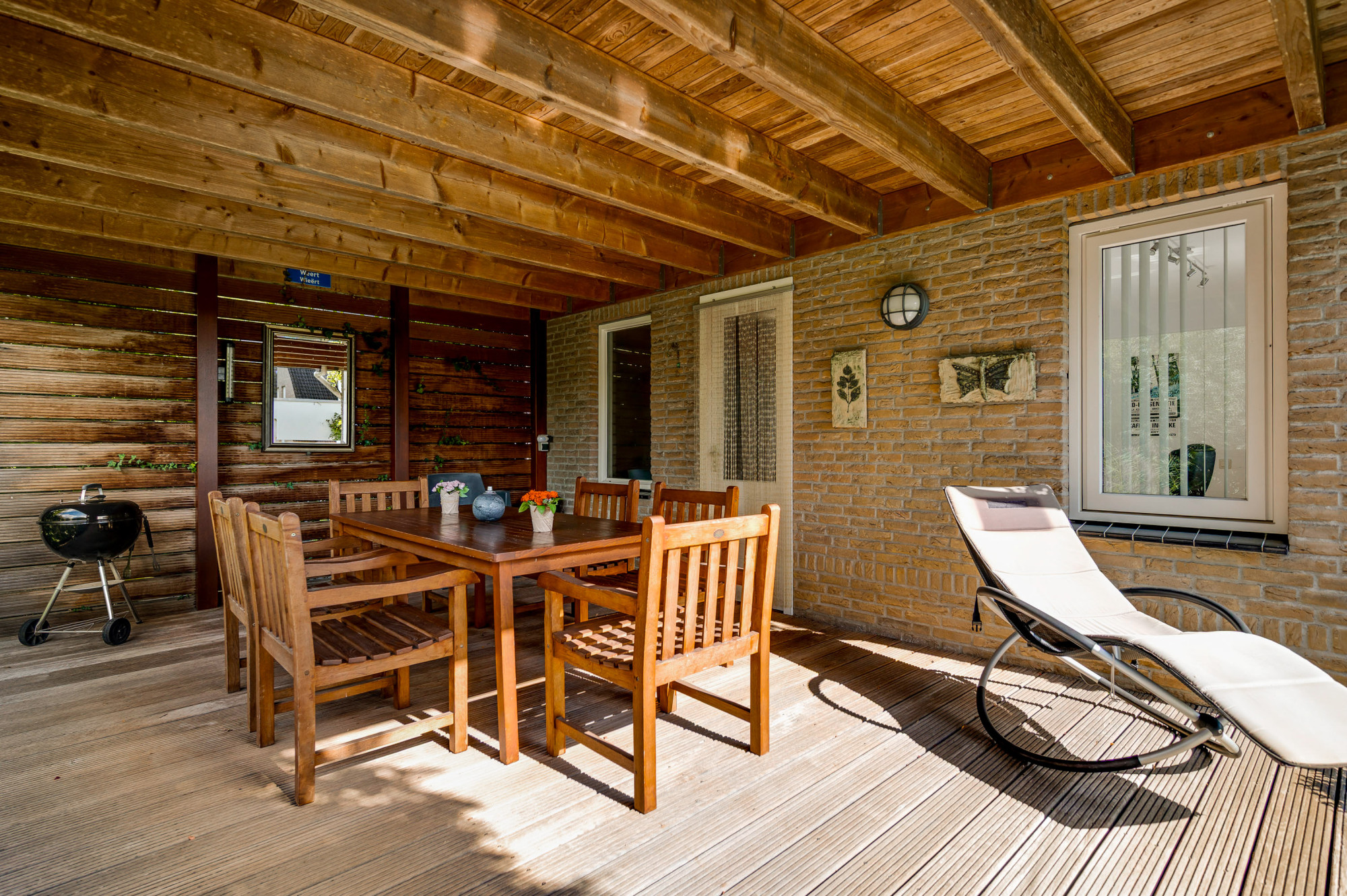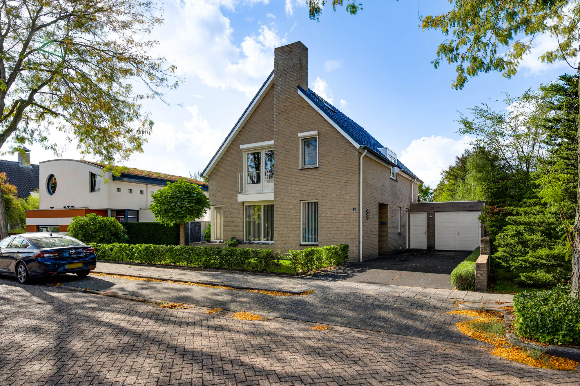 Aan de voorzijde ligt een verzorgde tuin met gazon en een looppad dat via een achterom toegang biedt tot de achtertuin. De oprit biedt plaats voor meerdere auto’s en een autolader en leidt naar de inpandige garage met een extra loopdeur. De achtertuin is fraai aangelegd met gazon, plantenborders, een ruime houten overkapping en een breed elektrisch zonnescherm, zodat u hier in alle rust en privacy kunt genieten van het buitenleven aan het water.
