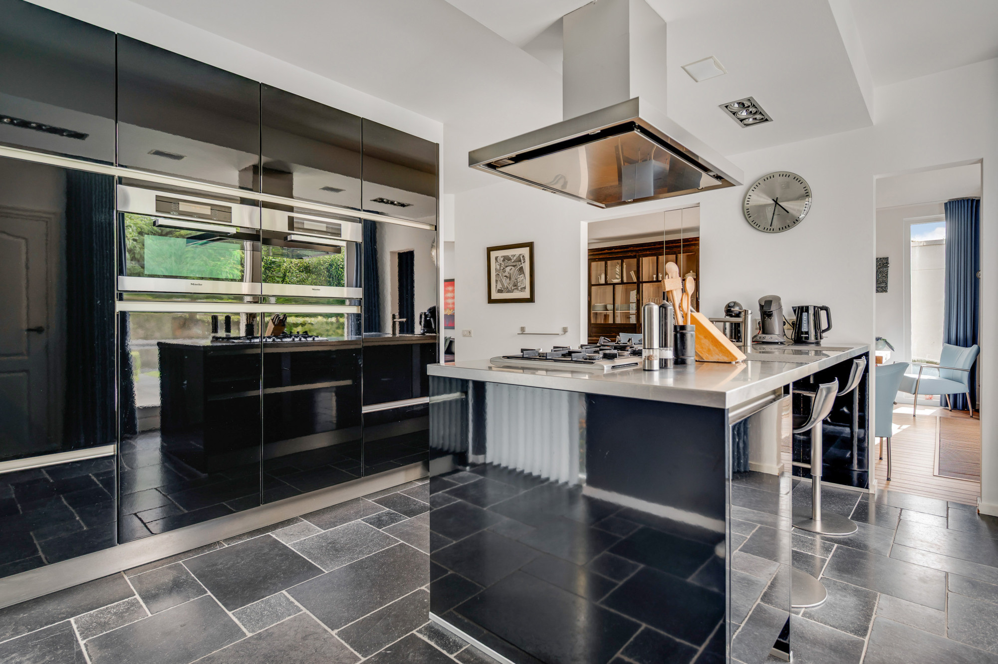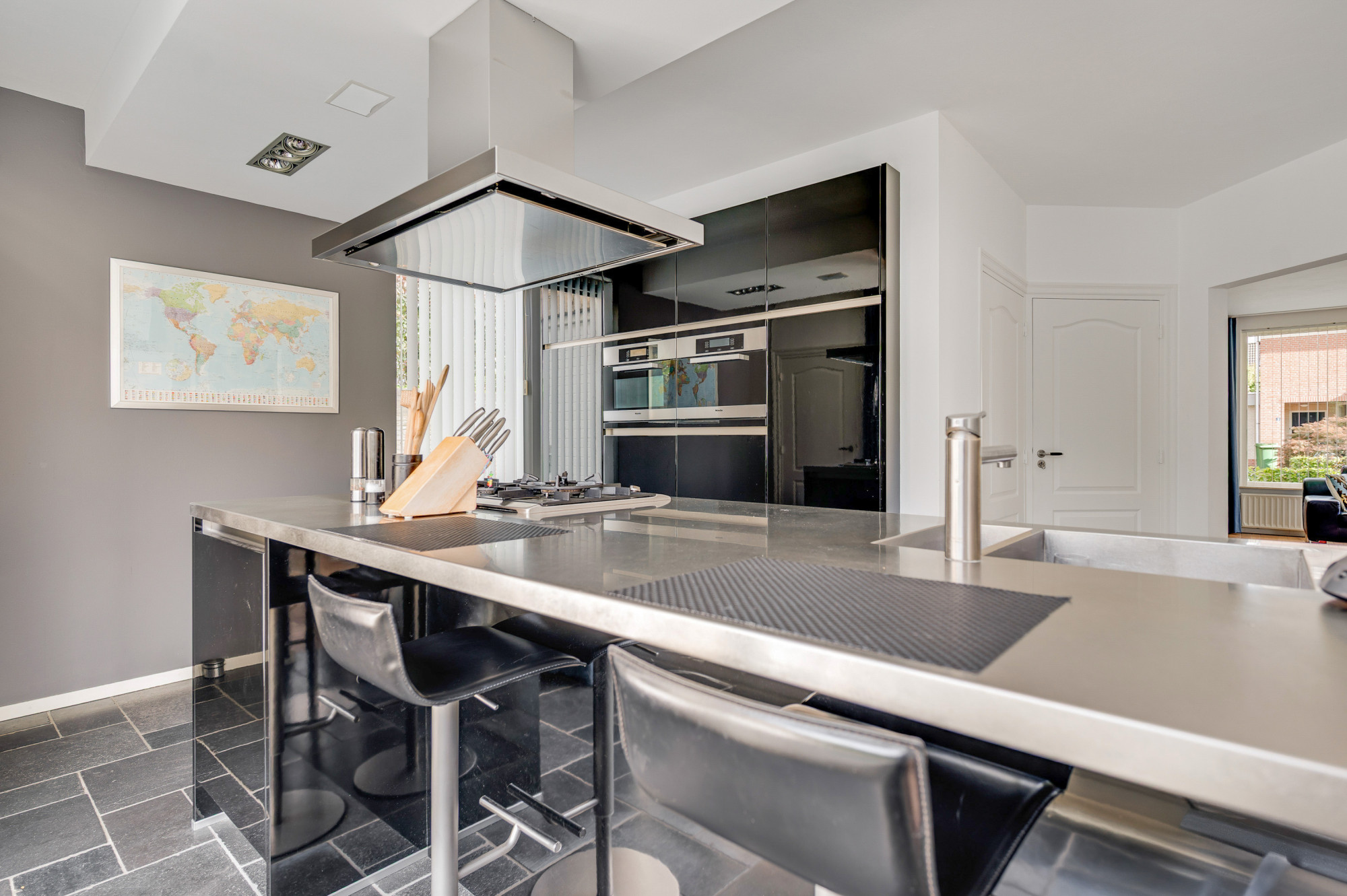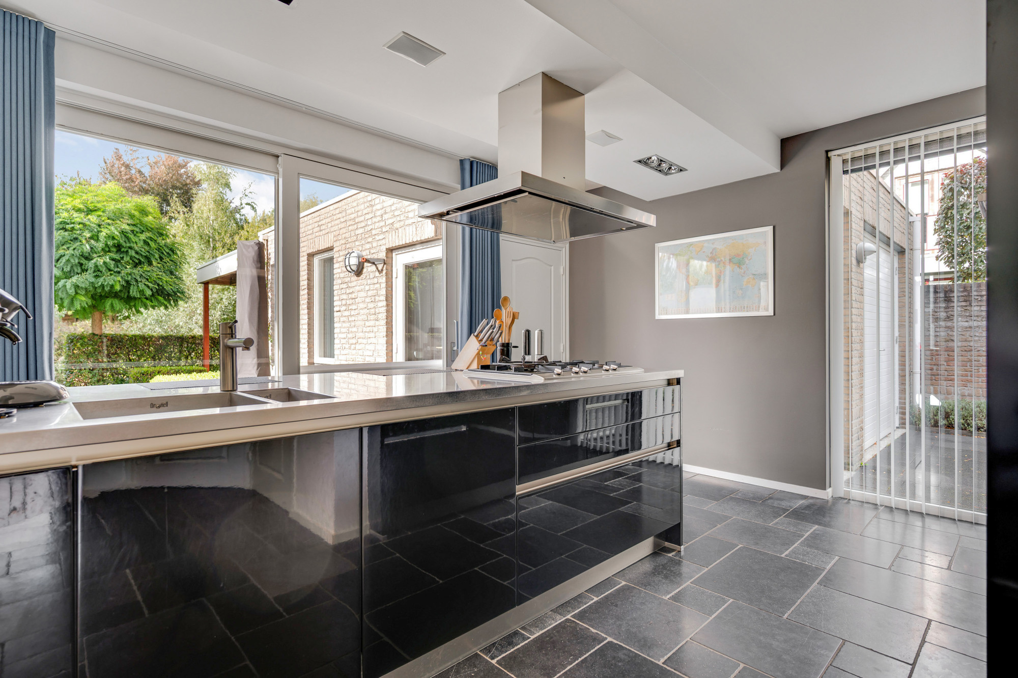 Via de overdekte entree komt u binnen in de ruime ontvangsthal met moderne toiletruimte met toilet en fonteintje en de trapopgang. De woonkamer is bijzonder royaal, voorzien van een houten parketvloer en dankzij de vele ramen heerlijk licht. Via een schuifpui is er direct toegang tot de tuin en de ruimte is voorzien van een airco. De riante keuken grenst via meerdere doorgangen aan de woonkamer en is ingericht met een luxe opstelling in twee delen met een eiland, compleet met 5-pits gasfornuis, afzuigkap, combi-oven, stoomoven, koelkast, een vaatwasser en een praktische kastenwand. Een barretje met zitgedeelte maakt de keuken extra gezellig. Ook vanuit de keuken is er via een schuifpui toegang tot de tuin. Verder vindt u op de begane grond een trapkast, een bijkeuken met witgoedaansluitingen en een portaal dat toegang biedt tot de tuin, garage én de multifunctionele gelijkvloerse extra kamer. Deze laatste ruimte is momenteel in gebruik als kantoorkamer, maar kan ook perfect dienen als speelkamer, hobbyruimte of gelijkvloerse 1e slaapkamer. De inpandige L-vormige garage beschikt over een poort en een extra loopdeur naar de oprit, alsmede een extra deur naar de overkapping en de tuin. In de garage bevindt zich tevens de cv-installatie (Nefit Ecomline HR, 2007, eigendom).