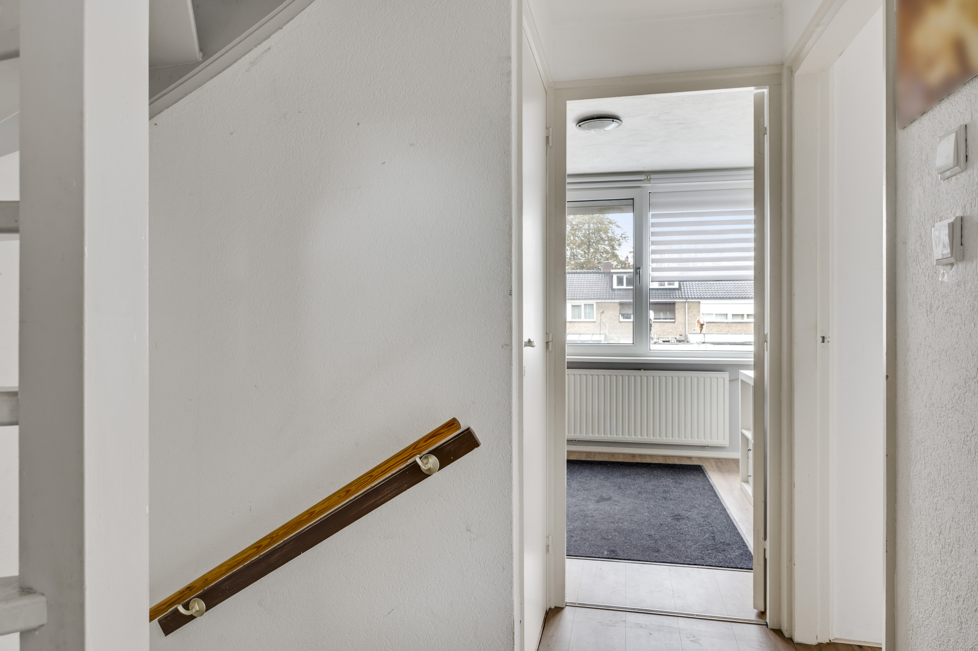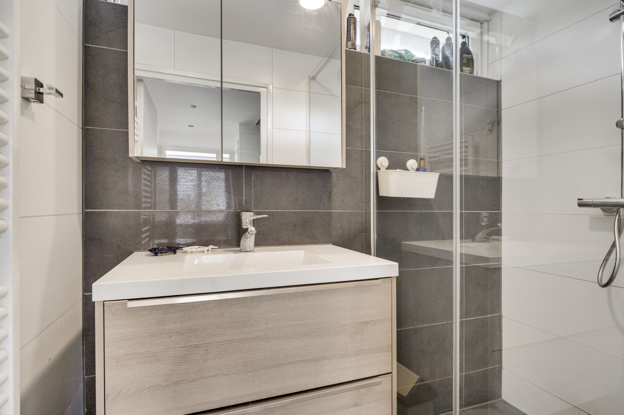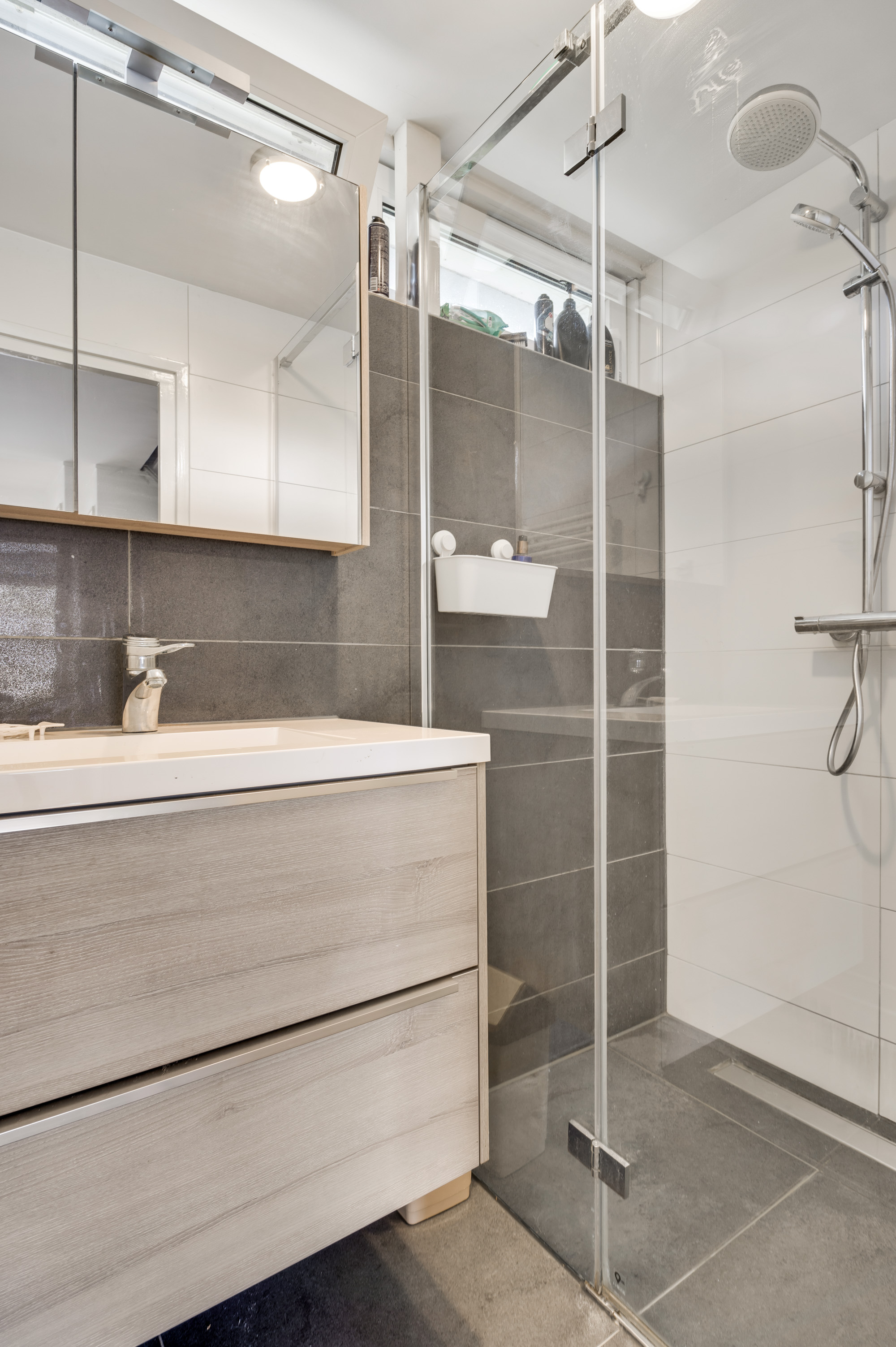 Overloop met toegang tot de eerste 3 slaapkamers en de moderne badkamer. De overloop beschikt over een praktische muurkast. De nette badkamer is in ca. 2019 gemoderniseerd, geheel betegeld en voorzien van een inloopdouche en een wastafel met meubel.