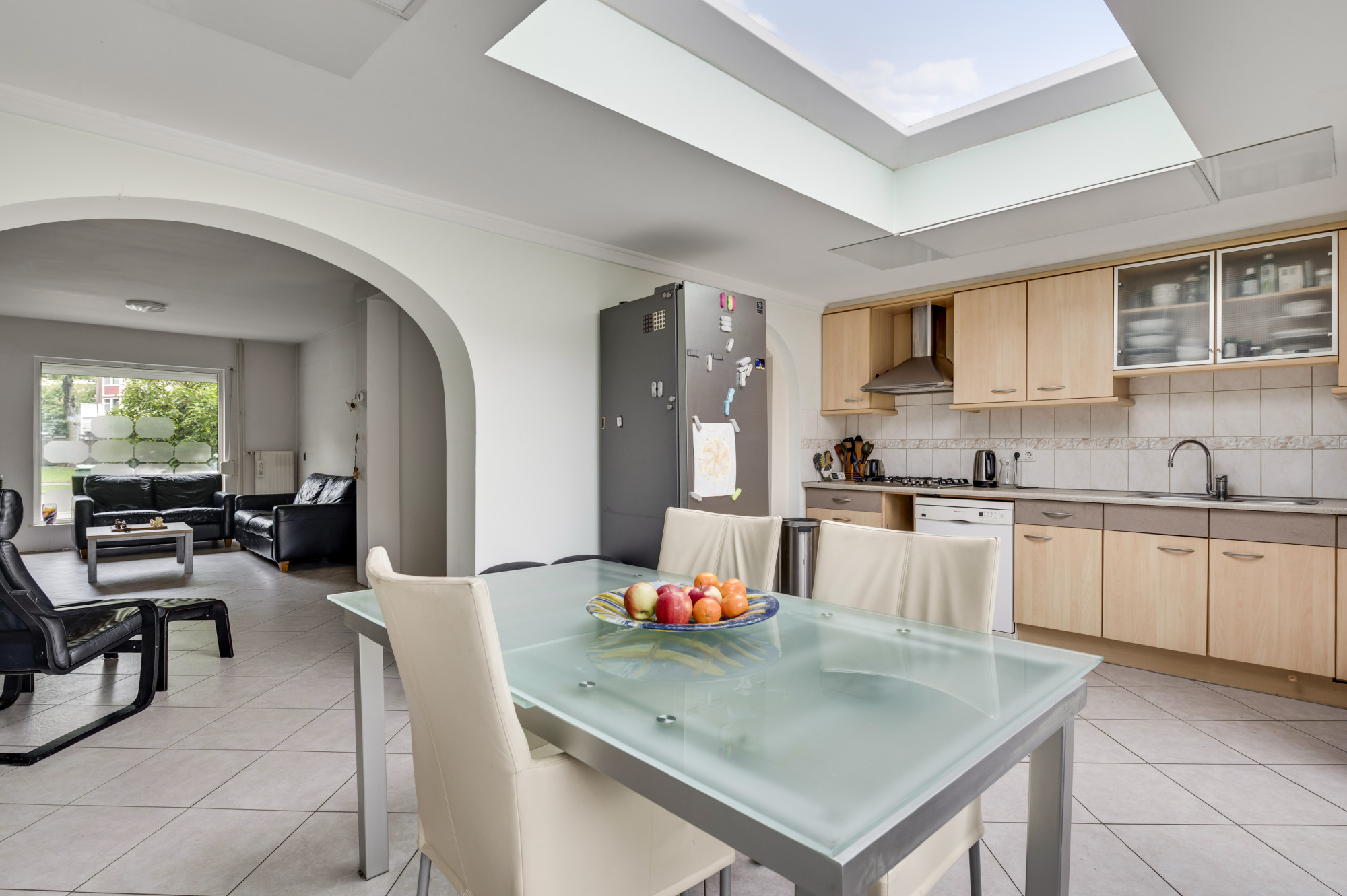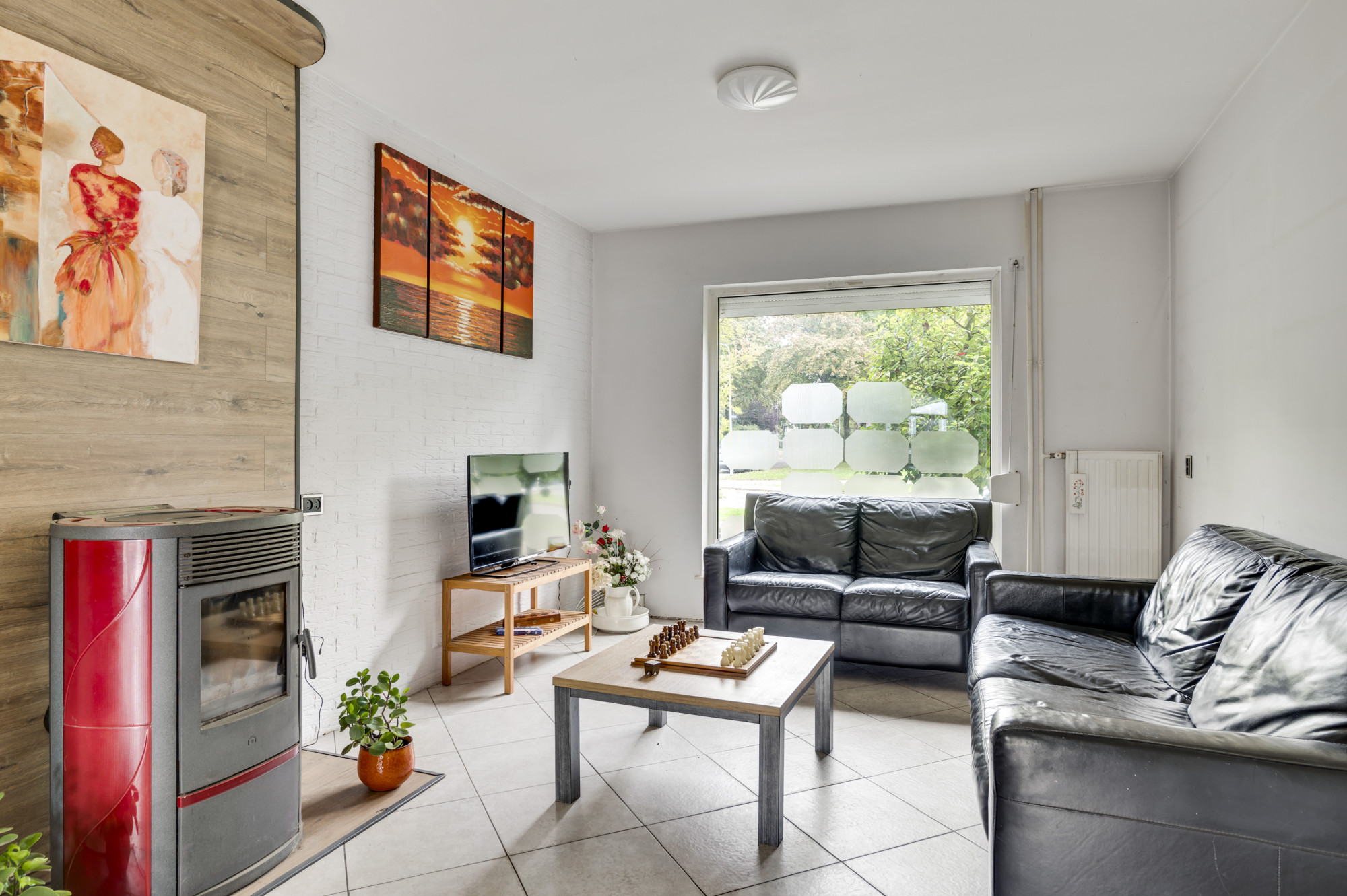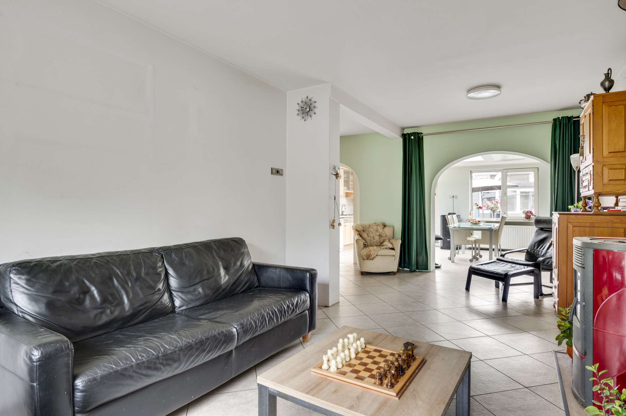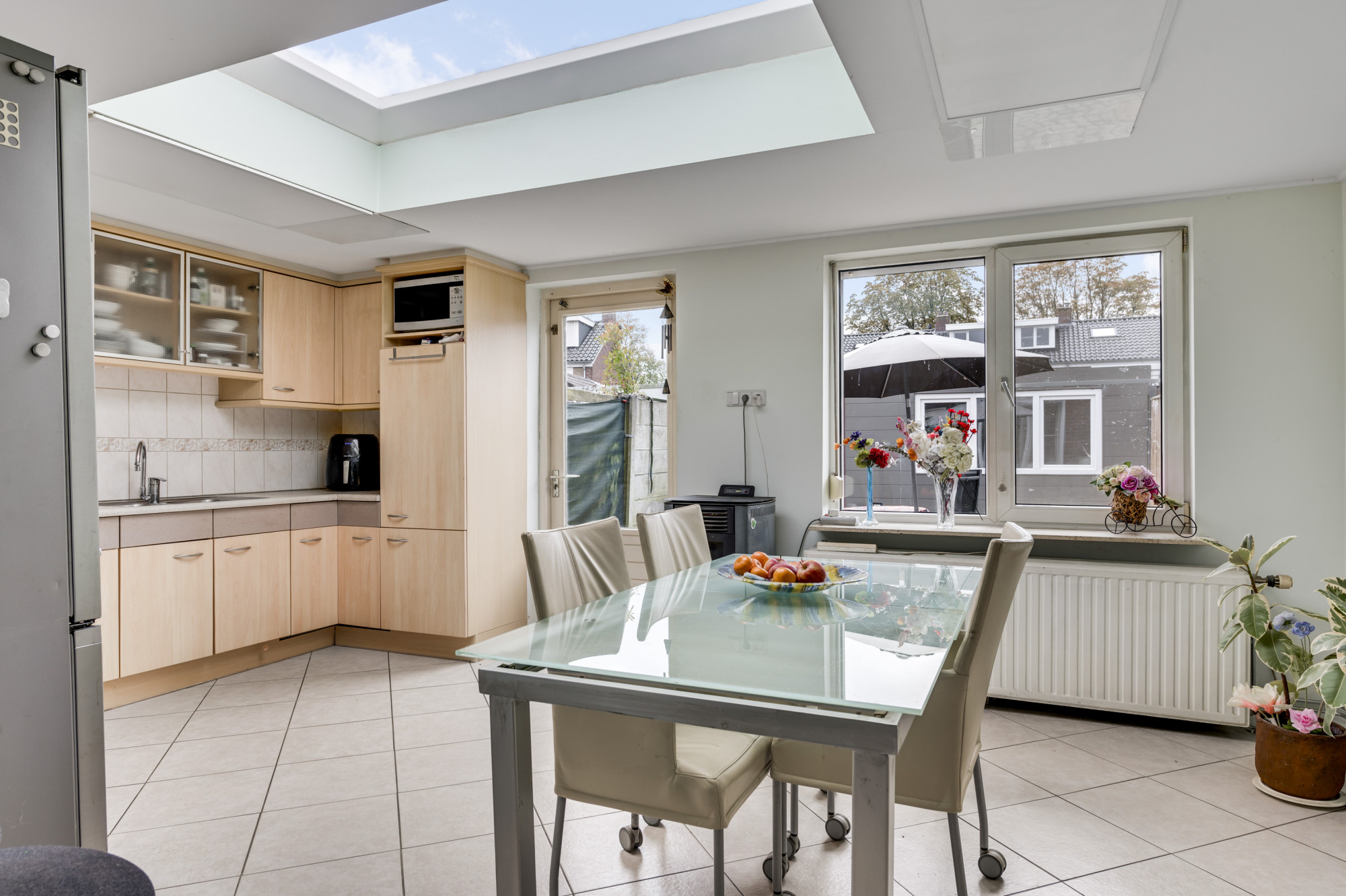 De hal beschikt over een toiletruimte met zwevend toilet, de praktische trapkast en de trapopgang naar de eerste verdieping. De hal biedt tevens toegang tot de royale woonkamer. De L-vormige woonkamer kent veel lichtinval door de grote raampartij en staat in open verbinding met de woonkeuken welke in de aanbouw is gerealiseerd. De keuken biedt een nette, doch eenvoudige combinatie in hoekopstelling en is voorzien van veel bergruimte en inbouwapparatuur, waaronder een gaskookplaat, afzuigkap, close-in boiler en een losse onderbouw vaatwasser. De woonkeuken biedt voldoende ruimte aan een eettafel en geeft middels een loopdeur toegang tot de achtertuin. De begane grond is voorzien van een tegelvloer mét comfortabele vloerverwarming. Tevens is er een pelletkachel in de woonkeuken aanwezig die ter overname wordt aangeboden, indien gewenst (de pelletkachel in de woonkamer gaat mee).
