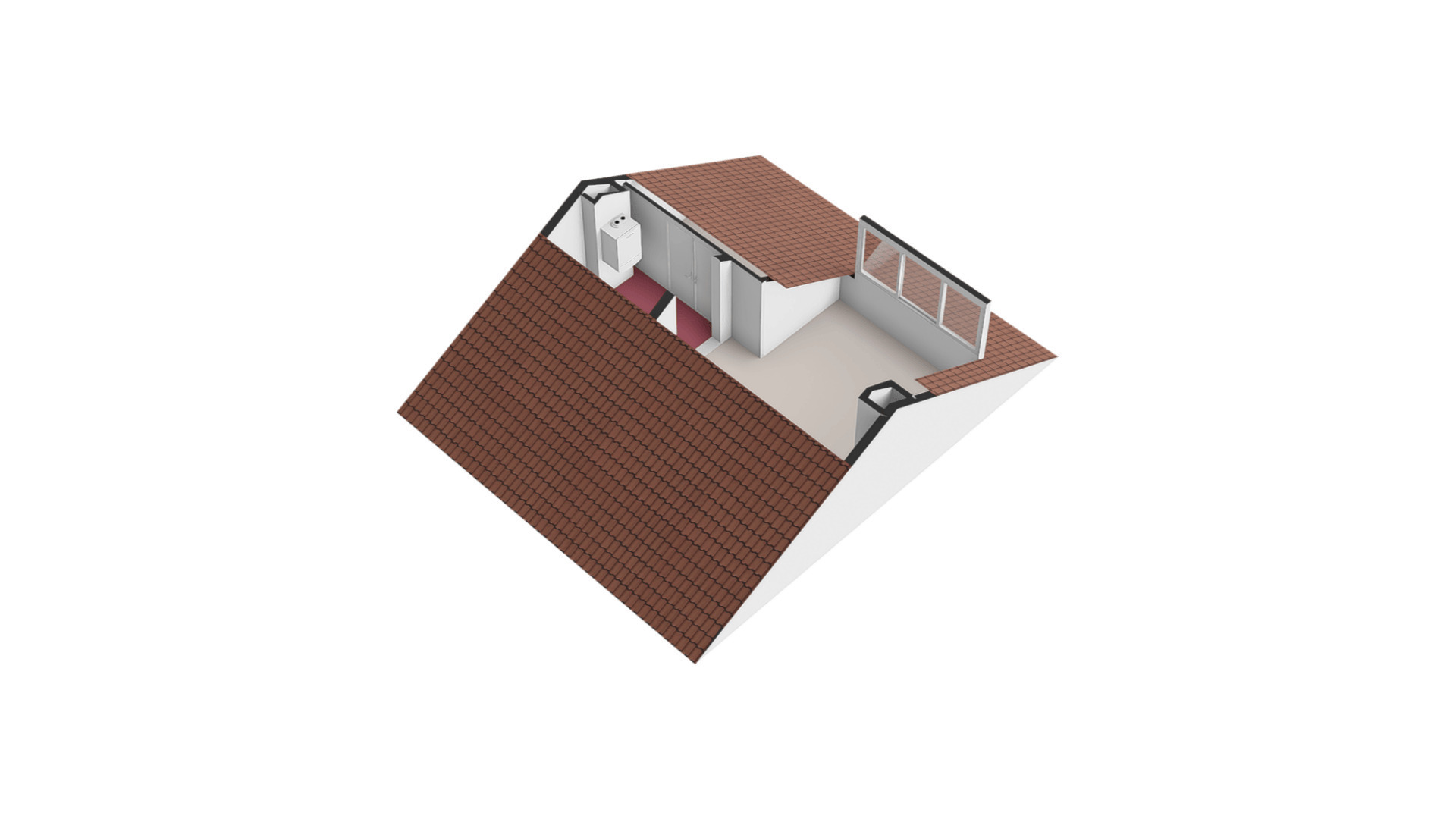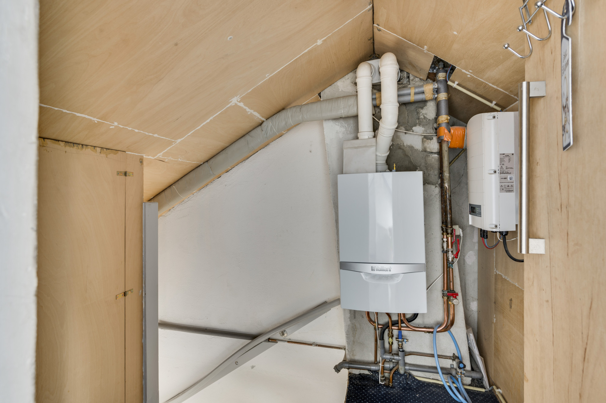Via een vaste trap toegankelijk. Voorportaal met de opstelling van de cv combiketel (Vaillant ecoTEC plus VHR van 2020, eigendom) en omvormer zonepanelen. Vanuit hier is een 4e slaapkamer met dakkapel te bereiken.