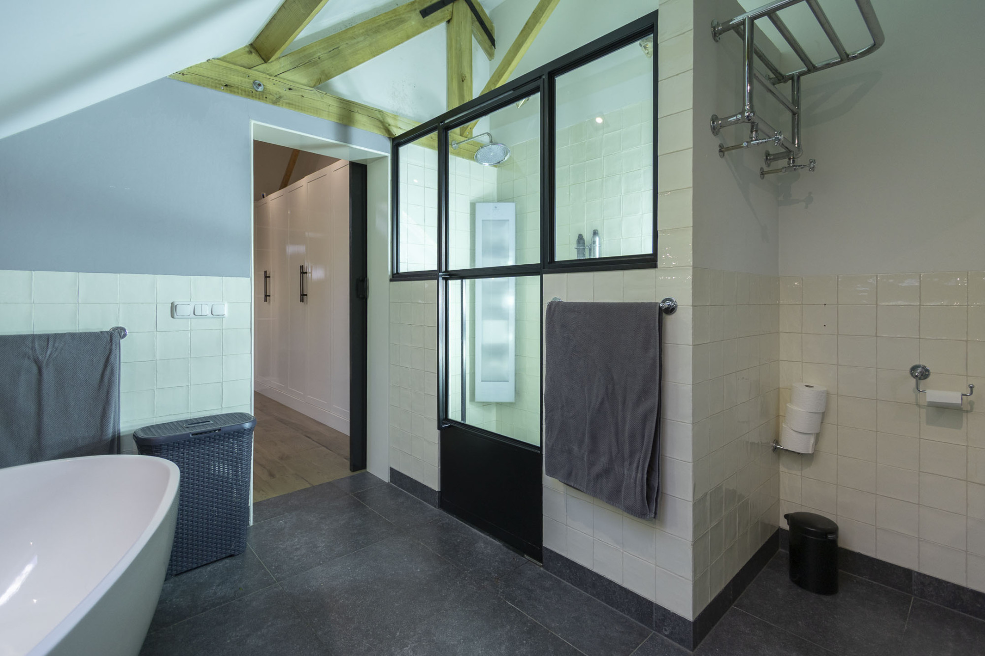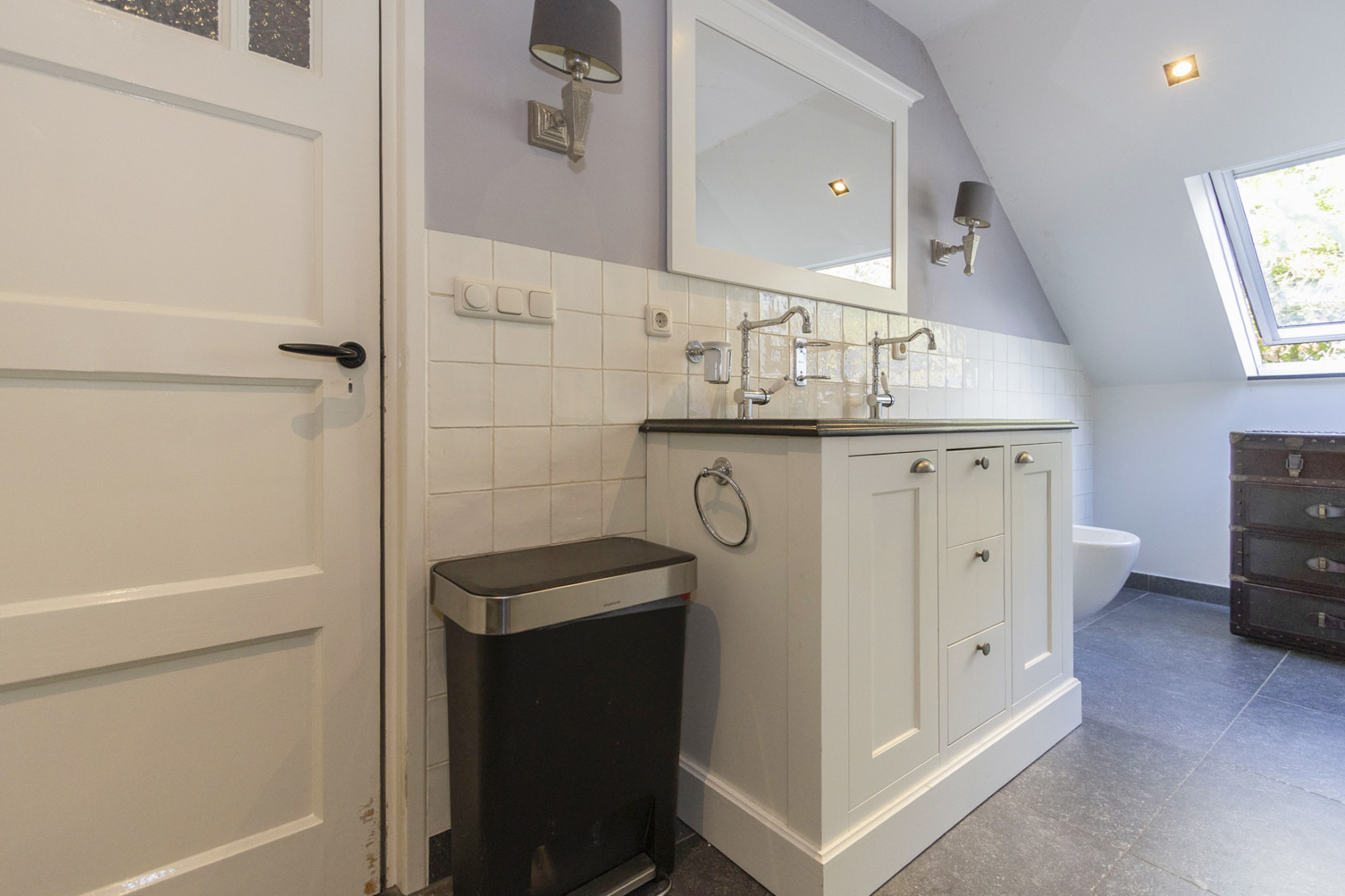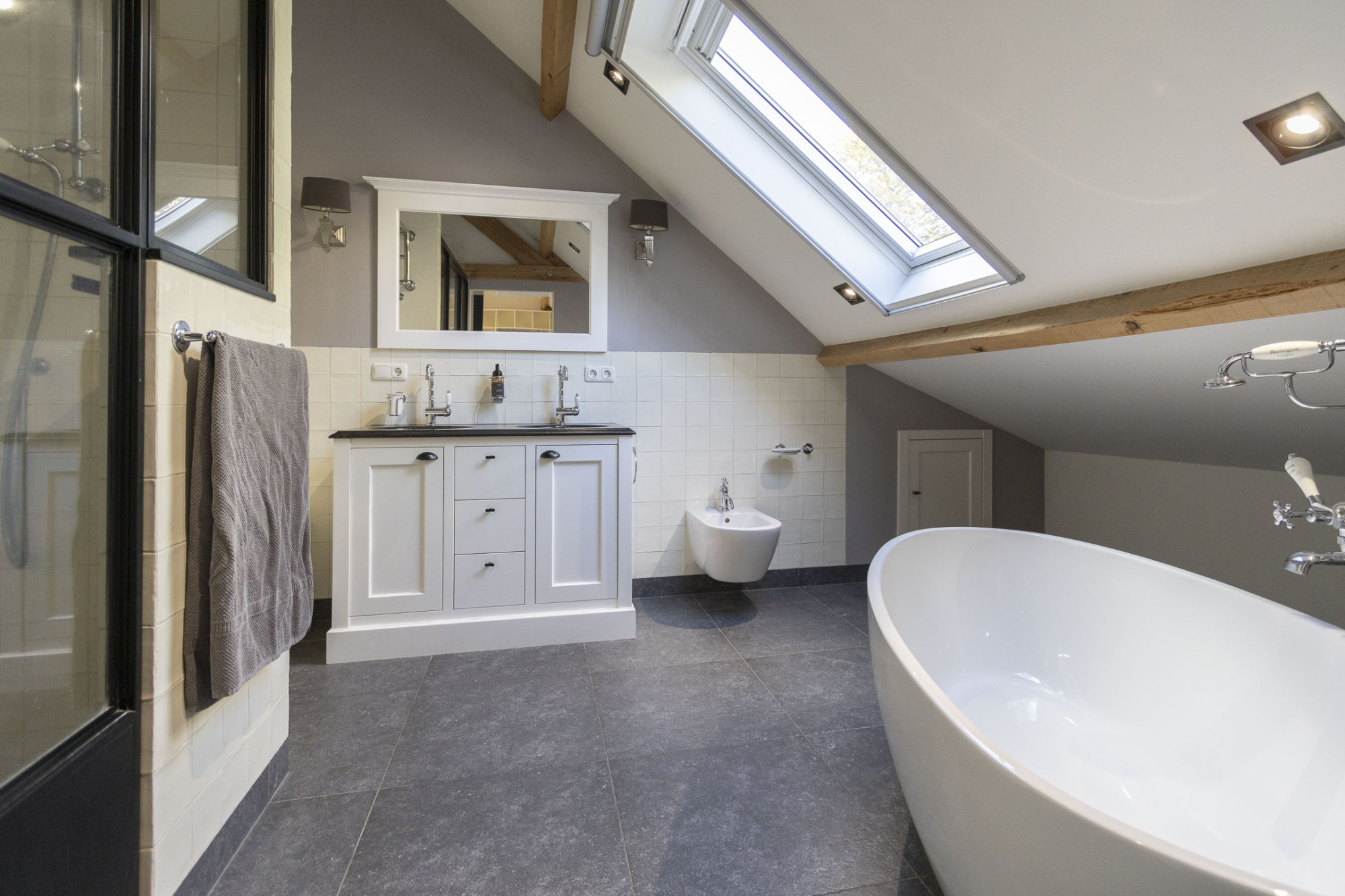 De tweede badkamer is uitgerust in dezelfde stijl met inloopdouche, 2 wastafels, toilet en bidet.