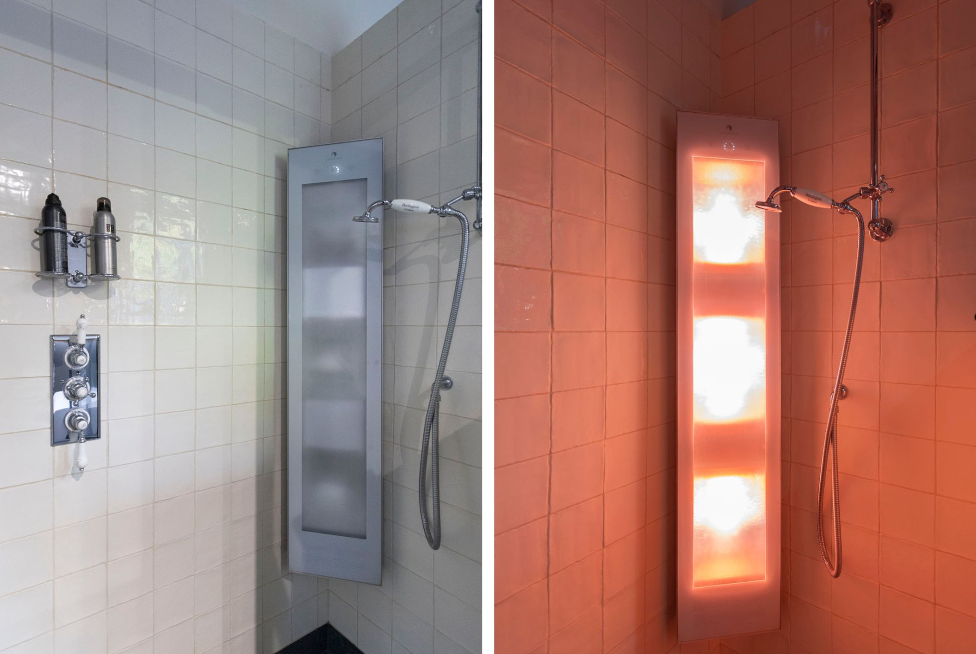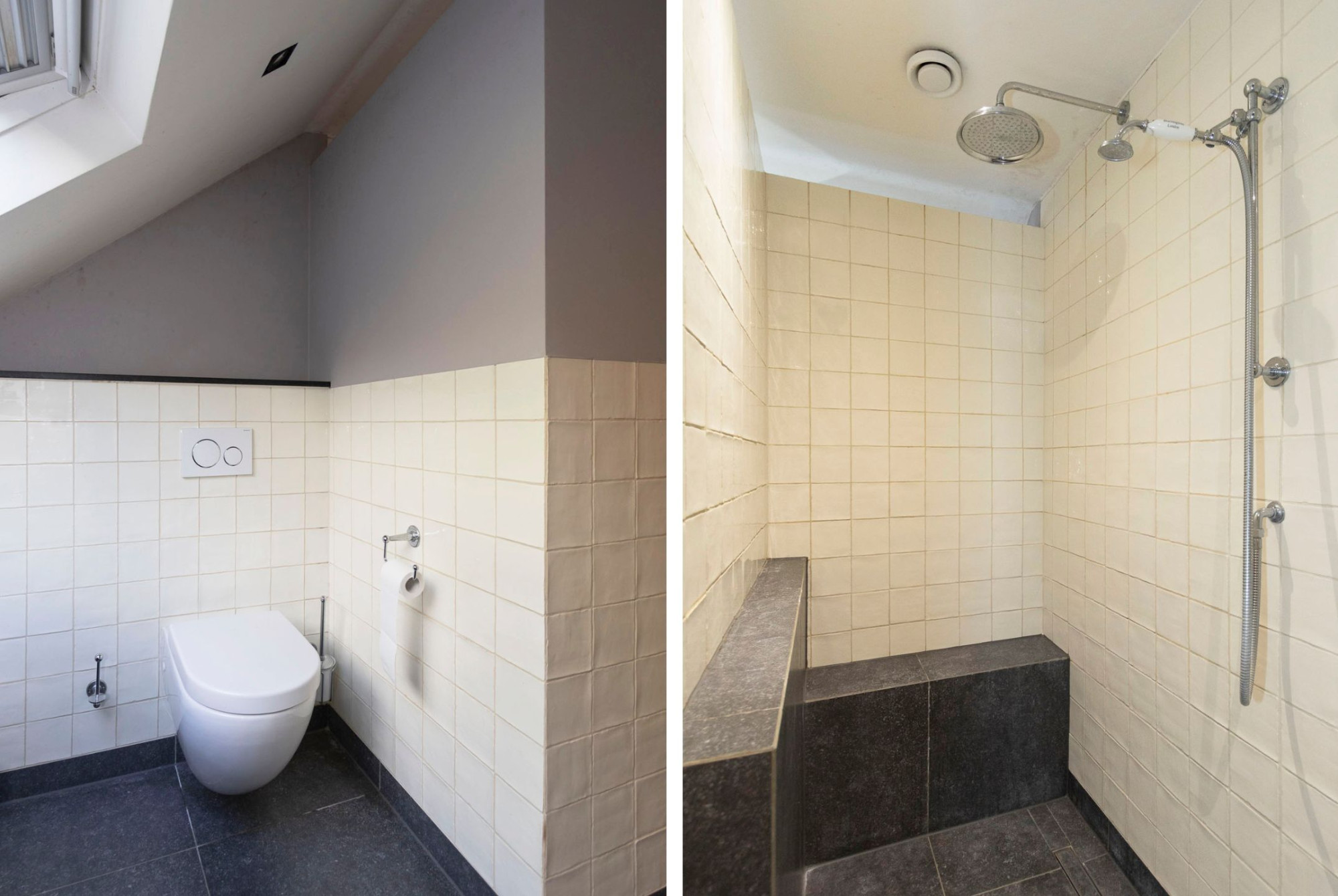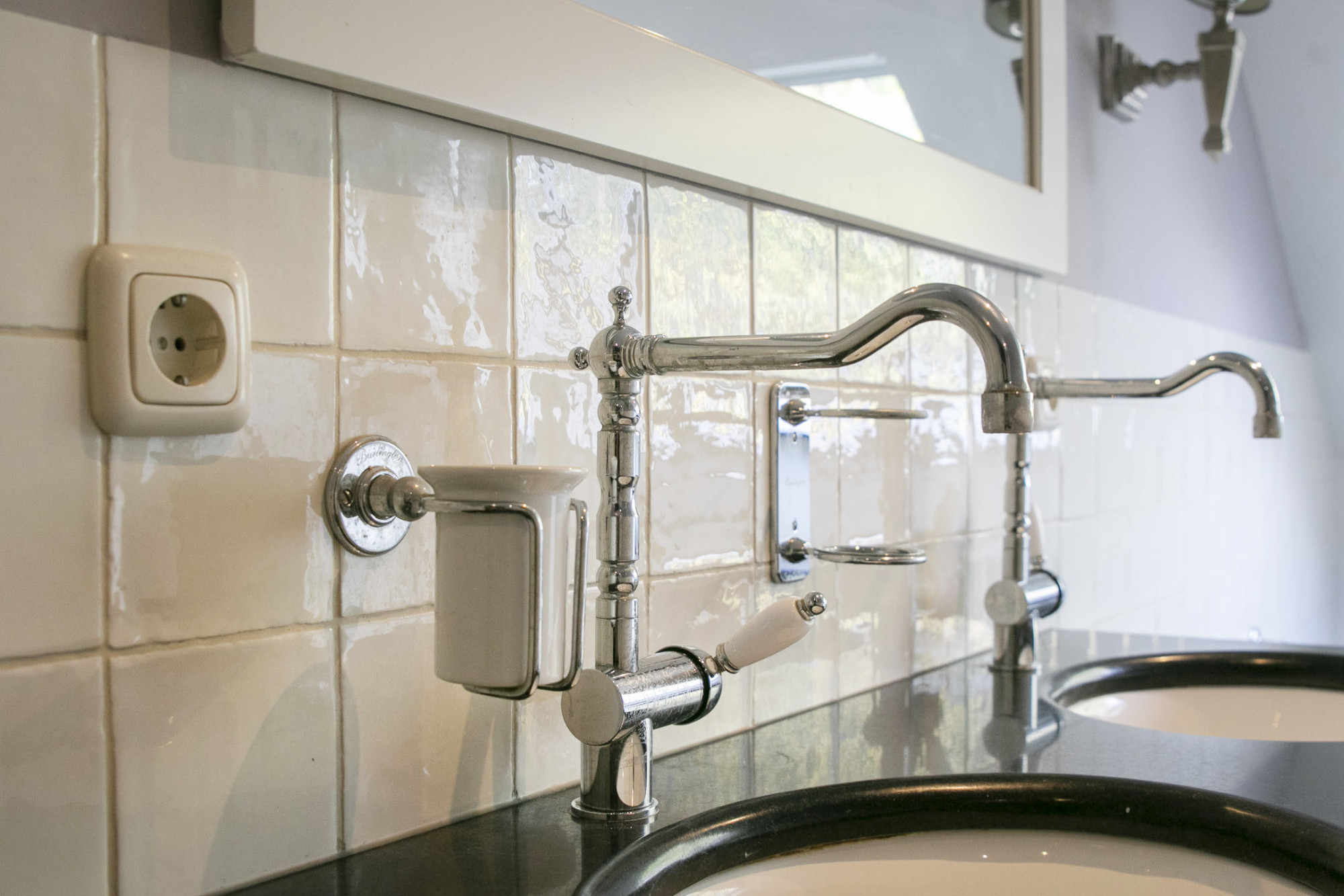 De tweede badkamer is uitgerust in dezelfde stijl met inloopdouche, 2 wastafels, toilet en bidet.