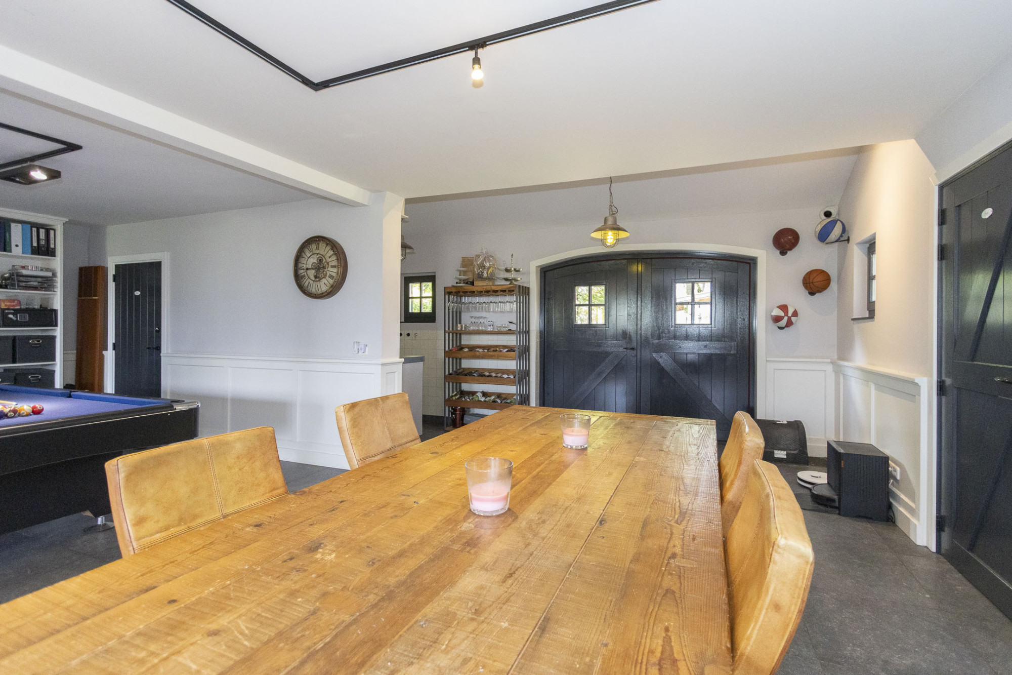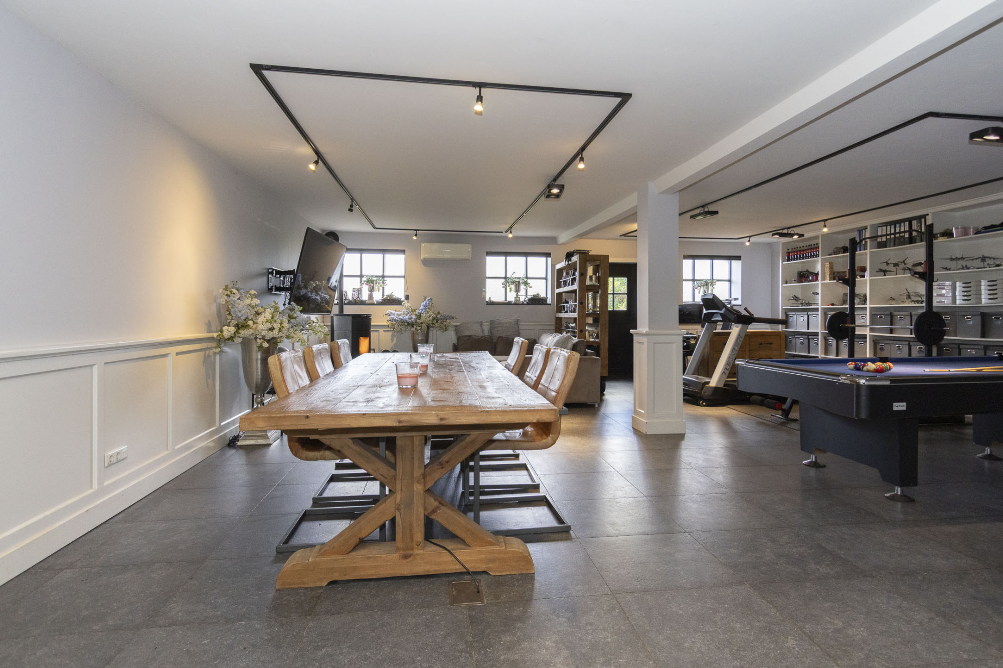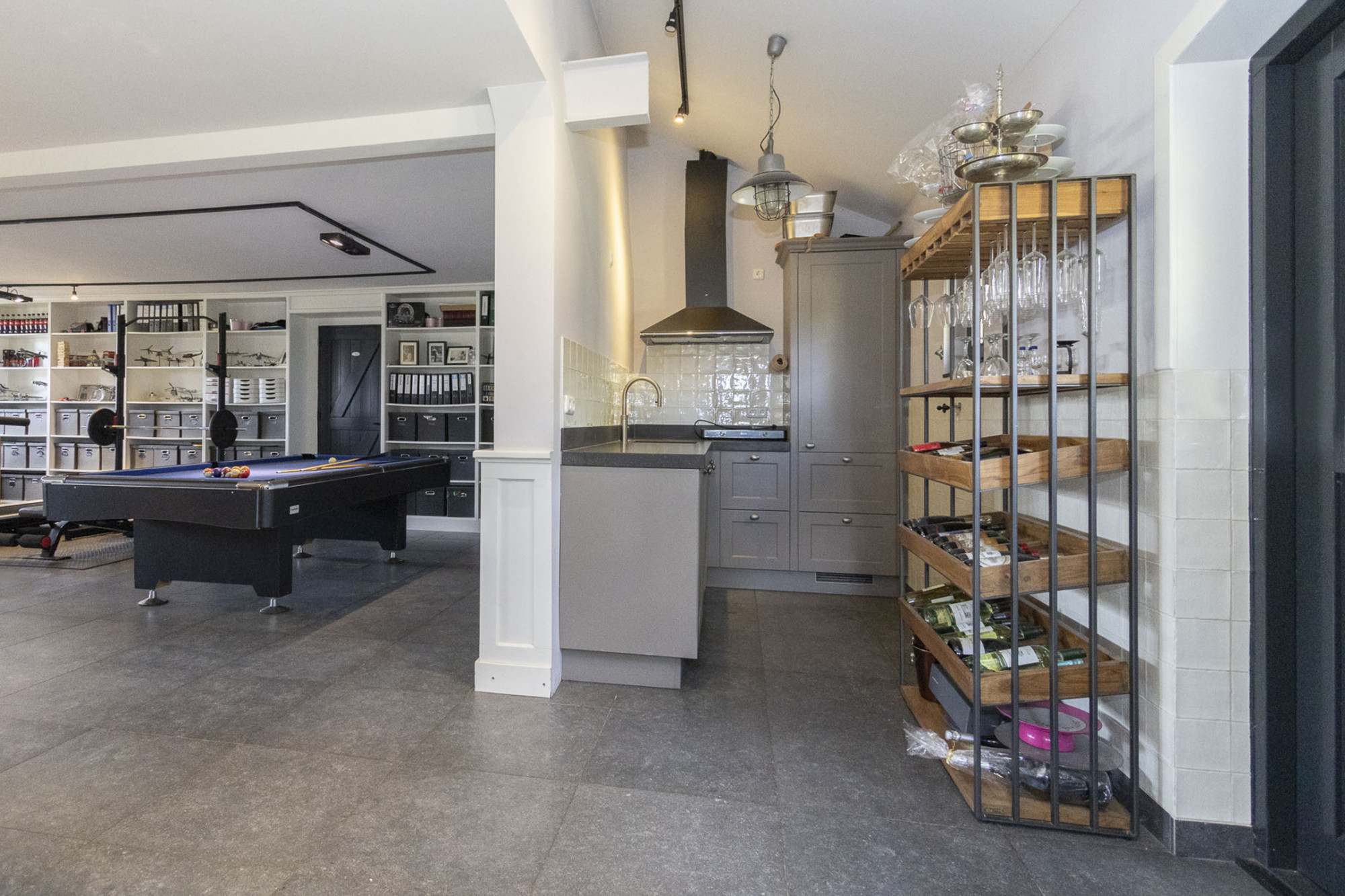 - Multifunctionele ruimte met gym, pooltafel, werkplek en keuken