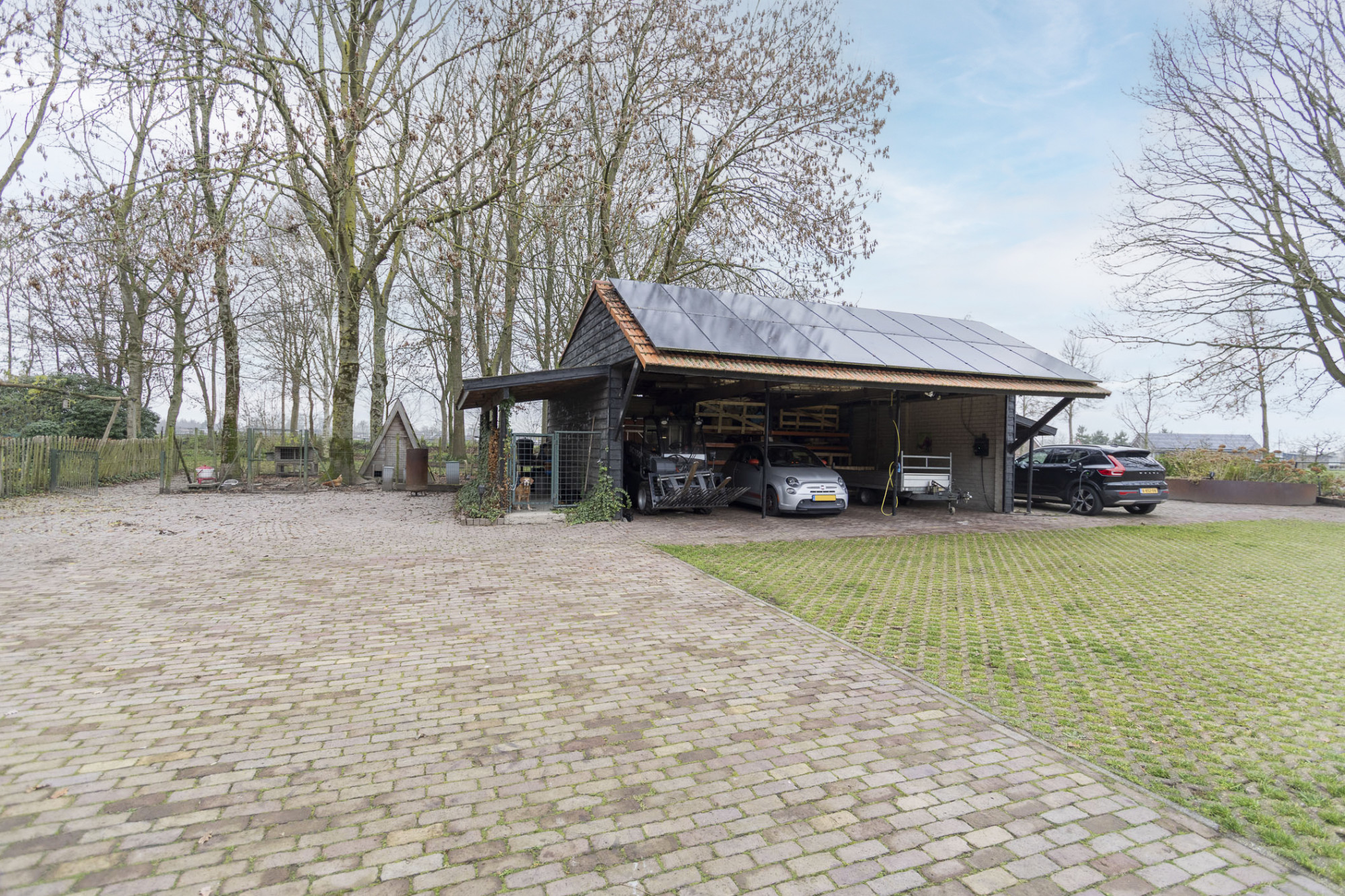 De carport biedt plek voor drie auto’s en extra opslagruimte en laadfuncties.