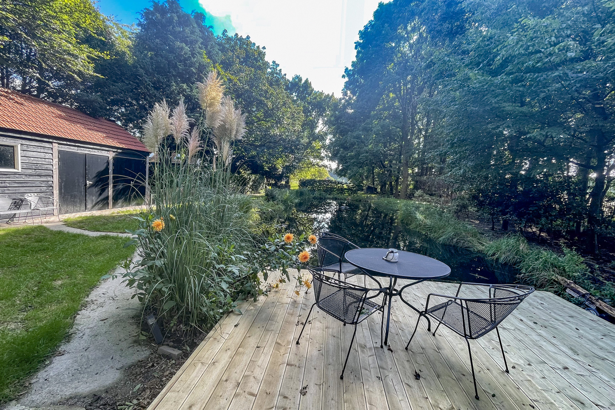 De tuin rondom de woning is een oase van rust. Met circa 8.000 m² aan oppervlak, diverse terrassen, een zwemvijver, volwassen bomen en een vrij uitzicht over het omliggende landschap is dit een plek om tot rust te komen. Aan de achtergevel is een royale overkapping met gezellige buitenkeuken voor heerlijke lange zomeravonden. Op het perceel is een leuk basketbal/voetbal veldje aangelegd.
