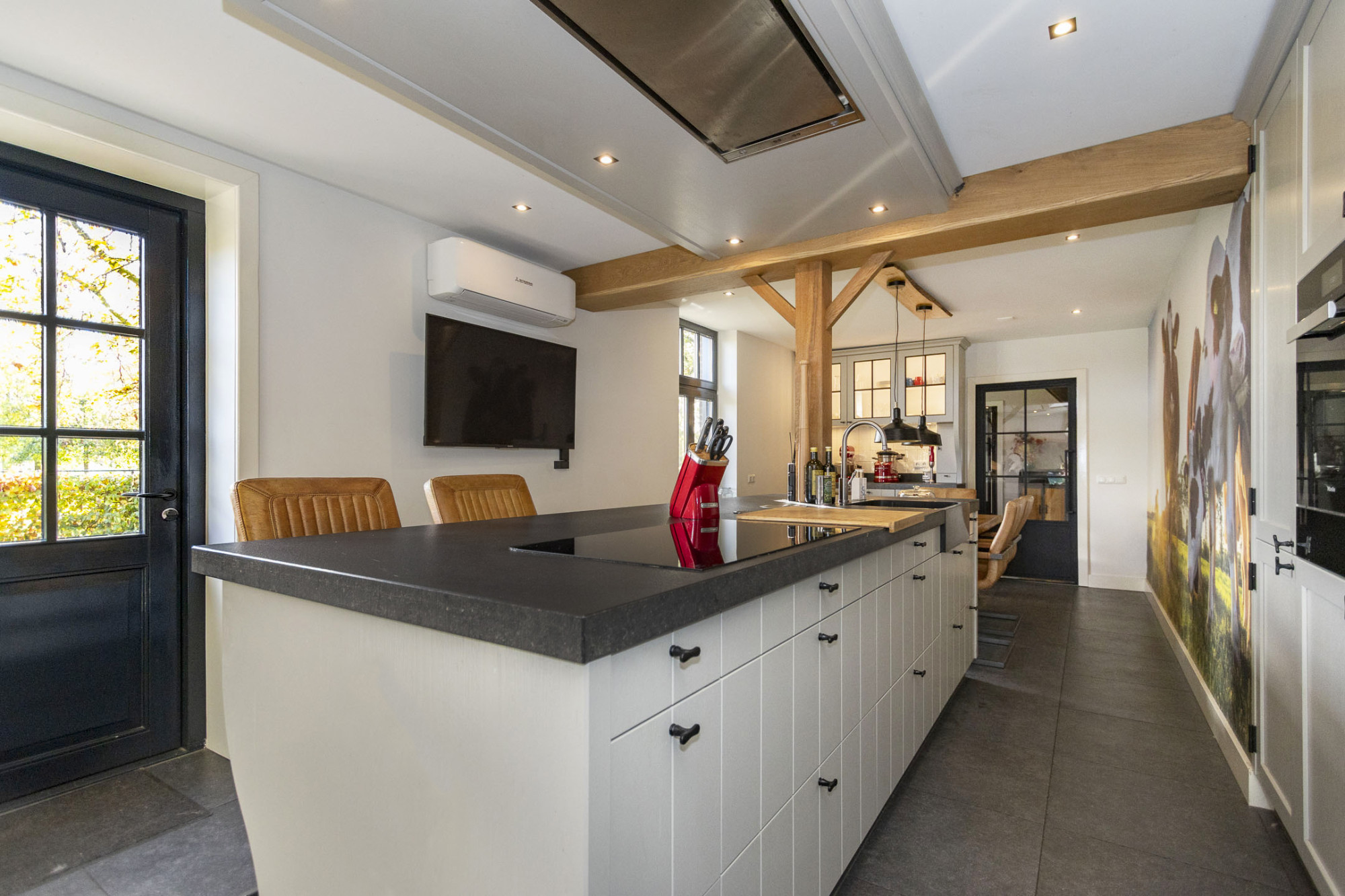 Via de ruime hal met karakteristieke trapopgang en stijlvolle tegelvloer zijn de verschillende leefruimtes bereikbaar. De woonkamer is sfeervol ingericht met een pelletkachel, grote raampartijen en een prachtig uitzicht over het vele groen rondom. De leefkeuken is een ware eyecatcher: v.v. een groot kookeiland, moderne inbouwapparatuur met o.a een Quooker, stoomoven, koffiemachine, extra grote koelkast met extra grote diepvries, vaatwasser, inductiekookplaat en een opvallende wanddecoratie met landelijke print.