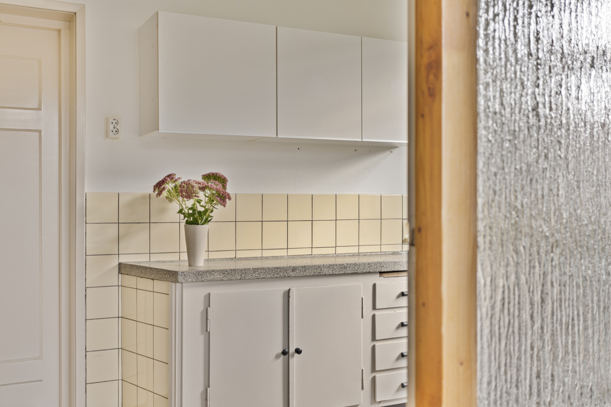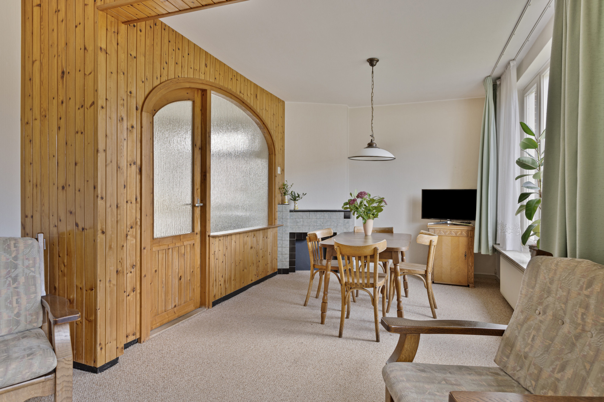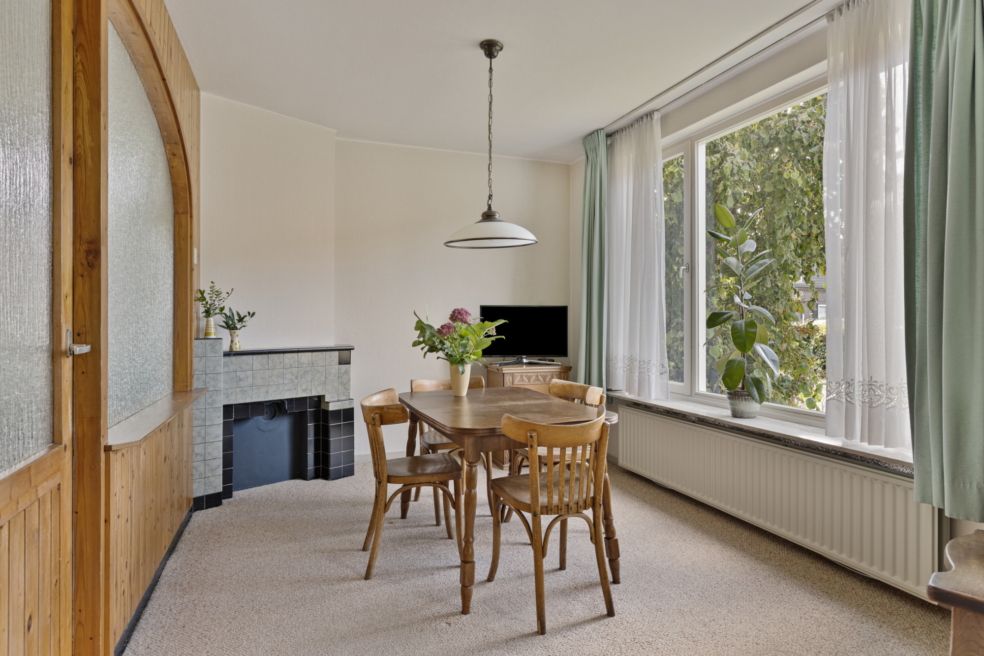 De woonkamer, gelegen aan de voorzijde van de woning, profiteert van een prachtige lichtinval door de grote ramen. Met een originele schouw en sfeervolle tegeltjes straalt deze ruimte warmte uit. De woonkamer (23 m²) biedt toegang tot de keuken, die nog steeds de originele houten keukenkastjes, een prachtige houten schouw en een terrazzo aanrechtblad bevat. In de keuken bevindt zich tevens een praktische boiler, en vanuit hier is er toegang tot de ruime provisiekelder en de bijkeuken.
