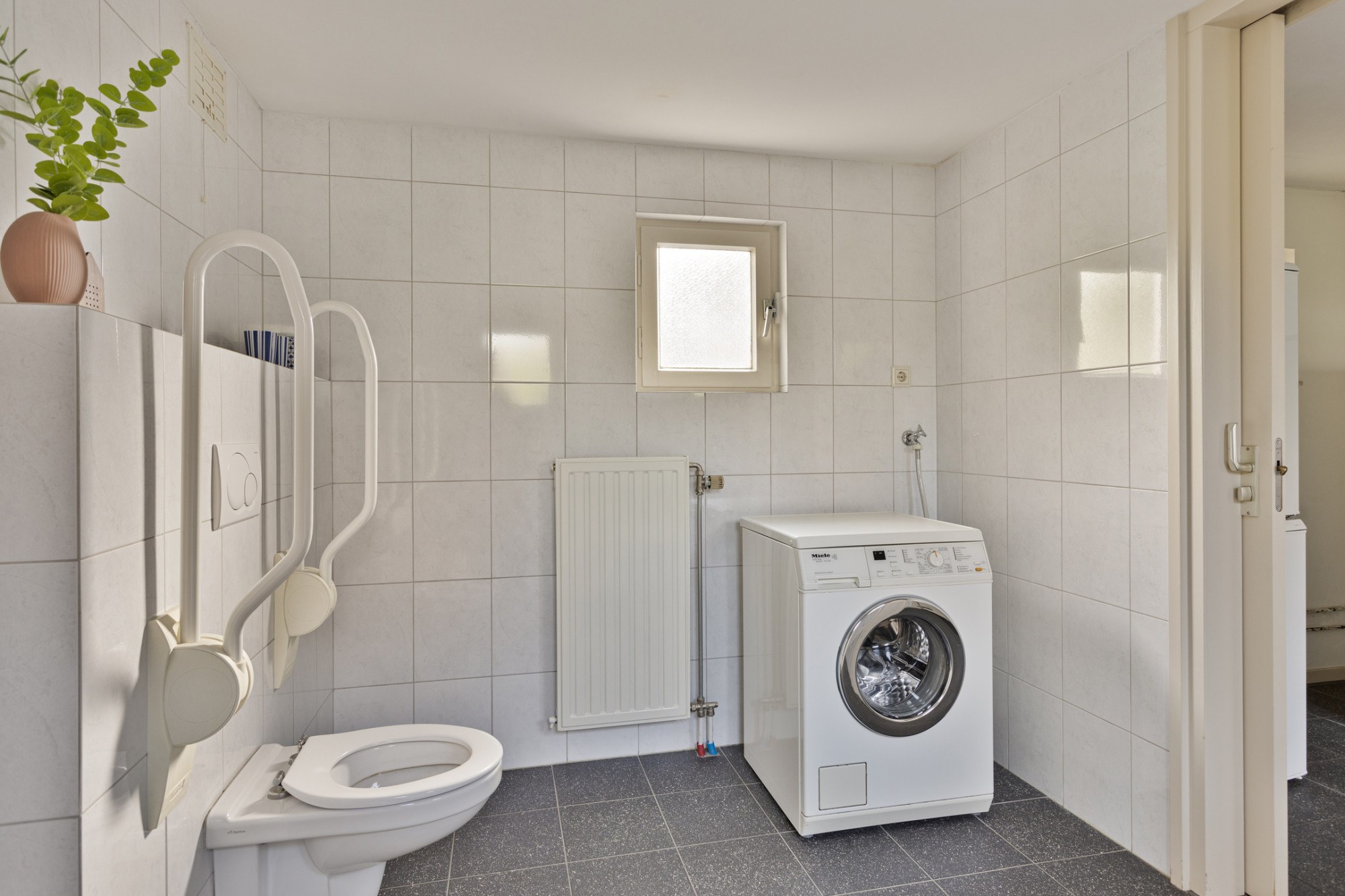 De bijkeuken is ideaal voor het plaatsen van witgoed en heeft een deur naar de achtertuin. Daarnaast leidt een schuifdeur naar de ruime, volledig betegelde badkamer met inloopdouche, toilet, wastafel, witgoedaansluiting en comfortabele vloerverwarming.