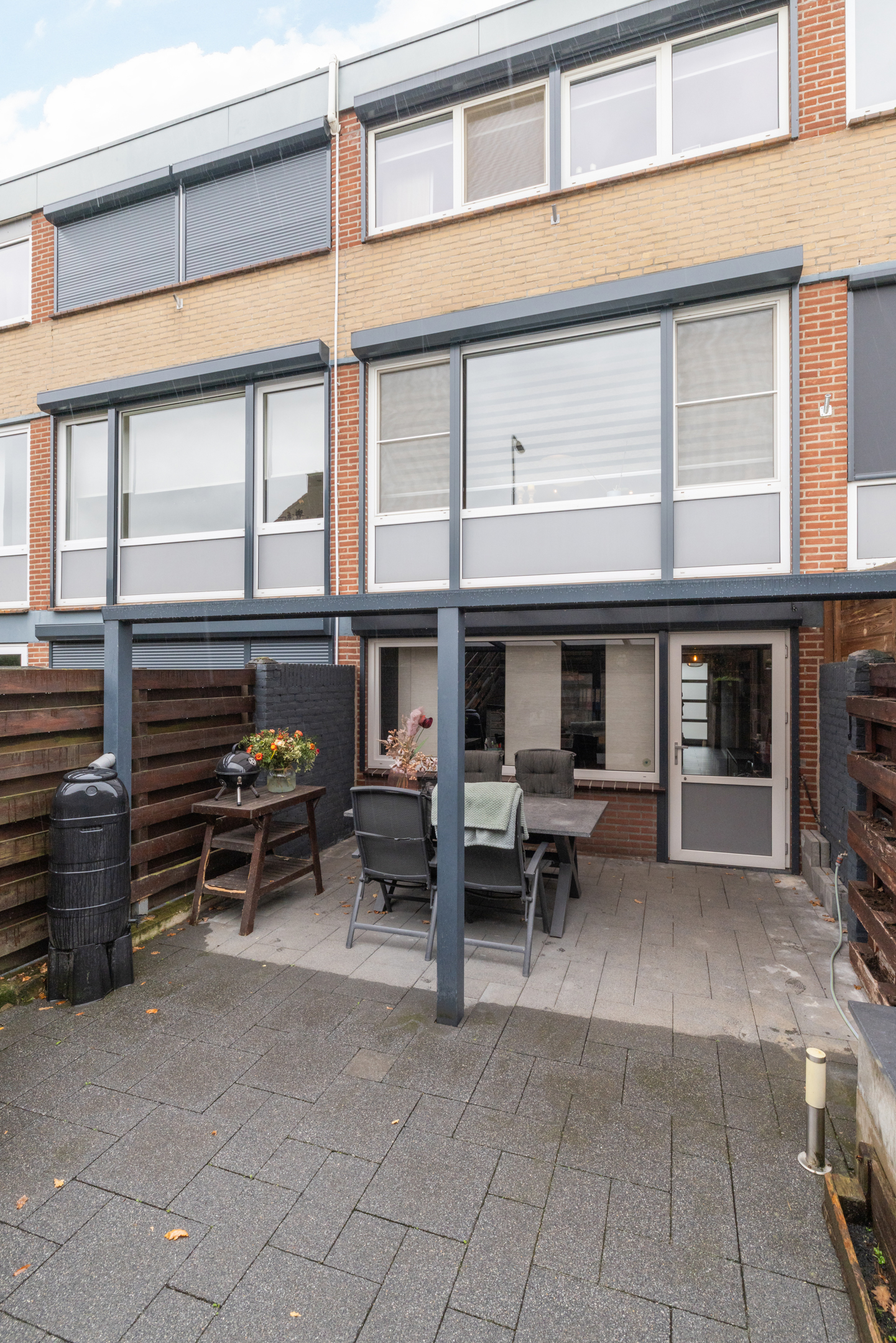 Onderhoudsvriendelijke tuin met overkapping.