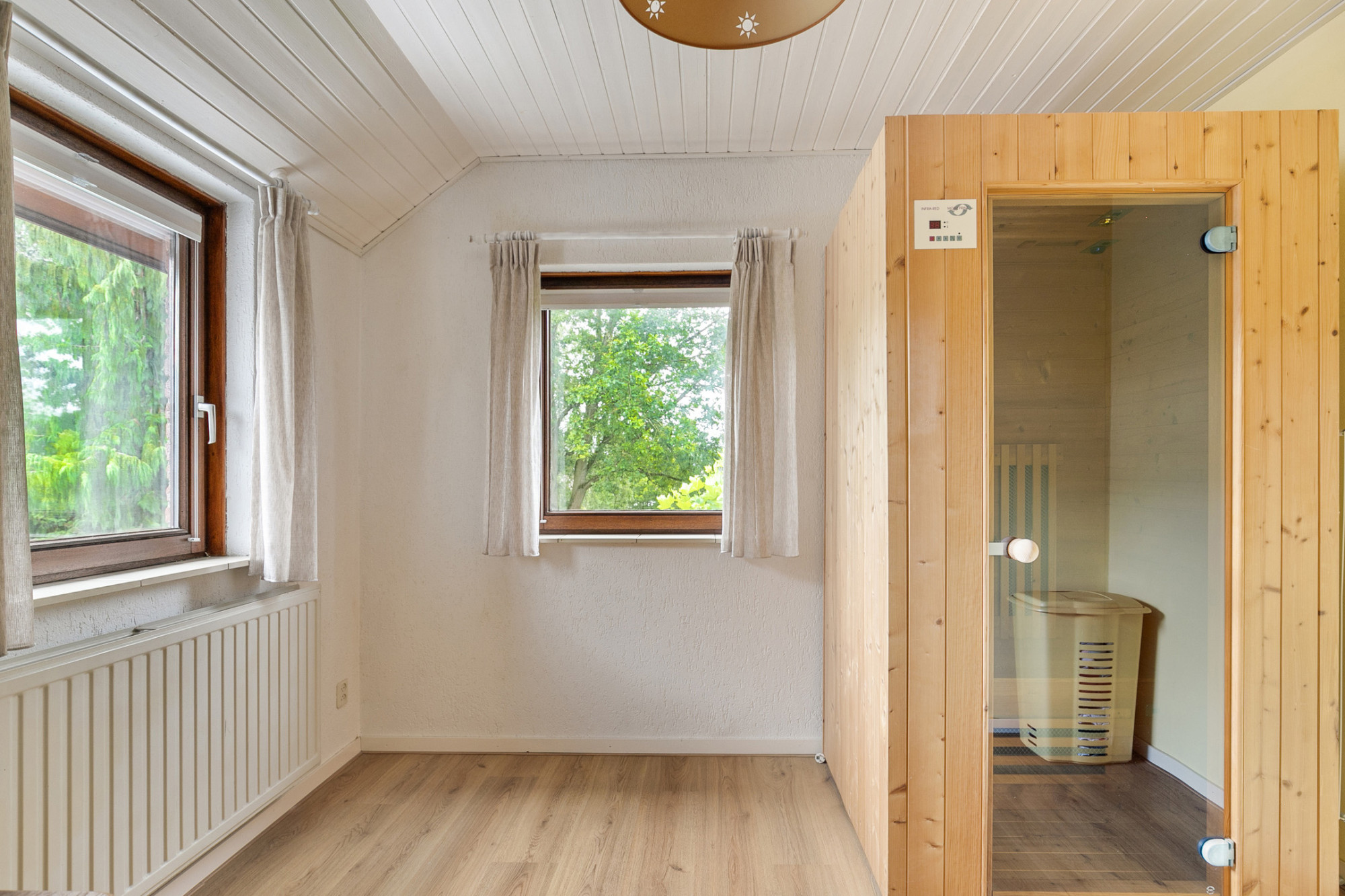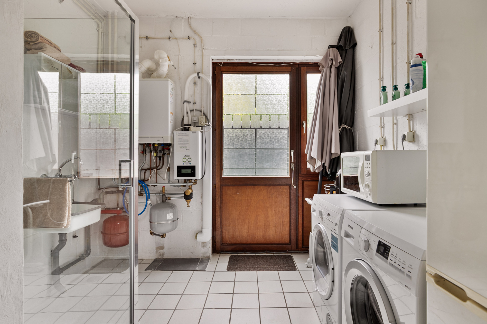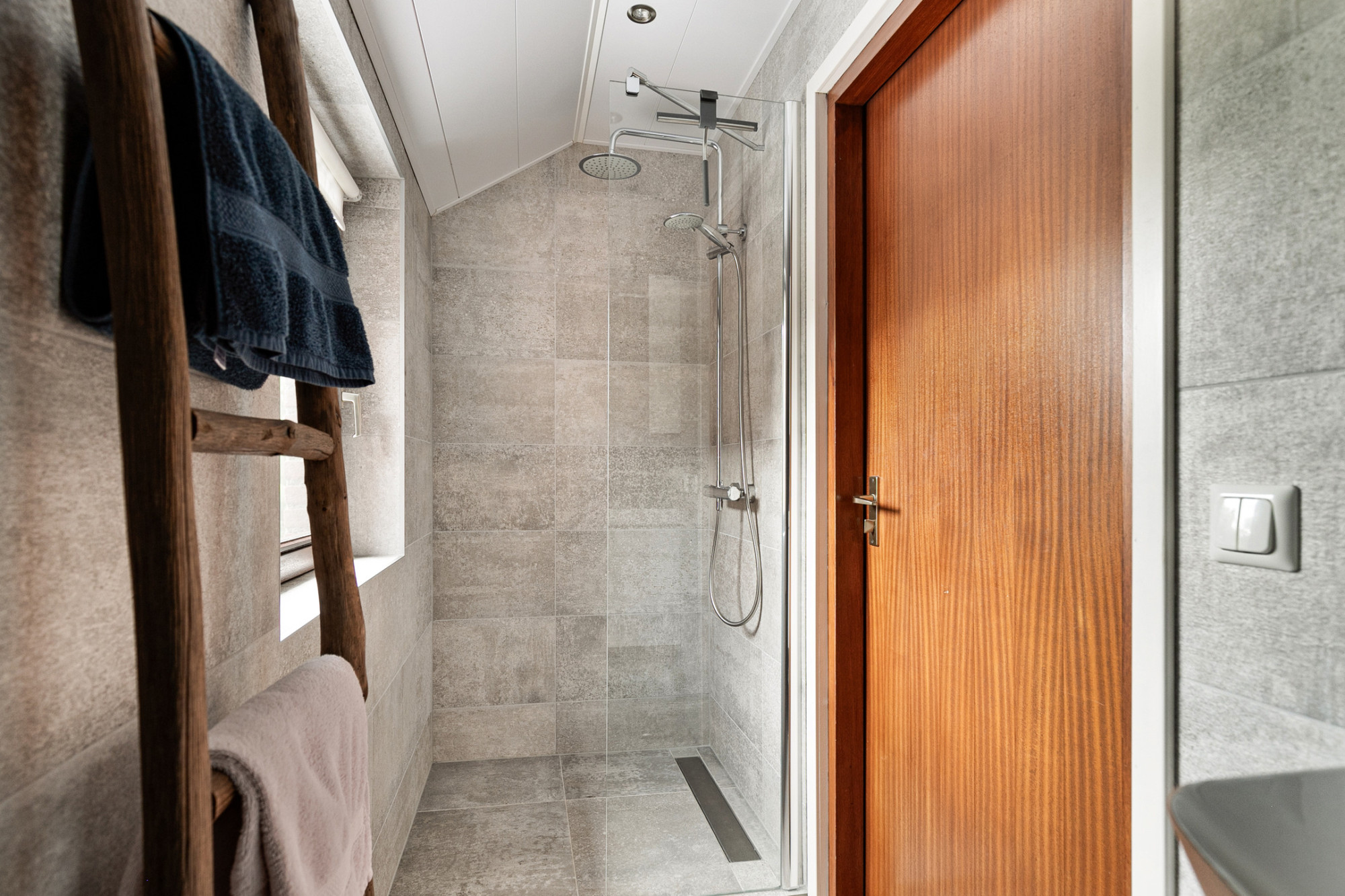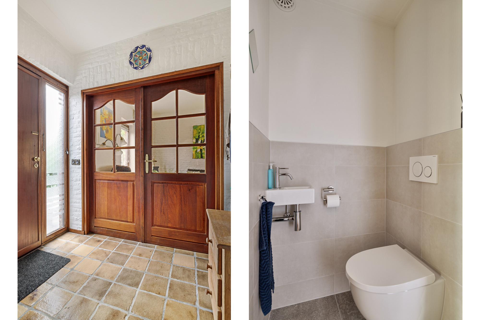 Hal met garderobe, moderne toiletruimte met hangcloset en fonteintje. Portaal met muurkast en meterkast en doorloop naar een inpandige berging en een wasruimte met aansluitpunten voor wasapparatuur, combi cv-ketel (Intergas HR, 2013, eigendom) en de binnen-unit van de hybride warmtepomp (Remeha, 2023, eigendom). Tevens bevindt zich hier een extra douchegelegenheid met elektrische wandverwarming.