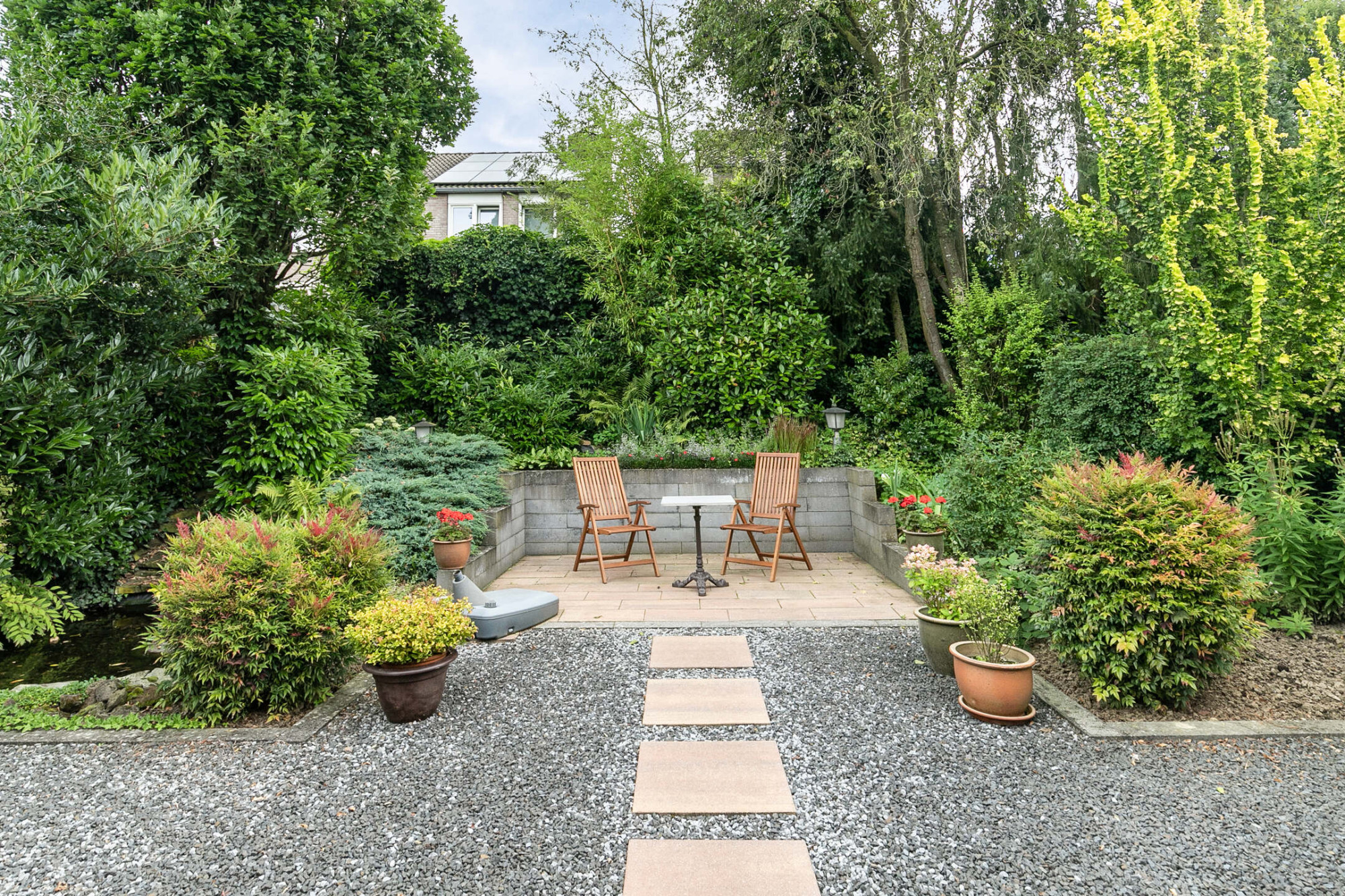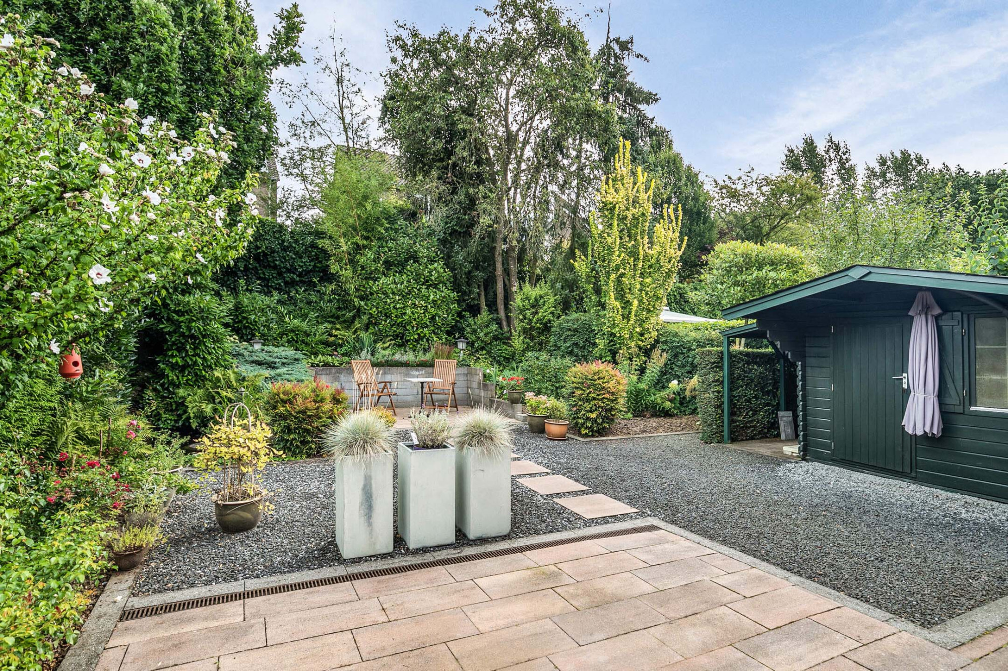 De tuin is prachtig verzorgd en aangelegd met terrassen, gevarieerde beplanting en een royaal tuinhuis. De tuin is zowel vanuit de waskeuken als via een schuifpui en/of loopdeur via de aangebouwde tuinkamer bereikbaar. Naast de woning is er een zij-ingang naar de achtertuin, afsluitbaar d.m.v. een hekwerk. Aan de voorzijde bevindt zich een fraai aangelegde voortuin met beplantingen evenals de oprit en een aluminium carport.