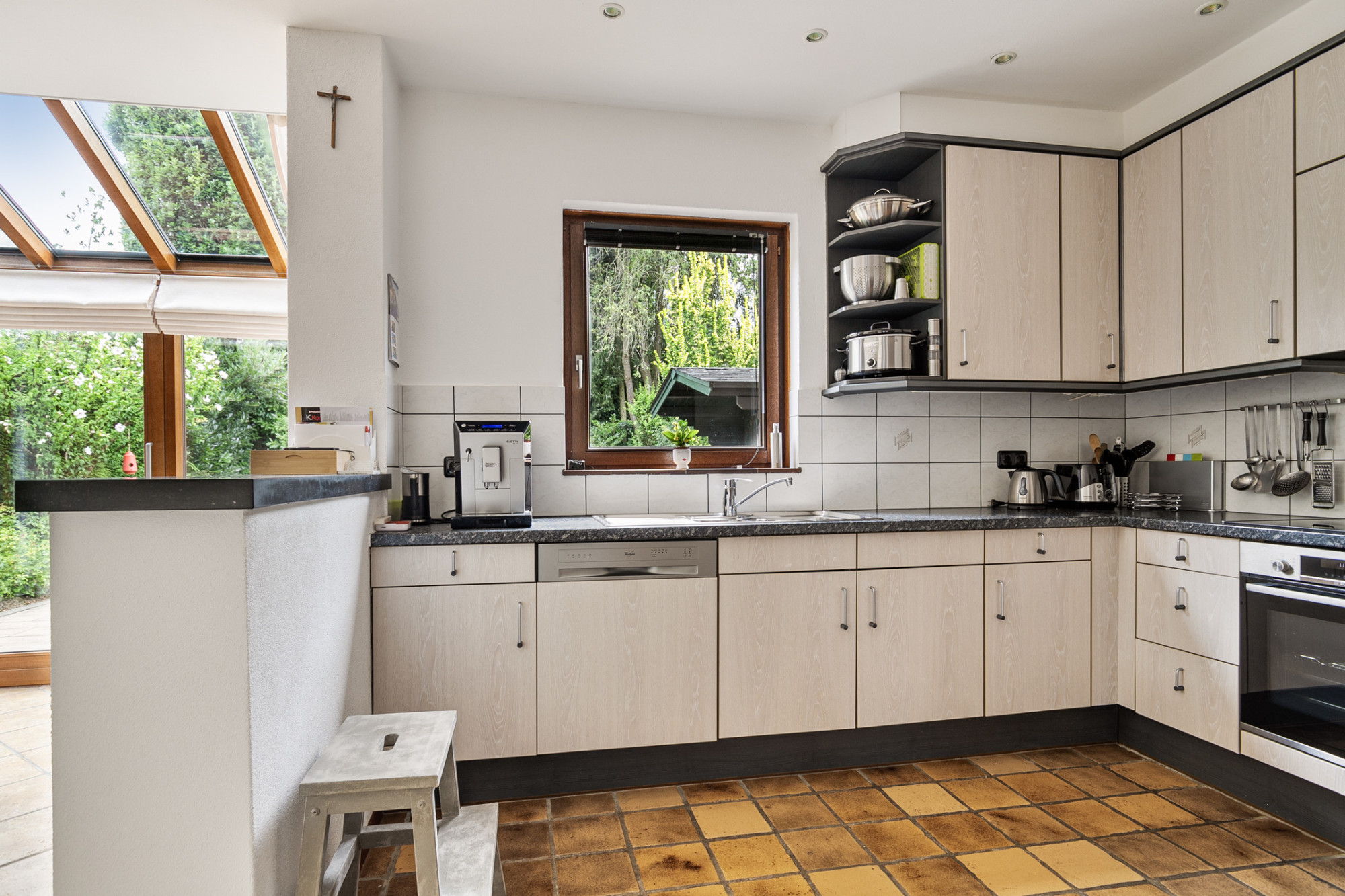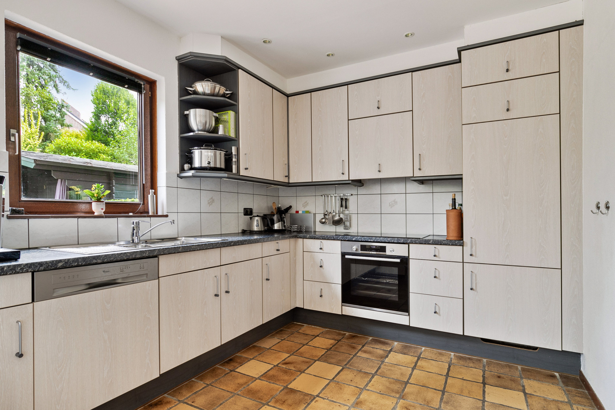 De halfopen keuken met diverse inbouwapparatuur (vaatwasser, koelkast, keramische kookplaat en oven) completeert de begane grond. De begane grond is, met uitzondering van de waskeuken/berging, geheel voorzien van vloerverwarming.