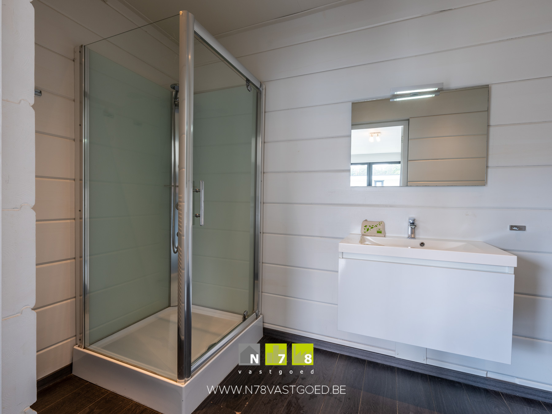 - Badkamer 2: badmeubel met enkele lavabo, onderkast, spiegel, douchecabine, hangtoilet, laminaat.