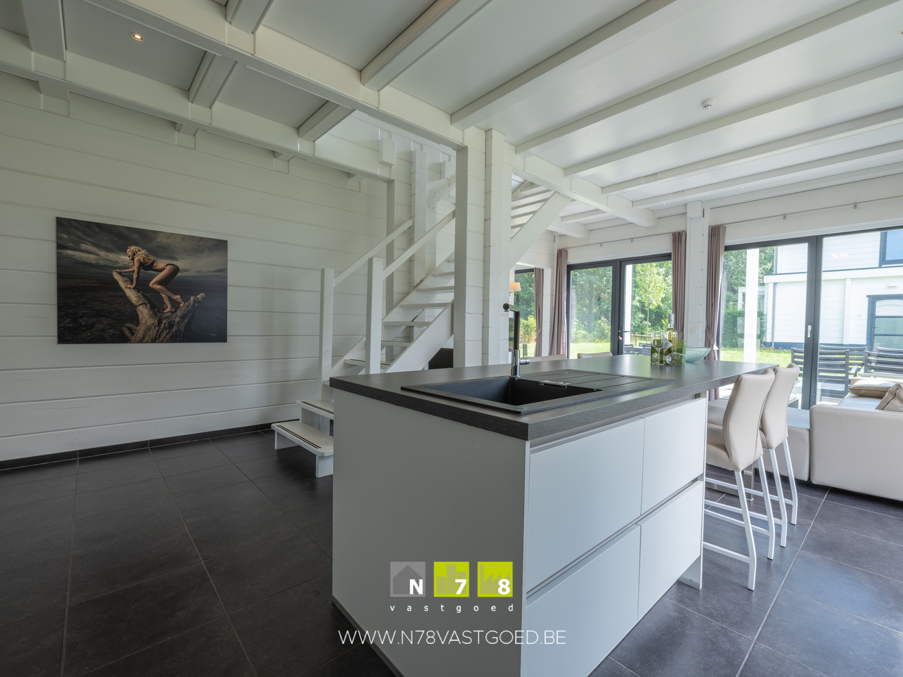 - Open keuken in woonkamer: geïnstalleerd met onder-bovenkasten, lades, inductieplaat, dampkap, combi-oven, koelkast, vaatwasser, ziteiland met spoelbak + lades, tegelvloer.