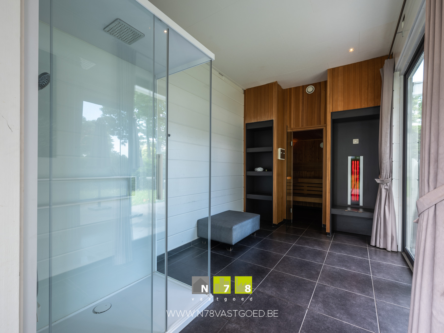 - Berging: wellnessruimte met douchecabine+sauna, tegelvloer.