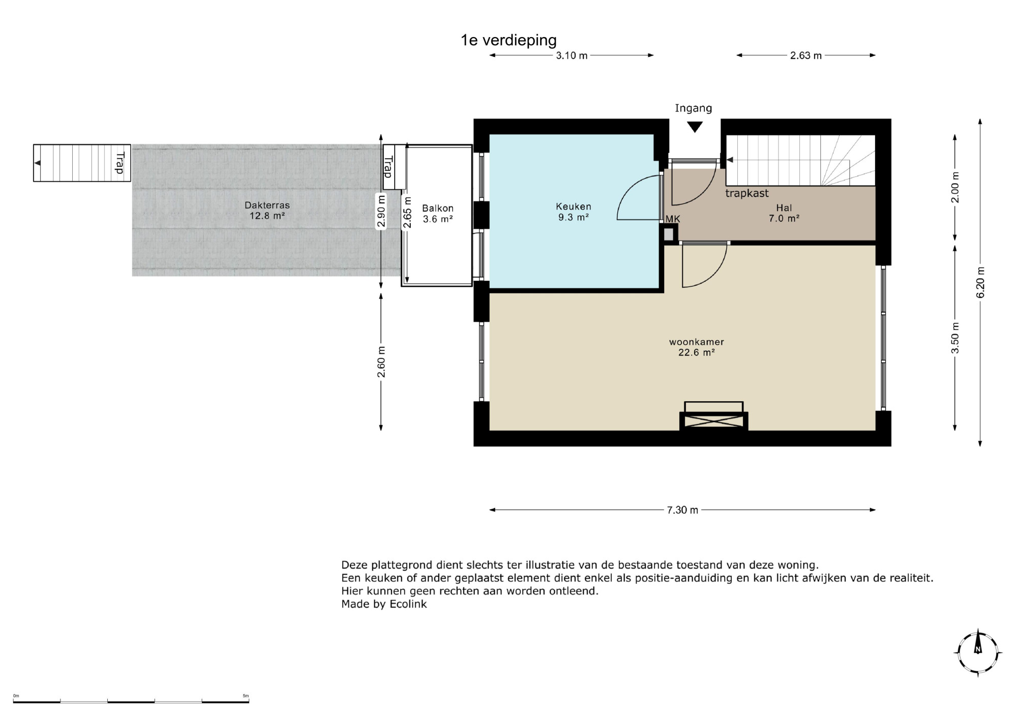 Toegangsdeur/entree, hal met moderne meterkast en toegang tot keuken, woonkamer, muurkast en opgang naar verdieping. Keuken (ca. 3.46m x 2.86m) is voorzien van een tegelvloer met 4-pits gaskookplaat, oven, koelvriescombinatie en geeft toegang naar het dakterras. Woonkamer (ca. 7.62m x 3.50m/2.60m) voorzien van sierhaard.