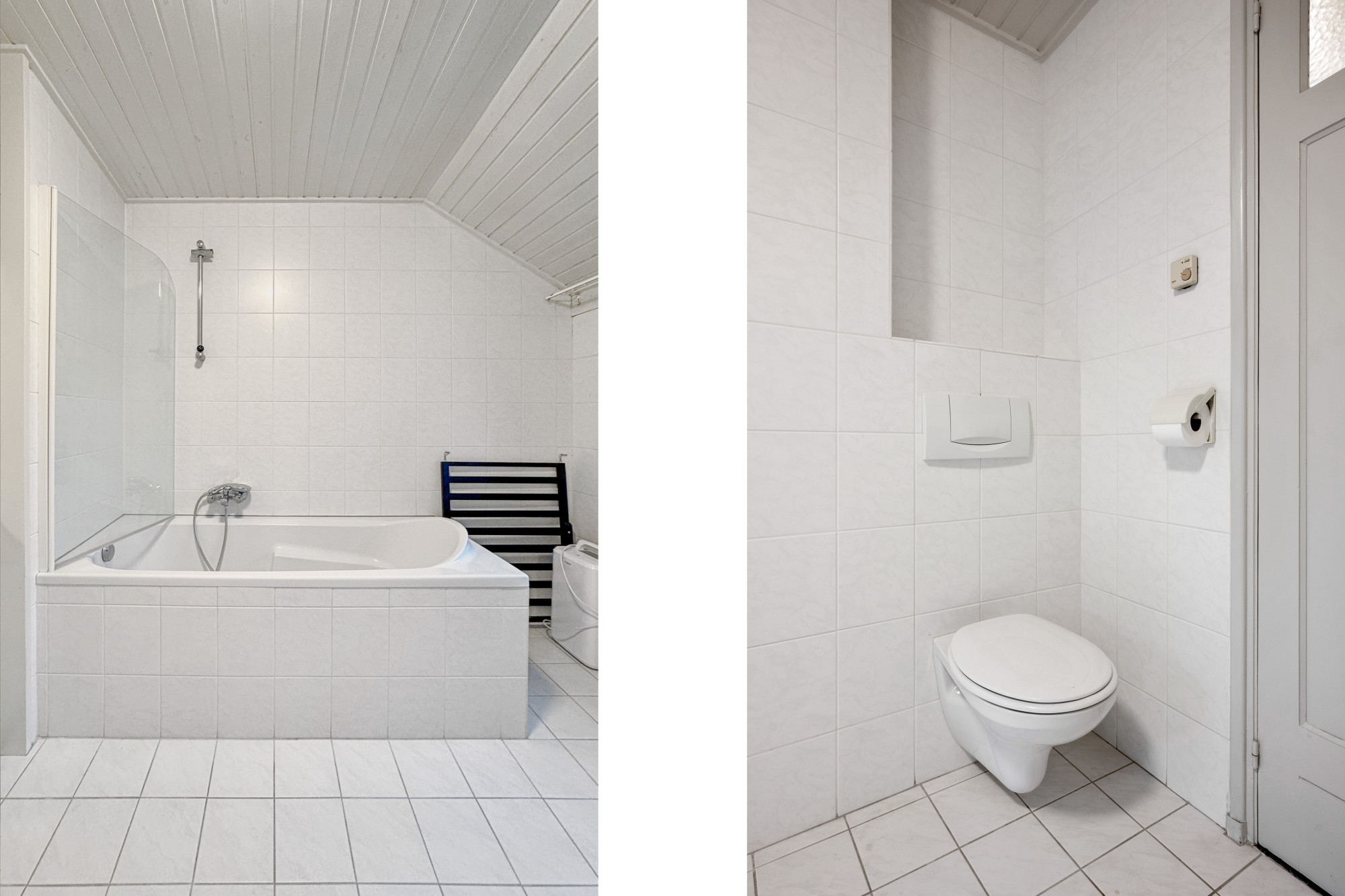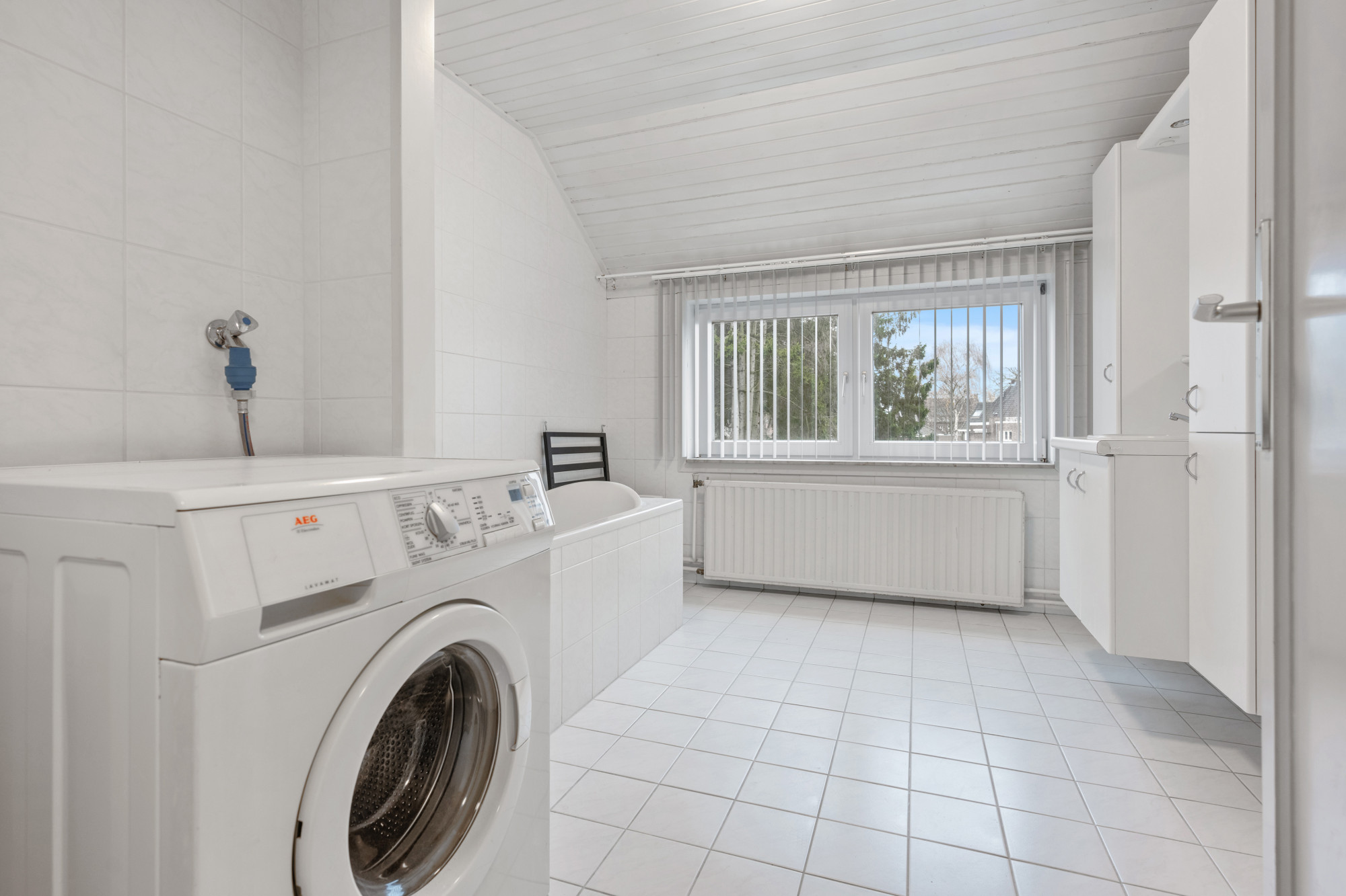 Badkamer (ca. 3.47m x 2.65m) volledig betegeld en voorzien van ligbad, zwevend closet, wastafelmeubel en de voorzieningen voor de wasapparatuur.