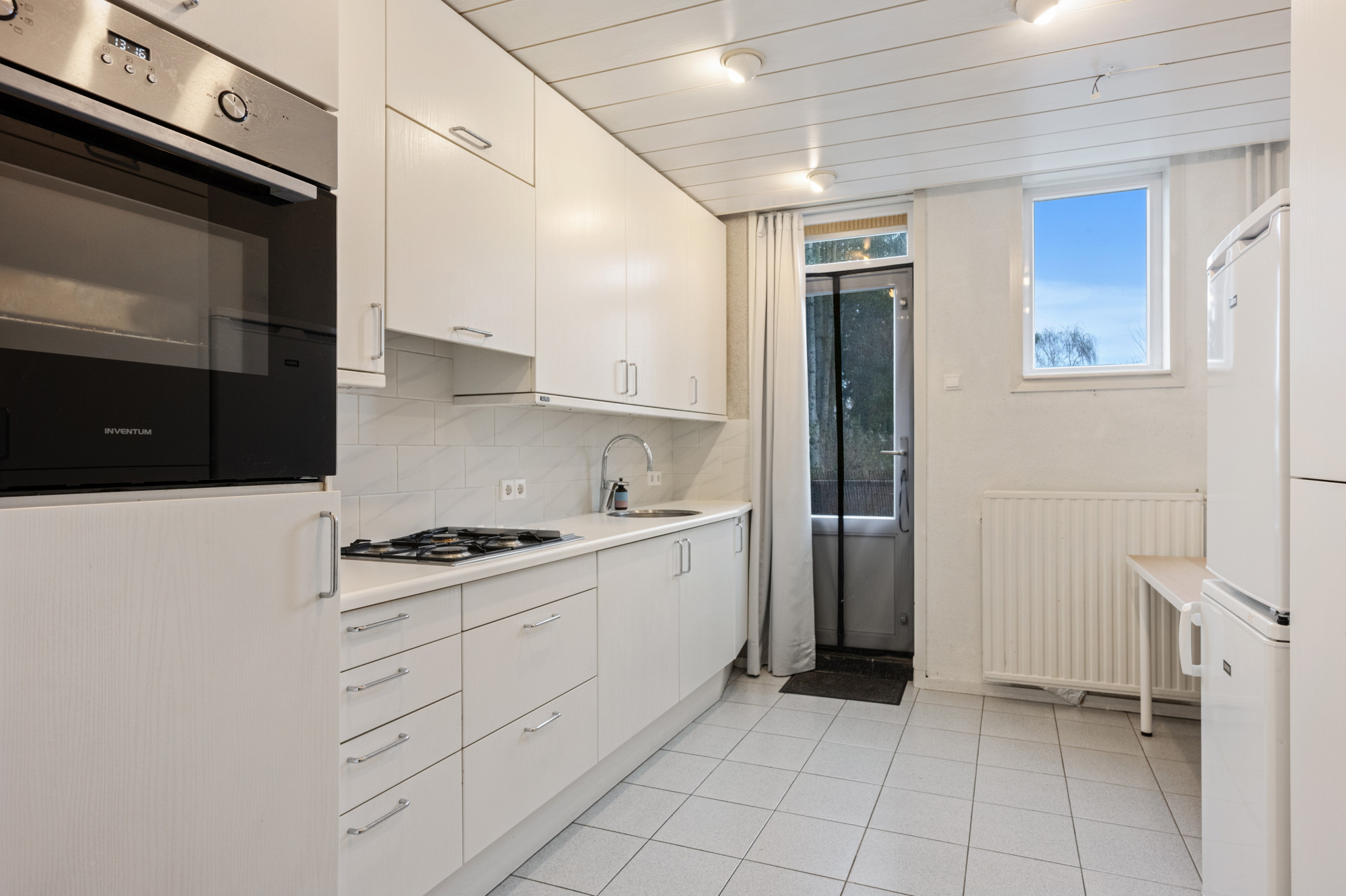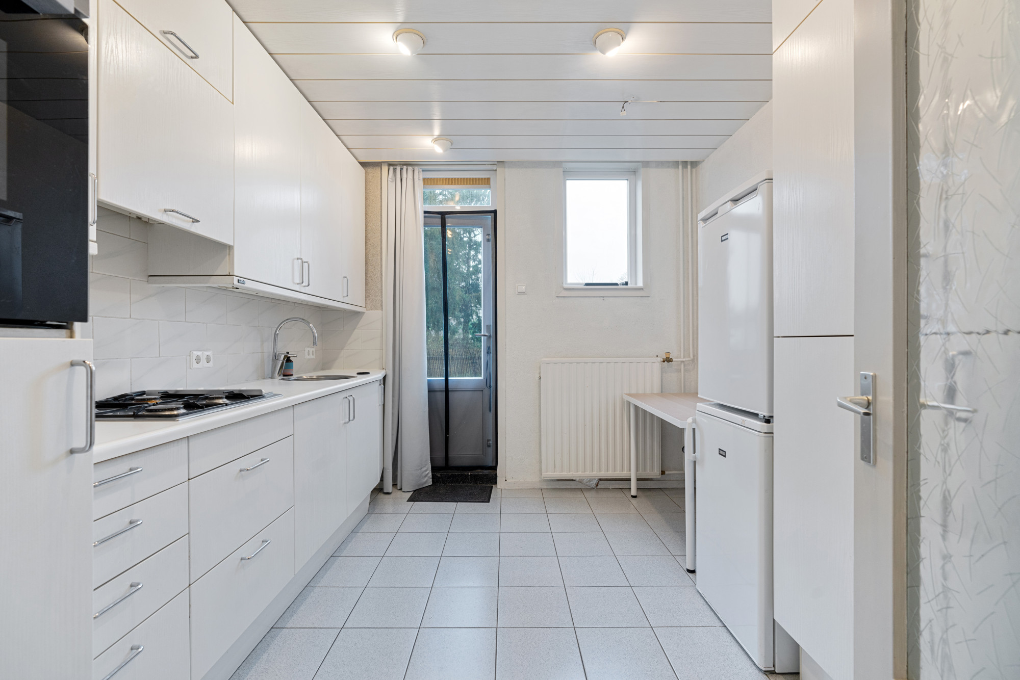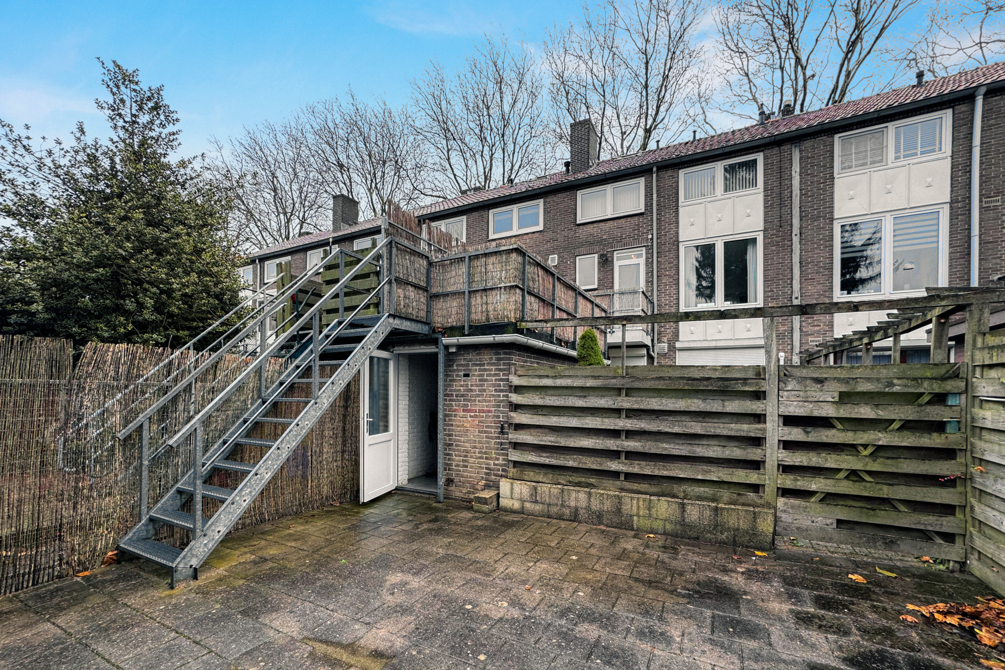 Betegelde tuin (45m2) met berging (ca. 2.80m x 1.90m) gelegen op het noordwesten en via achtergelegen pad met toegangspoort te bereiken alsook via het dakterras.