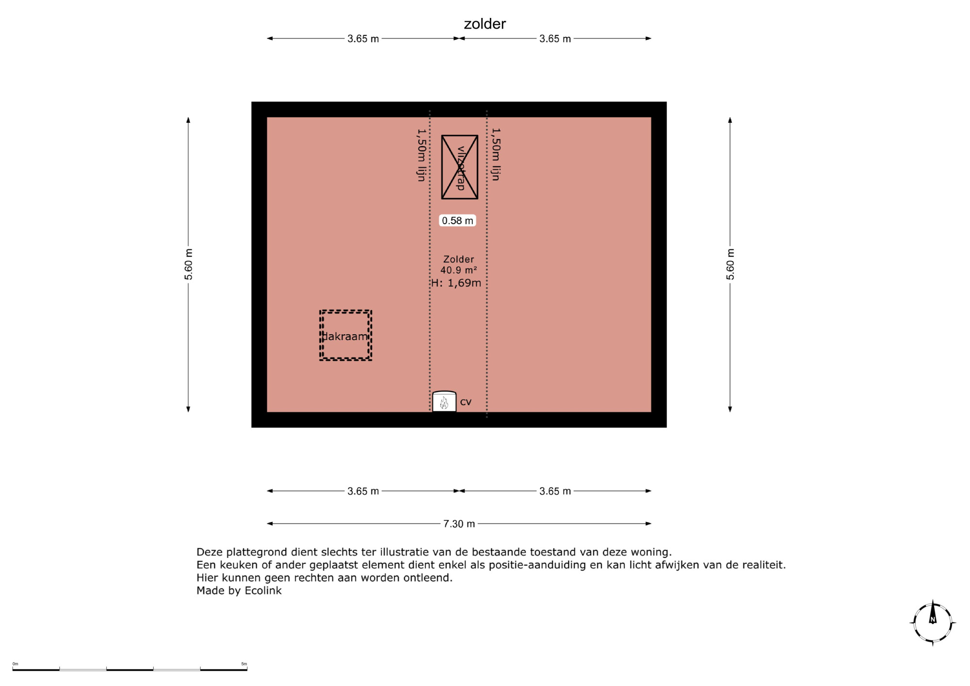 Bergzolder (ca. 22m2) bereikbaar via vlizotrap en tevens standplaats c.v.-ketel.