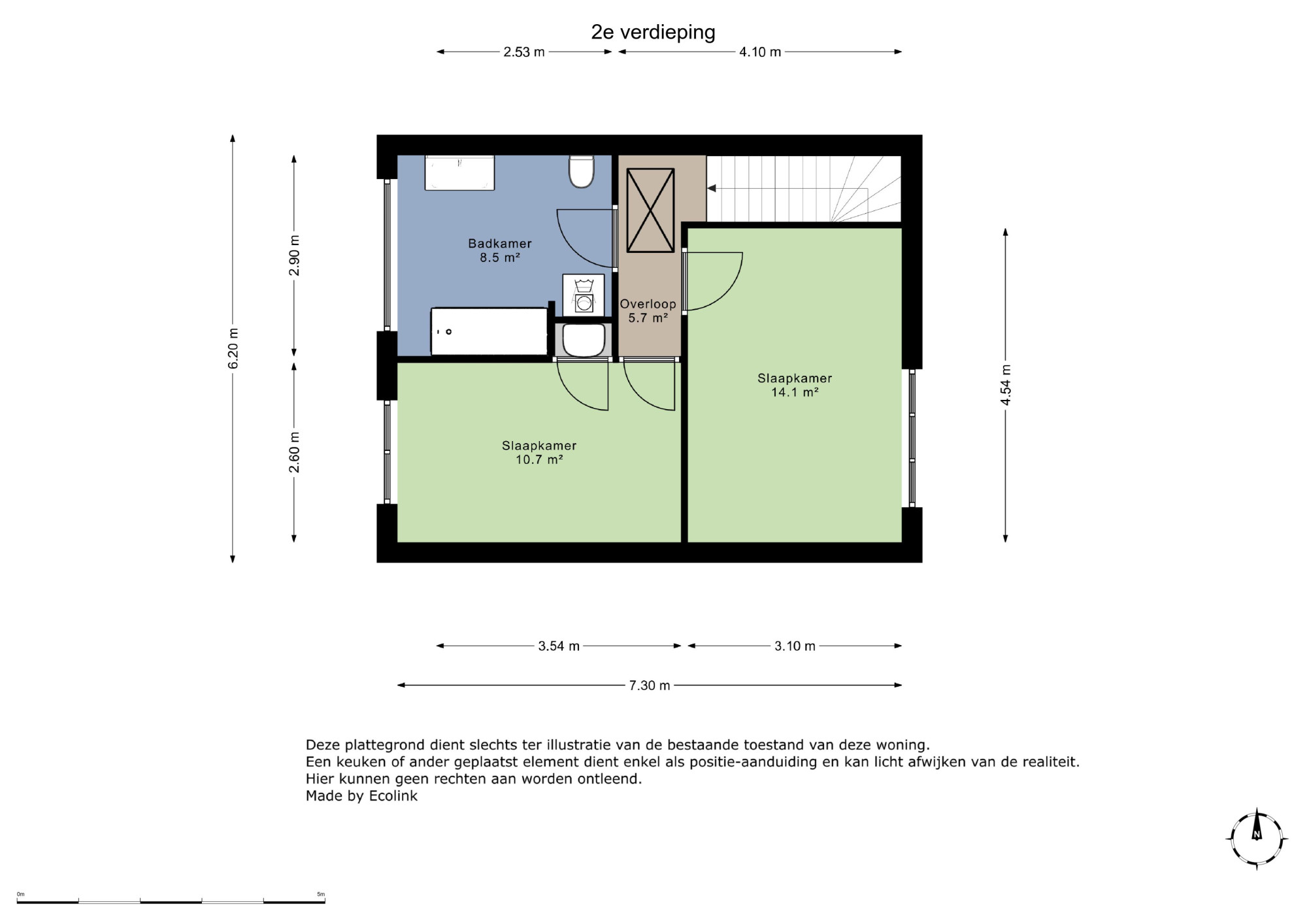 - Slaapkamer 2: ca. 4.46m x 2.58m voorzien van wastafel